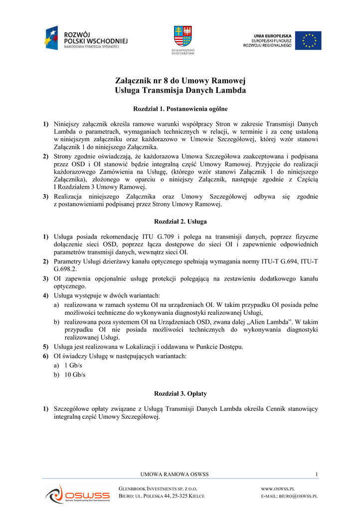 Załącznik nr 8 do Umowy Ramowej Usługa Transmisja Danych Lambda Rozdział 1. Postanowienia ogólne 1) Niniejszy załącznik określa ramowe warunki współpracy Stron w zakresie Transmisji Danych Lambda o parametrach, wymaganiach technicznych w relacji, w terminie i za cenę ustaloną w niniejszym załączniku oraz każdorazowo w Umowie Szczegółowej, której wzór stanowi Załącznik 1 do niniejszego Załącznika. 2) Strony zgodnie oświadczają, że każdorazowa Umowa Szczegółowa zaakceptowana i podpisana przez OSD i OI stanowić będzie integralną część Umowy Ramowej. Przyjęcie do realizacji każdorazowego Zamówienia na Usługę, (którego wzór stanowi Załącznik 1 do niniejszego Załącznika), złożonego w oparciu o niniejszy Załącznik, następuje zgodnie z Częścią I Rozdziałem 3 Umowy Ramowej. 3) Realizacja niniejszego Załącznika oraz Umowy Szczegółowej odbywa się zgodnie z postanowieniami podpisanej przez Strony Umowy Ramowej. Rozdział 2. Usługa 1) Usługa posiada rekomendację ITU G.709 i polega na transmisji danych, poprzez fizyczne dołączenie sieci OSD, poprzez łącza dostępowe do sieci OI i zapewnienie odpowiednich parametrów transmisji danych, wewnątrz sieci OI. 2) Parametry Usługi dzierżawy kanału optycznego spełniają wymagania normy ITU-T G.694, ITU-T G.698.2. 3) OI zapewnia opcjonalnie usługę protekcji polegającą na zestawieniu dodatkowego kanału optycznego. 4) Usługa występuje w dwóch wariantach: a) realizowana w ramach systemu OI na urządzeniach OI. W takim przypadku OI posiada pełne możliwości techniczne do wykonywania diagnostyki realizowanej Usługi, b) realizowana poza systemem OI na Urządzeniach OSD, zwana dalej „Alien Lambda”. W takim przypadku OI nie posiada możliwości technicznych do wykonywania diagnostyki realizowanej Usługi. 5) Usługa jest realizowana w Lokalizacji i oddawana w Punkcie Dostępu. 6) OI świadczy Usługę w następujących wariantach: a) 1 Gb/s b) 10 Gb/s Rozdział 3. Opłaty 1) Szczegółowe opłaty związane z Usługą Transmisji Danych Lambda określa Cennik stanowiący integralną część Umowy Szczegółowej. UMOWA RAMOWA OSWSS GLENBROOK INVESTMENTS SP. Z O.O. BIURO: UL. POLESKA 44, 25-325 KIELCE 1 www.OSWSS.PL E-MAIL: [email protected] Rozdział 4. Postanowienia końcowe 1) Integralną częścią niniejszego Załącznika są następujące załączniki: − Załącznik nr 1 – Zamówienie na Usługę Transmisji Danych Lambda/ Umowa Szczegółowa, − Załącznik nr 2 – Protokół zdawczo-odbiorczy. OSD OI ……………………………………… ………………………………………… (data i podpis) (data i podpis) UMOWA RAMOWA OSWSS GLENBROOK INVESTMENTS SP. Z O.O. BIURO: UL. POLESKA 44, 25-325 KIELCE 2 www.OSWSS.PL E-MAIL: [email protected] Załącznik nr 1 Zamówienie na Usługę Transmisji Danych Lambda / Umowa Szczegółowa Data: ……………………………………… Nr: …………………………………………. I. DANE ADRESOWE OSD: Nazwa Firmy: Adres: Telefon/fax: E-mail: II. PUNKTY STYKU: Punkt Styku A: Nazwa obiektu: Adres: Szafa/kontener/ pomieszczenie: Urządzenie/ODF: Interfejs: 1 GigaEthernet STM-1/OC3 STM-64/OC192 10 GigaEthernet STM-4/OC12 Inny: …………… STM-16/OC48 Ilość interfejsów: 1 2 ………….……… Numer portu ODF/IP/DWDM: Typ złącza: 850nm 1310nm 1550nm 10km 40km 70km 100km LC (PC) E2000/APC SC (PC) SC (APC) Inne …………………………………………………………………………………………… Inne: Punkt Styku B Nazwa obiektu: Adres: Szafa/kontener/ pomieszczenie: Urządzenie/ODF: Interfejs: 1 GigaEthernet STM-1/OC3 STM-64/OC192 10 GigaEthernet STM-4/OC12 Inny: …………… STM-16/OC48 Ilość interfejsów: 1 2 ………….……… Numer portu ODF/IP/DWDM: UMOWA RAMOWA OSWSS GLENBROOK INVESTMENTS SP. Z O.O. BIURO: UL. POLESKA 44, 25-325 KIELCE 3 www.OSWSS.PL E-MAIL: [email protected] Typ złącza: 850nm 1310nm 1550nm 10km 40km 70km 100km LC (PC) E2000/APC SC (PC) SC (APC) Inne ………………………………………………………………….………………………… Inne: III. IV. SPECYFIKACJA USŁUGI: Transmisja Danych Ethernet: Pasmo: Transmisja Danych DWDM: Pasmo: Transmisja Danych DWDM - lambda: Nr kanału DWDM/częstotliwość: WARIANT SLA: Standard (24h) V. Silver (12h) Gold (8h) TERMIN URUCHOMIENIA I DŁUGOŚĆ TRWANIA USŁUGI: Okres obowiązywania usługi: Planowany termin uruchomienia usługi: VI. OPŁATY: Opłaty: Wysokość opłaty netto [PLN] Jednorazowa: Miesięczna opłata abonentowa: VII. PODPISY STRON: OSD OI …………………………………………………………….…. ………………………………….……………………………. (imię i nazwisko, data) (imię i nazwisko, data) UMOWA RAMOWA OSWSS GLENBROOK INVESTMENTS SP. Z O.O. BIURO: UL. POLESKA 44, 25-325 KIELCE 4 www.OSWSS.PL E-MAIL: [email protected] Załącznik nr 2 Protokół zdawczo-odbiorczy Usługa Transmisja Danych Lambda Data: ……………………………………… Nr: …………………………………………. I. DANE ADRESOWE: OSD OI Nazwa Firmy: Nazwa Firmy: Glenbrook Investments Sp. z o.o. ul. Rzymowskiego 53 02-697 Warszawa II. Adres: Adres: Telefon/fax: Telefon/fax: E-mail: E-mail: [email protected] PARAMETRY USŁUGI: Przepustowość łącza: Nr kanału DWDM / częstotliwość: Termin przekazania usługi: ID Usługi: III. PUNKTY ZAKOŃCZENIA: Punkt Styku A: Nazwa obiektu: Adres: Szafa/kontener/ pomieszczenie: Urządzenie/ODF: Interfejs: 1 GigaEthernet STM-1/OC3 STM-64/OC192 10 GigaEthernet STM-4/OC12 Inny: …………… STM-16/OC48 Ilość interfejsów: 1 2 …………..…… Numer portu ODF/IP/DWDM: Typ złącza: 850nm 1310nm 1550nm 10km 40km 70km 100km LC (PC) E2000/APC SC (PC) SC (APC) Inne ……………………………………………………………………………………… Inne: UMOWA RAMOWA OSWSS GLENBROOK INVESTME