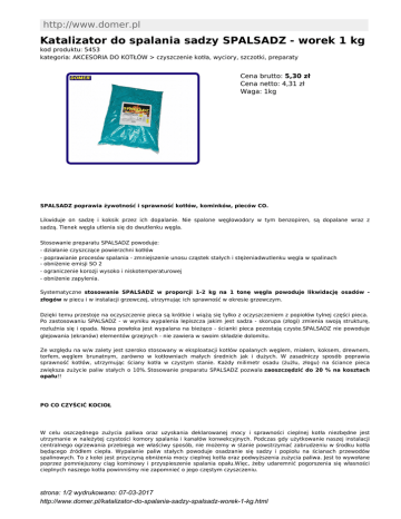 http://www.domer.pl Katalizator do spalania sadzy SPALSADZ - worek 1 kg kod produktu: 5453 kategoria: AKCESORIA DO KOTŁÓW > czyszczenie kotła, wyciory, szczotki, preparaty Cena brutto: 5,30 zł Cena netto: 4,31 zł Waga: 1kg SPALSADZ poprawia żywotność i sprawność kotłów, kominków, pieców CO. Likwiduje on sadzę i koksik przez ich dopalanie. Nie spalone węglowodory w tym benzopiren, są dopalane wraz z sadzą. Tlenek węgla utlenia się do dwutlenku węgla. Stosowanie preparatu SPALSADZ powoduje: - działanie czyszczące powierzchni kotłów - poprawianie procesów spalania - zmniejszenie unosu cząstek stałych i stężeniadwutlenku węgla w spalinach obniżenie emisji SO 2 ograniczenie korozji wysoko i niskotemperaturowej obniżenie zapylenia. Systematyczne stosowanie SPALSADZ w proporcji 1-2 kg na 1 tonę węgla powoduje likwidację osadów złogów w piecu i w instalacji grzewczej, utrzymując ich sprawność w okresie grzewczym. Dzięki temu przestoje na oczyszczenie pieca są krótkie i wiążą się tylko z oczyszczeniem z popiołów tylnej części pieca. Po zastosowaniu SPALSADZ - w wyniku wypalenia lepiszcza jakim jest sadza - skorupa (złogi) zmienia swoją strukturę, rozluźnia się i opada. Nowa powłoka jest wypalana na bieżąco - ścianki pieca pozostają czyste.SPALSADZ nie powoduje glejowania (ekranów) elementów grzejnych - nie zawiera w swoim składzie dolomitu. Ze względu na w/w zalety jest szeroko stosowany w eksploatacji kotłów opalanych węglem, miałem, koksem, drewnem, torfem, węglem brunatnym, zarówno w kotłowniach małych średnich jak i dużych. W zasadniczy sposób poprawia sprawność kotłów, utrzymując ściany kotła w czystym stanie. Każdy milimetr osadu (żużlu, złogu) na ściance pieca zwiększa zużycie paliw stałych o 10%. Stosowanie preparatu SPALSADZ pozwala zaoszczędzić do 20 % na kosztach opału!! PO CO CZYŚCIĆ KOCIOŁ W celu oszczędnego zużycia paliwa oraz uzyskania deklarowanej mocy i sprawności cieplnej kotła niezbędne jest utrzymanie w należytej czystości komory spalania i kanałów konwekcyjnych. Podczas gdy użytkowanie naszej instalacji centralnego ogrzewania przebiega we właściwy sposób, nie możemy w stanie powstrzymać zabrudzeniu w środku kotła będącego źródłem ciepła. Wypalanie paliw stałych powoduje osadzanie się sadzy i popiołu na ścianach przewodów spalinowych. To z kolei jest przyczyną obniżenia mocy cieplnej kotła oraz podwyższenia zużycia paliwa. Jest to wywołane poprzez pomniejszony ciąg kominowy i przyspieszenie spalania opału.Więc, żeby udaremnić pogorszenia się własności cieplnych naszego kotła powinniśmy nie zapomnieć o jego częstym czyszczeniu. strona: 1/2 wydrukowano: 07-03-2017 http://www.domer.pl/katalizator-do-spalania-sadzy-spalsadz-worek-1-kg.html W komorze paleniskowej kotła szczególną uwagę należy zwrócić na okresowe oczyszczanie mikroszczelin w płycie paleniska automatycznego. Czyszczenia kanałów konwekcyjnych, w których osiadają lotne popioły należy dokonywać systematycznie, co 3÷7 dni, a w szczególności przy użytkowaniu kotła w trybie „paleniska tradycyjnego". Znaczącą kwestią jest częstotliwość przeprowadzania czyszczenia kotła c.o. W przypadku, gdy palonym przez nas paliwem jest węgiel albo odpowiednie gatunkowo drewno, powinno wystarczyć czyszczenie raz na parę tygodni. Natomiast gdy spalamy koks to powinniśmy przeprowadzać to wyraźnie częściej - raz na 7 do 10 dni. Natomiast raz na parę lat powinno się przeczyścić kocioł z tzw. kamienia. Do tego stosujemy specjalne roztwory rozpuszczające osad (np. wodny roztwór kwasu chlorowodorowego). Do czyszczenia służą narzędzia, w które wyposażony jest kocioł. Czyszczenie kanałów konwekcyjnych kotła umożliwiają drzwiczki wyczystne przednie oraz drzwiczki rozpalno-zasypowe. Dodatkowo należy dokonywać okresowego oczyszczania znajdującej się w tylnej części kotła komory powietrznej, w której gromadzi się pył spadający z płyty paleniska automatycznego. Czyszczenia takiego dokonuje się poprzez wyczystkę boczną. Do porządkowania kotłów na paliwa stałe stosujemy druciane szczotki lub pogrzebacze. Duże kotły mozna porządkować sprężonym powietrzem. Czyszczenieprzeprowadza się przez otwory wyczystne kotła, pamiętając o tym, żeby przepustnica spalin w czopuchu była otwarta. Kotły mogą mieć bogatą liczebność tych otworów i rozmaicie je zlokalizowane (u góry, z boku lub z tyłu). Pozostały popiół sprzątamy przez wyczystkę w dolnej części kotła z pomocą wygarniacza. Po ukończeniu pracy musimy pamiętać o tym, żeby hermetycznie zamknąć wszelkie otwory wyczystne. Istotnym również dla prawidłowej eksploatacji kotła jest czyszczenie przewodu kominowego. Po zakończeniu sezonu grzewczego lub w innych przypadkach planowanego wyłączenia kotła należy doprowadzić do wypalenia się zasypanej porcji paliwa. Po wygaszeniu kotła i ostudzeniu należy usunąć z paleniska wszystkie pozostałości po spalonym paliwie i dokonać czyszczenia oraz konserwacji całego kotła. Należy dokonać konserwacji (poprzez przesmarowanie olejem) wewnętrznych przegród komory paleniskowej oraz wszystkich elementów ruchomych. Na okres przerwy w funkcjonowaniu kotła w szczególności zabezpieczyć należy mechanizm podający paliwo do komory paleniskowej poprzez przesmarowanie poziomych prowadnic. strona: 2/2 wydrukowano: 07-03-2017 http://www.domer.pl/katalizator-do-spalania-sadzy-spalsadz-worek-1-kg.html