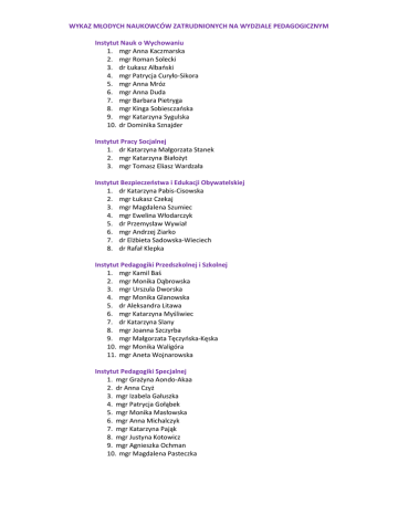 WYKAZ MŁODYCH NAUKOWCÓW ZATRUDNIONYCH NA WYDZIALE PEDAGOGICZNYM Instytut Nauk o Wychowaniu 1. mgr Anna Kaczmarska 2. mgr Roman Solecki 3. dr Łukasz Albański 4. mgr Patrycja Curyło-Sikora 5. mgr Anna Mróz 6. mgr Anna Duda 7. mgr Barbara Pietryga 8. mgr Kinga Sobiesczańska 9. mgr Katarzyna Sygulska 10. dr Dominika Sznajder Instytut Pracy Socjalnej 1. dr Katarzyna Małgorzata Stanek 2. mgr Katarzyna Białożyt 3. mgr Tomasz Eliasz Wardzała Instytut Bezpieczeństwa i Edukacji Obywatelskiej 1. dr Katarzyna Pabis-Cisowska 2. mgr Łukasz Czekaj 3. mgr Magdalena Szumiec 4. mgr Ewelina Włodarczyk 5. dr Przemysław Wywiał 6. mgr Andrzej Ziarko 7. dr Elżbieta Sadowska-Wieciech 8. dr Rafał Klepka Instytut Pedagogiki Przedszkolnej i Szkolnej 1. mgr Kamil Baś 2. mgr Monika Dąbrowska 3. mgr Urszula Dworska 4. mgr Monika Glanowska 5. dr Aleksandra Litawa 6. mgr Katarzyna Myśliwiec 7. dr Katarzyna Slany 8. mgr Joanna Szczyrba 9. mgr Małgorzata Tęczyńska-Kęska 10. mgr Monika Waligóra 11. mgr Aneta Wojnarowska Instytut Pedagogiki Specjalnej 1. mgr Grażyna Aondo-Akaa 2. dr Anna Czyż 3. mgr Izabela Gałuszka 4. mgr Patrycja Gołąbek 5. mgr Monika Masłowska 6. mgr Anna Michalczyk 7. mgr Katarzyna Pająk 8. mgr Justyna Kotowicz 9. mgr Agnieszka Ochman 10. mgr Magdalena Pasteczka Katedra Psychologii 1. 2. 3. 4. 5. 6. 7. 8. dr Karolina Czernecka dr Joanna Fryt dr Michał Gacek dr Joanna Ganczarek dr Aleksandra Gronostaj-Miara dr Julia Kaleńska-Rodzaj dr Karolina Pietras dr Tomasz Smoleń