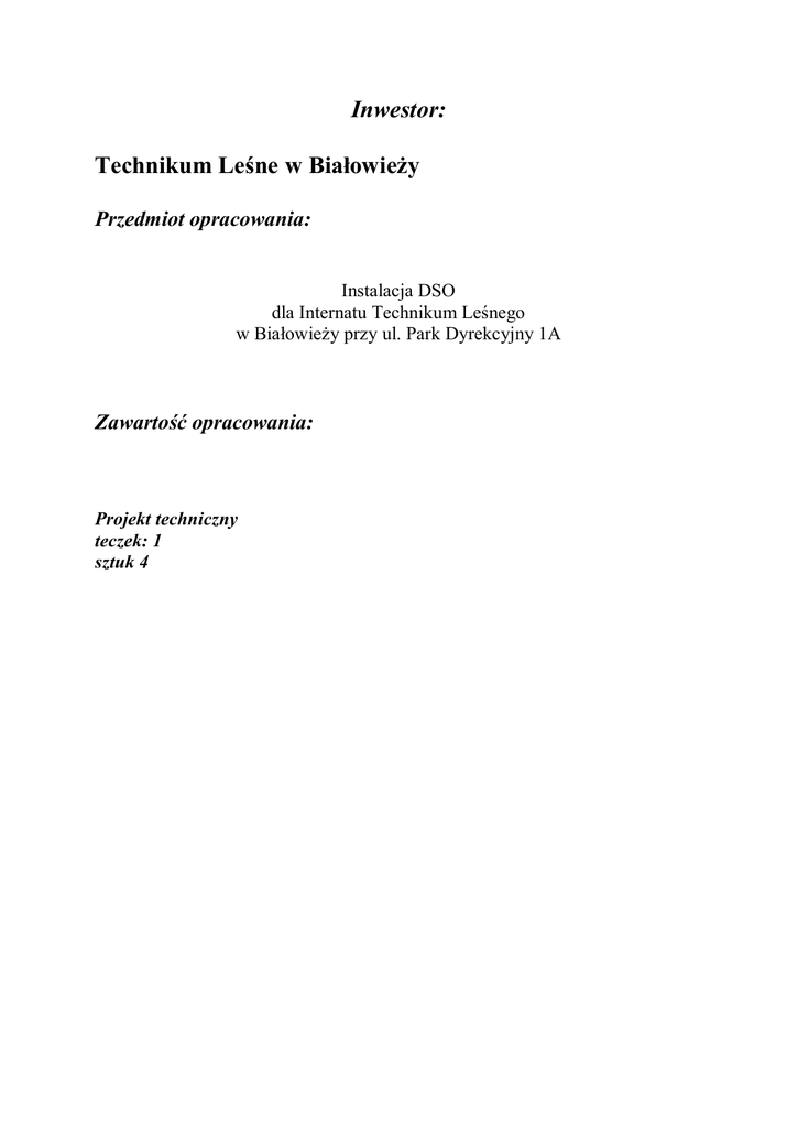 Inwestor: Technikum Leśne w Białowieży Przedmiot opracowania: Instalacja DSO dla Internatu Technikum Leśnego w Białowieży przy ul. Park Dyrekcyjny 1A Zawartość opracowania: Projekt techniczny teczek: 1 sztuk 4 Zamawiający: Technikum Leśne w Białowieży Przedmiot opracowania: Instalacja DSO dla Internatu Technikum Leśnego w Białowieży przy ul. Park Dyrekcyjny 1A Zawartość opracowania: Projekt techniczny Akceptacja Opracował Opracował Sprawdził Imię i Nazwisko mgr Piotr Mężydło mgr inż. Marcin Zdeb mgr inż. Benedykt Szweda Upr. Nr 391/72 Bg Data 08.2011 08.2011 08.2011 Podpis I. Opis projektu . 1.Część ogólna . 1.1.Podstawy formalno prawne . 1.2.Zakres opracowania. 1.3.Krótka charakterystyka opracowania. 2.Opis techniczny wykonania instalacji . 2.1.Rozprowadzenie instalacji – Oprzewodowanie . 2.2.Montaż głośników . 2.3. Instalacja urządzeń nagłaśniających DSO.. 2.4.Uruchomienie systemu .. 2.5.Uwagi końcowe . 2.6.Informacja o bezpieczeństwie i ochronie zdrowia (BIOZ).. I. 1 1 1 1 1 5 5 5 6 7 7 7 Opis projektu 1.Część ogólna 1.1.Podstawy formalno prawne Rozporządzenie MSWiA z dnia 30.06.2010r. w sprawie ochrony przeciwpożarowej budynków , innych obiektów budowlanych i terenów (Dz. U. z 2010 nr 109 poz. 719) Polska norma PN.EN.60849 – dźwiękowe systemy ostrzegawcze Norma brytyjska BS.5839.8 1.2.Zakres opracowania Projekt obejmuje instalację dźwiękowego systemu ostrzegawczego (DSO) dla całego kompleksu budynków Internatu Technikum Leśnego w Białowieży przy ulicy Park Dyrekcyjny 1A. Obligatoryjnie w obiekcie wymagana jest instalacja DSO ze względu na przebywanie w kompleksie powyżej 200 osób. Kompleks składa się z budynków: Nr A1 Internat , Nr A2 Łącznik, Nr B Stołówka i Kuchnia, Nr C Aula. 1.3.Krótka charakterystyka opracowania Przeznaczenie: Dźwiękowy system ostrzegawczy (DSO) służy do przekazywania informacji o zagrożeniu pożarowym, umożliwia przeprowadzenie sprawnej ewakuacji w budynku, również w innych sytuacjach zagrożenia. System ma możliwość przekazywania muzyki i komunikatów do wybranych stref nagłośnienia oraz nadawaniu komunikatów o charakterze informacyjnym. Strefy i linie nagłośnienia: Ze względu na brak wydzieleń pożarowych (otwarte klatki schodowe , brak drzwi p.poż) cały kompleks traktuje się jako jedna strefę pożarową. Każdy budynek posiada kilka odrębnych linii nagłośniania. Linia składa się 2 odrębnych obwodów do których głośniki przyłączone są przemiennie. W przypadku awarii jednego obwodu przez drugi występuje wystarczające nagłośnienie w obrębie danej strefy. Wyodrębniono następujące strefy nagłośnienia: Budynek A1 Parter linia nr 1 I piętro linia nr 2 II piętro linia nr 3 III piętro linia nr 4 IV piętro linia nr 5 Klatki schodowe i korytarze linia nr 6 Budynek A2 Piwnica linia 7 Parter linia 8 Budynek B i C Piwnica linia 7 Parter linia 8 Sposób przekazywania informacji: Proponuje się następującą hierarchię przekazywania informacji alarmów. Najwyższe uprzywilejowanie posiadać będzie: mikrofon strażaka – nadawanie do wszystkich stref Następnie według kolejności : komunikaty alarmowe zapisane w pamięci cyfrowej wyzwalane automatycznie z systemu SAP, komunikaty alarmowe zapisane w pamięci cyfrowej wyzwalane z poziomu operatora kontroli mikrofonowej , inne komunikaty zapisane w kasecie mikrofonowej operatora, pozostałe funkcje inicjowane z konsol i mikrofonowej (sterowanie źródłami dźwięku, nadawanie komunikatów informacyjnych) Współpraca z centralką systemu sygnalizacji pożaru System DSO współpracuje z systemem wykrywania i sygnalizacji pożaru (SAP). Przy wykryciu przez SAP zagrożenia pożarowego informacja ta zostaje przesłana do systemu DSO. Następnie system DSO zgodnie z zaprogramowanymi algorytmem ewakuacji załączy odpowiednie komunikaty w całości kompleksu (ze względu na brak wydzieleń pożarowych kompleks traktuje się jako jedną strefę pożarową – system przygotowany do podziały na strefy - patrz pkt. 1.3 podział na linie sygnałowe). W przypadku wystąpienia usterki w systemie DSO, do systemu SAP zostanie przesłana informacja o uszkodzeniu ogólnym. W Internacie zainstalowany jest system SAP typu Polon Alfa 4800 adresowalny. Wymaga to pogrupowania obwodów w poszczególnych budynkach aby można uzyskać odpowiedni sygnał dla uruchomienia systemu DSO. UWAGA: Po uruchomieniu DSO należy wyłączyć wszystkie sygnalizatory akustyczna podłączone do SAP 2.Opis techniczny wykonania instalacji 2.1.Rozprowadzenie instalacji – Oprzewodowanie Instalację należy wykonać kablem typ HDGs PH90 1x2x0,8. kabel musi posiadać odporność ogniową 90minut . Z uwagi na obecny stan zagospodarowania budynków nie ma możliwości układania kabli w tynku, należy układać w niepalnych korytach kablowych w komunikacji oraz na tynku ( kierując się estetyka istnieje możliwość osłonienia przewodów listwami maskującymi. Kable montowane w listwach maskujących należy mocować w sposób trwały do ściany uchwytami ognioodpornymi . Kabli nie wolno prowadzić razem z kablami energetycznymi . Kable muszą być prowadzone w jednym odcinku od głośnika do następnego głośnika i zakończone na łączówce w środku obudowy głośnika. Nie wolno używać żadnych złączy pośrednich które nie będą posiadały odporności ogniowej 90minut . Proponowane trasy kabli pokazano na rzutach budynku. Na każdej kondygnacji instalacja rozprowadzona jest w dwóch obwodach i tak żeby głośniki były podłączone przemiennie do tych dwóch obwodów. Warunkuje to, że jeżeli nastąpi przerwa w jednym obwodzie to nagłośnienie w drugim obwodzie wystarczy na skuteczne zaalarmowanie o powstałym zagrożeniu. Kable poszczególnych obwodów należy doprowadzić i podłączyć do urządzeń nagłaśniania. Urządzenia DSO należy zainstalować w pomieszczeniu radiowęzła na parterze w budynku A, który należy wydziel