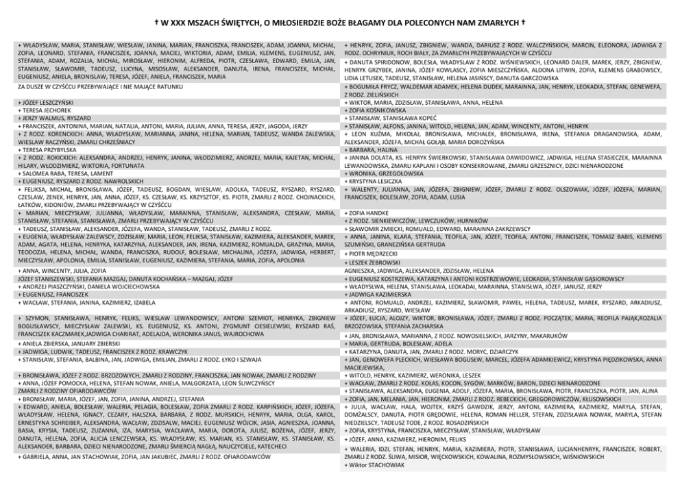 † W XXX MSZACH ŚWIĘTYCH, O MIŁOSIERDZIE BOŻE BŁAGAMY DLA POLECONYCH NAM ZMARŁYCH † + WŁADYSŁAW, MARIA, STANISŁAW, WIESŁAW, JANINA, MARIAN, FRANCISZKA, FRANCISZEK, ADAM, JOANNA, MICHAŁ, ZOFIA, LEONARD, STEFANIA, FRANCISZEK, JOANNA, MACIEJ, WIKTORIA, ADAM, EMILIA, KLEMENS, EUGENIUSZ, JAN, STEFANIA, ADAM, ROZALIA, MICHAŁ, MIROSŁAW, HIERONIM, ALFREDA, PIOTR, CZESŁAWA, EDWARD, EMILIA, JAN, STANISŁAW, SŁAWOMIR, TADEUSZ, LUCYNA, MISOSŁAW, ALEKSANDER, DANUTA, IRENA, FRANCISZEK, MICHAŁ, EUGENIUSZ, ANIELA, BRONISLAW, TERESA, JÓZEF, ANIELA, FRANCISZEK, MARIA ZA DUSZE W CZYŚĆCU PRZEBYWAJĄCE I NIE MAJĄCE RATUNKU + JÓZEF LESZCZYŃSKI + TERESA JECHOREK + JERZY WALMUS, RYSZARD + FRANCISZEK, ANTONINA, MARIAN, NATALIA, ANTONI, MARIA, JULIAN, ANNA, TERESA, JERZY, JAGODA, JERZY + Z RODZ. KORENCKICH: ANNA, WŁADYSŁAW, MARIANNA, JANINA, HELENA, MARIAN, TADEUSZ, WANDA ZALEWSKA, WIESLAW RACZYŃSKI, ZMARLI CHRZEŚNIACY + TERESA PRZYBYLSKA + Z RODZ. ROKICKICH: ALEKSANDRA, ANDRZEJ, HENRYK, JANINA, WŁODZIMIERZ, ANDRZEJ, MARIA, KAJETAN, MICHAŁ, HILARY, WŁODZIMIERZ, WIKTORIA, FORTUNATA + SALOMEA RABA, TERESA, LAMENT + EUGENIUSZ, RYSZARD Z RODZ. NAWROLSKICH + FELIKSA, MICHAŁ, BRONISŁAWA, JÓZEF, TADEUSZ, BOGDAN, WIESLAW, ADOLKA, TADEUSZ, RYSZARD, RYSZARD, CZESLAW, ZENEK, HENRYK, JAN, ANNA, JÓZEF, KS. CZESŁAW, KS. KRZYSZTOF, KS. PIOTR, ZMARLI Z RODZ. CHOJNACKICH, ŁATKÓW, KIDONIÓW, ZMARLI PRZEBYWAJĄCY W CZYŚĆCU + MARIAN, MIECZYSŁAW, JULIANNA, WŁADYSLAW, MARAINNA, STANISŁAW, ALEKSANDRA, CZESŁAW, MARIA, STANISŁAW, STEFANIA, STANISŁAWA, ZMARLI PRZEBYWAJĄCY W CZYŚĆCU + TADEUSZ, STANISŁAW, ALEKSANDER, JÓZEFA, WANDA, STANISŁAW, TADEUSZ, ZMARLI Z RODZ. + EUGENIA, WŁADYSŁAW ZALEWSCY, ZDZISŁAW, MARIA, LEON, FELIKSA, STANISŁAW, KAZIMIERA, ALEKSANDER, MAREK, ADAM, AGATA, HELENA, HENRYKA, KATARZYNA, ALEKSANDER, JAN, IRENA, KAZIMIERZ, ROMUALDA, GRAŻYNA, MARIA, TEODOZJA, HELENA, MICHAŁ, WANDA, FRANCISZKA, RUDOLF, BOLESŁAW, MICHALINA, JÓZEFA, JADWIGA, HERBERT, MIECZYSŁAW, APOLONIA, EMILIA, STANISŁAW, EUGENIUSZ, KAZIMIERA, STEFANIA, MARIA, ZOFIA, APOLONIA + ANNA, WINCENTY, JULIA, ZOFIA JÓZEF STANISZEWSKI, STEFANIA MAZGAJ, DANUTA KOCHAŃSKA – MAZGAJ, JÓZEF + ANDRZEJ PIASZCZYŃSKI, DANIELA WOJCIECHOWSKA + EUGENIUSZ, FRANCISZEK + WACŁAW, STEFANIA, JANINA, KAZIMIERZ, IZABELA + SZYMON, STANISŁAWA, HENRYK, FELIKS, WIESLAW LEWANDOWSCY, ANTONI SZEMIOT, HENRYKA, ZBIGNIEW BOGUSŁAWSCY, MIECZYSŁAW ZALEWSKI, KS. EUGENIUSZ, KS. ANTONI, ZYGMUNT CIESIELEWSKI, RYSZARD RAŚ, FRANCISZEK KACZMAREK,JADWIGA CHARIRAT, ADELAJDA, WERONIKA JANUS, WAJROCHOWA + ANIELA ZBIERSKA, JANUARY ZBIERSKI + JADWIGA, LUDWIK, TADEUSZ, FRANCISZEK Z RODZ. KRAWCZYK + STANISŁAW, STEFANIA, BALBINA, JAN, JADWIGA, EMILIAN, ZMARLI Z RODZ. ŁYKO I SZWAJA + BRONISŁAWA, JÓZEF Z RODZ. BRZOZOWYCH, ZMARLI Z RODZINY, FRANCISZKA, JAN NOWAK, ZMARLI Z RODZINY + ANNA, JÓZEF POMOCKA, HELENA, STEFAN NOWAK, ANIELA, MALGORZATA, LEON ŚLIWCZYŃSCY ZMARLI Z RODZINY OFIARODAWCÓW + BRONISŁAW, MARIA, JÓZEF, JAN, ZOFIA, JANINA, ANDRZEJ, STEFANIA + EDWARD, ANIELA, BOLESŁAW, WALERIA, PELAGIA, BOLESŁAW, ZOFIA ZMARLI Z RODZ. KARPIŃSKICH, JÓZEF, JÓZEFA, WŁADYSŁAW, HELENA, IGNACY, CEZARY, HALSZKA, BARBARA, Z RODZ. MURSKICH, HENRYK, MARIA, OLGA, KAROL, ERNESTYNA SCHREIBER, ALEKSANDRA, WACŁAW, ZDZISALW, MACIEJ, EUGENIUSZ WÓJCIK, JASIA, AGNIESZKA, JOANNA, BASIA, KRYSIA, TADEUSZ, ZUZANNA, IZA, MARYSIA, WACŁAWA, MARIA, DOROTA, JULISZ, BOŻENA, JÓZEF, JERZY, DANUTA, HELENA, ZOFIA, ALICJA LENCZEWSKA, KS. WŁADYSŁAW, KS. MARIAN, KS. STANISŁAW, KS. STANISŁAW, KS. ALEKSANDER, BARBARA, DZIECI NIENARODZONE, ZMARLI ŚMIERCIĄ NAGŁĄ, NAUCZYCIELE, KATECHECI + GABRIELA, ANNA, JAN STACHOWIAK, ZOFIA, JAN JAKUBIEC, ZMARLI Z RODZ. OFIARODAWCÓW + HENRYK, ZOFIA, JANUSZ, ZBIGNIEW, WANDA, DARIUSZ Z RODZ. WALCZYŃSKICH, MARCIN, ELEONORA, JADWIGA Z RODZ. OCHRYNIUK, ROCH BIAŁY, ZA ZMARŁCYH PRZEBYWAJĄCYCH W CZYŚĆCU + DANUTA SPIRIDONOW, BOLESŁA, WŁADYSLAW Z RODZ. WIŚNIEWSKICH, LEONARD DALER, MAREK, JERZY, ZBIGNIEW, HENRYK GRZYBEK, JANINA, JÓZEF KOWLASCY, ZOFIA MIESZCZYŃSKA, ALDONA LITWIN, ZOFIA, KLEMENS GRABOWSCY, LIDIA LETUSEK, TADEUSZ, STANISŁAW, HELENA JASIŃSCY, DANUTA GARCZOWSKA + BOGUMIŁA FRYCZ, WALDEMAR ADAMEK, HELENA DUDEK, MARAINNA, JAN, HENRYK, LEOKADIA, STEFAN, GENEWEFA, Z RODZ. ZIELIŃSKICH + WIKTOR, MARIA, ZDZISŁAW, STANISŁAWA, ANNA, HELENA + ZOFIA KOŚNIKOWSKA + STANISŁAW, STANISŁAWA KOPEĆ + STANISŁAW, ALFONS, JANINA, WITOLD, HELENA, JAN, ADAM, WINCENTY, ANTONI, HENRYK + LEON KUŹMA, MIKOŁAJ, BRONISŁAWA, MICHALEK, BRONISŁAWA, IRENA, STEFANIA DRAGANOWSKA, ADAM, ALEKSANDER, JÓZEFA, MICHAŁ GOŁĄB, MARIA DOROŻYŃSKA + BARBARA, HALINA + JANINA DOLATA, KS. HENRYK ŚWIERKOWSKI, STANISŁAWA DAWIDOWICZ, JADWIGA, HELENA STASIECZEK, MARAINNA LEWANDOWSKA, ZMARLI KAPLANI I OSOBY KONSEKROWANE, ZMARLI GRZESZNICY, DZICI NIENARODZONE + WRONIKA, GRZEGOŁOWSKA + KRYSTYNA LESICZKA + WALENTY, JULIANNA, JAN, JÓZEFA, ZBIGNIEW, JÓZEF, ZMARLI Z RODZ. OLSZOWIAK, JÓZEF, JÓZEFA, MARIAN, FRANCISZEK, BOLESŁAW, ZOFIA, ADAM, LUSIA + ZOFIA HANDKE + Z RODZ. SIENKIEWICZÓW, LEWCZUKÓW, HURNIKÓW + SŁAWOMIR ZMIECKI, ROMUALD, EDWARD, MARAINNA ZAKRZEWSCY + ANNA, JANINA, KLARA, STEFANIA, TEOFILA, JAN, JÓZEF, TEOFILA, ANTONI, FRANCISZEK, TOMASZ BABIS, KLEMENS SZUMIŃSKI, GRANEZIŃSKA GERTRUDA + PIOTR MĘDRZECKI + LESZEK ŻEBROWSKI AGNIESZKA, JADWIGA, ALEKSANDER, ZDZISŁAW, HELENA + EUGENIUSZ KOSTRZEWA, KATARZYNA I ANTONI KOSTRZEWOWIE, LEOKADIA, STANISŁAW GĄSIOROWSCY + WŁADYSŁWA, HELENA, STANISLAWA, LEOKADAI, MARAINNA, STANISŁWA, JÓZEF, JANUSZ, JERZY + JADWIGA KAZIMIERSKA + ANTONI, ROMUALD, ANDRZEJ, KAZIMIERZ, SŁAWOMIR, PAWEŁ, HELENA, TADEUSZ, MAREK, RYSZARD, ARKADIUSZ, ARKADIUSZ, RYSZARD, WIESŁAW + JÓZEF, ŁUCJA, ALOJZY, WIKTOR, BRONISŁAWA, JÓZEF, ZMARLI Z RODZ. POCZĄTEK, MARIA, REOFILA PAJĄK,ROZALIA BRZOZOWSKA, STEFANIA ZACHARSKA + JAN, BRONISŁAWA, MARIANNA, Z RODZ. NOWOSIELSKICH, JARZYNY, MAKARUKÓW + MARIA, GERTRUDA, BOL