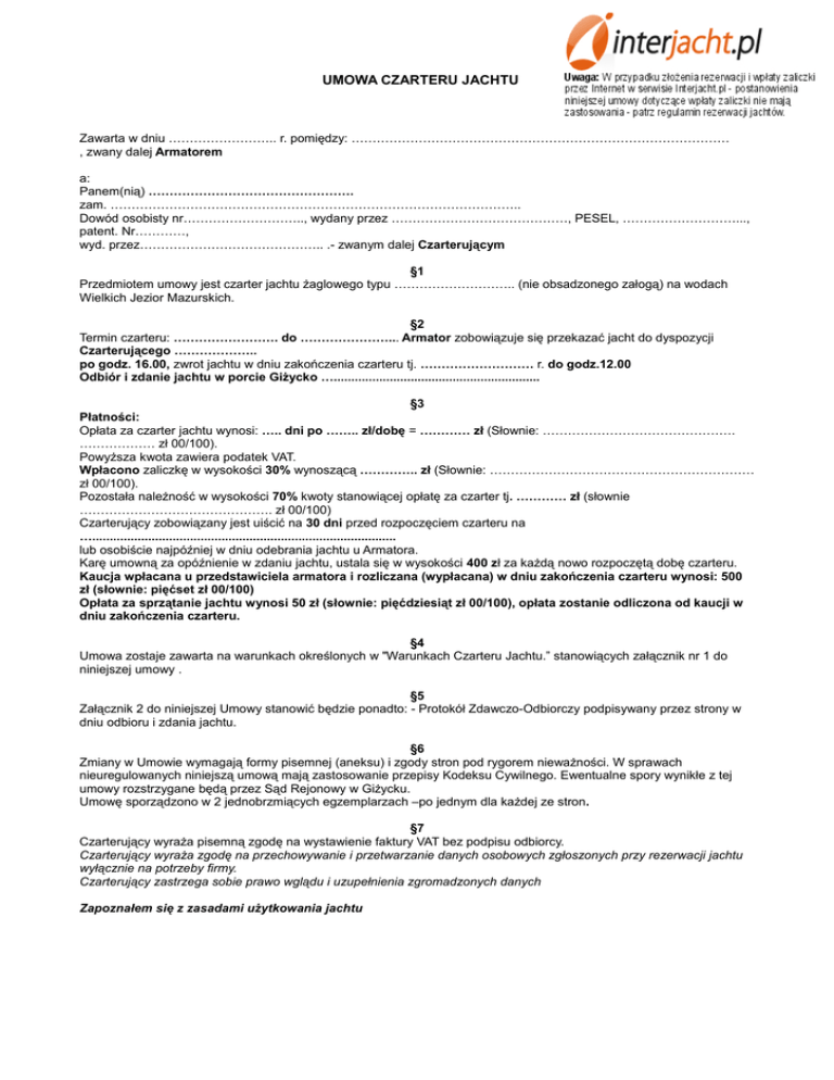 UMOWA CZARTERU JACHTU Zawarta w dniu …………………….. r. pomiędzy: ……………………………………………………………………………… , zwany dalej Armatorem a: Panem(nią) …………………………………………. zam. …………………………………………………………………………………….. Dowód osobisty nr……………………….., wydany przez ……………………………………, PESEL, ………………………..., patent. Nr…………, wyd. przez…………………………………….. .- zwanym dalej Czarterującym §1 Przedmiotem umowy jest czarter jachtu żaglowego typu ……………………….. (nie obsadzonego załogą) na wodach Wielkich Jezior Mazurskich. §2 Termin czarteru: ……………………. do …………………... Armator zobowiązuje się przekazać jacht do dyspozycji Czarterującego ……………….. po godz. 16.00, zwrot jachtu w dniu zakończenia czarteru tj. ……………………… r. do godz.12.00 Odbiór i zdanie jachtu w porcie Giżycko …........................................................... §3 Płatności: Opłata za czarter jachtu wynosi: ….. dni po …….. zł/dobę = ………… zł (Słownie: ………………………………………. ……………… zł 00/100). Powyższa kwota zawiera podatek VAT. Wpłacono zaliczkę w wysokości 30% wynoszącą ………….. zł (Słownie: ……………………………………………………… zł 00/100). Pozostała należność w wysokości 70% kwoty stanowiącej opłatę za czarter tj. ………… zł (słownie ………………………………………. zł 00/100) Czarterujący zobowiązany jest uiścić na 30 dni przed rozpoczęciem czarteru na …....................................................................................... lub osobiście najpóźniej w dniu odebrania jachtu u Armatora. Karę umowną za opóźnienie w zdaniu jachtu, ustala się w wysokości 400 zł za każdą nowo rozpoczętą dobę czarteru. Kaucja wpłacana u przedstawiciela armatora i rozliczana (wypłacana) w dniu zakończenia czarteru wynosi: 500 zł (słownie: pięćset zł 00/100) Opłata za sprzątanie jachtu wynosi 50 zł (słownie: pięćdziesiąt zł 00/100), opłata zostanie odliczona od kaucji w dniu zakończenia czarteru. §4 Umowa zostaje zawarta na warunkach określonych w "Warunkach Czarteru Jachtu.” stanowiących załącznik nr 1 do niniejszej umowy . §5 Załącznik 2 do niniejszej Umowy stanowić będzie ponadto: - Protokół Zdawczo-Odbiorczy podpisywany przez strony w dniu odbioru i zdania jachtu. §6 Zmiany w Umowie wymagają formy pisemnej (aneksu) i zgody stron pod rygorem nieważności. W sprawach nieuregulowanych niniejszą umową mają zastosowanie przepisy Kodeksu Cywilnego. Ewentualne spory wynikłe z tej umowy rozstrzygane będą przez Sąd Rejonowy w Giżycku. Umowę sporządzono w 2 jednobrzmiących egzemplarzach –po jednym dla każdej ze stron. §7 Czarterujący wyraża pisemną zgodę na wystawienie faktury VAT bez podpisu odbiorcy. Czarterujący wyraża zgodę na przechowywanie i przetwarzanie danych osobowych zgłoszonych przy rezerwacji jachtu wyłącznie na potrzeby firmy. Czarterujący zastrzega sobie prawo wglądu i uzupełnienia zgromadzonych danych Zapoznałem się z zasadami użytkowania jachtu ARMATOR: CZARTERUJĄCY: