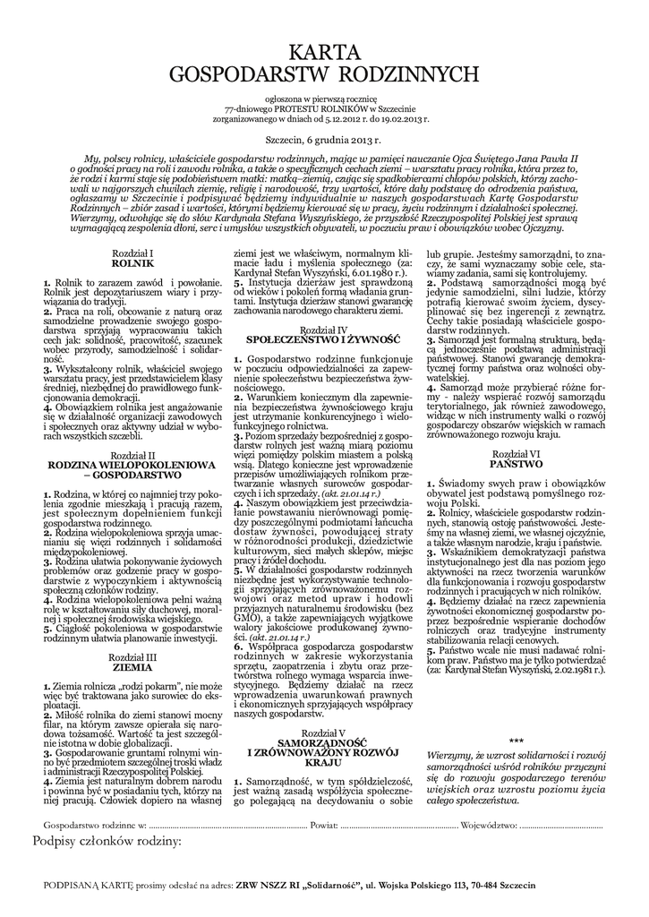 KARTA GOSPODARSTW RODZINNYCH ogłoszona w pierwszą rocznicę 77-dniowego PROTESTU ROLNIKÓW w Szczecinie zorganizowanego w dniach od 5.12.2012 r. do 19.02.2013 r. Szczecin, 6 grudnia 2013 r. My, polscy rolnicy, właściciele gospodarstw rodzinnych, mając w pamięci nauczanie Ojca Świętego Jana Pawła II o godności pracy na roli i zawodu rolnika, a także o specyficznych cechach ziemi – warsztatu pracy rolnika, która przez to, że rodzi i karmi staje się podobieństwem matki: matką–ziemią, czując się spadkobiercami chłopów polskich, którzy zachowali w najgorszych chwilach ziemię, religię i narodowość, trzy wartości, które dały podstawę do odrodzenia państwa, ogłaszamy w Szczecinie i podpisywać będziemy indywidualnie w naszych gospodarstwach Kartę Gospodarstw Rodzinnych – zbiór zasad i wartości, którymi będziemy kierować się w pracy, życiu rodzinnym i działalności społecznej. Wierzymy, odwołując się do słów Kardynała Stefana Wyszyńskiego, że przyszłość Rzeczypospolitej Polskiej jest sprawą wymagającą zespolenia dłoni, serc i umysłów wszystkich obywateli, w poczuciu praw i obowiązków wobec Ojczyzny. Rozdział I ROLNIK 1. Rolnik to zarazem zawód i powołanie. Rolnik jest depozytariuszem wiary i przywiązania do tradycji. 2. Praca na roli, obcowanie z naturą oraz samodzielne prowadzenie swojego gospodarstwa sprzyjają wypracowaniu takich cech jak: solidność, pracowitość, szacunek wobec przyrody, samodzielność i solidarność. 3. Wykształcony rolnik, właściciel swojego warsztatu pracy, jest przedstawicielem klasy średniej, niezbędnej do prawidłowego funkcjonowania demokracji. 4. Obowiązkiem rolnika jest angażowanie się w działalność organizacji zawodowych i społecznych oraz aktywny udział w wyborach wszystkich szczebli. Rozdział II RODZINA WIELOPOKOLENIOWA – GOSPODARSTWO 1. Rodzina, w której co najmniej trzy poko- lenia zgodnie mieszkają i pracują razem, jest społecznym dopełnieniem funkcji gospodarstwa rodzinnego. 2. Rodzina wielopokoleniowa sprzyja umacnianiu się więzi rodzinnych i solidarności międzypokoleniowej. 3. Rodzina ułatwia pokonywanie życiowych problemów oraz godzenie pracy w gospodarstwie z wypoczynkiem i aktywnością społeczną członków rodziny. 4. Rodzina wielopokoleniowa pełni ważną rolę w kształtowaniu siły duchowej, moralnej i społecznej środowiska wiejskiego. 5. Ciągłość pokoleniowa w gospodarstwie rodzinnym ułatwia planowanie inwestycji. Rozdział III ZIEMIA 1. Ziemia rolnicza „rodzi pokarm”, nie może ziemi jest we właściwym, normalnym klimacie ładu i myślenia społecznego (za: Kardynał Stefan Wyszyński, 6.01.1980 r.). 5. Instytucja dzierżaw jest sprawdzoną od wieków i pokoleń formą władania gruntami. Instytucja dzierżaw stanowi gwarancję zachowania narodowego charakteru ziemi. Rozdział IV SPOŁECZEŃSTWO I ŻYWNOŚĆ 1. Gospodarstwo rodzinne funkcjonuje w poczuciu odpowiedzialności za zapewnienie społeczeństwu bezpieczeństwa żywnościowego. 2. Warunkiem koniecznym dla zapewnienia bezpieczeństwa żywnościowego kraju jest utrzymanie konkurencyjnego i wielofunkcyjnego rolnictwa. 3. Poziom sprzedaży bezpośredniej z gospodarstw rolnych jest ważną miarą poziomu więzi pomiędzy polskim miastem a polską wsią. Dlatego konieczne jest wprowadzenie przepisów umożliwiających rolnikom przetwarzanie własnych surowców gospodarczych i ich sprzedaży. (akt. 21.01.14 r.) 4. Naszym obowiązkiem jest przeciwdziałanie powstawaniu nierównowagi pomiędzy poszczególnymi podmiotami łańcucha dostaw żywności, powodującej straty w różnorodności produkcji, dziedzictwie kulturowym, sieci małych sklepów, miejsc pracy i źródeł dochodu. 5. W działalności gospodarstw rodzinnych niezbędne jest wykorzystywanie technologii sprzyjających zrównoważonemu rozwojowi oraz metod upraw i hodowli przyjaznych naturalnemu środowisku (bez GMO), a także zapewniających wyjątkowe walory jakościowe produkowanej żywności. (akt. 21.01.14 r.) 6. Współpraca gospodarcza gospodarstw rodzinnych w zakresie wykorzystania sprzętu, zaopatrzenia i zbytu oraz przetwórstwa rolnego wymaga wsparcia inwestycyjnego. Będziemy działać na rzecz wprowadzenia uwarunkowań prawnych i ekonomicznych sprzyjających współpracy naszych gospodarstw. Rozdział V więc być traktowana jako surowiec do eksploatacji. 2. Miłość rolnika do ziemi stanowi mocny filar, na którym zawsze opierała się narodowa tożsamość. Wartość ta jest szczególSAMORZĄDNOŚĆ nie istotna w dobie globalizacji. 3. Gospodarowanie gruntami rolnymi winI ZRÓWNOWAŻONY ROZWÓJ no być przedmiotem szczególnej troski władz KRAJU i administracji Rzeczypospolitej Polskiej. 4. Ziemia jest naturalnym dobrem narodu 1. Samorządność, w tym spółdzielczość, i powinna być w posiadaniu tych, którzy na jest ważną zasadą współżycia społeczneniej pracują. Człowiek dopiero na własnej go polegającą na decydowaniu o sobie lub grupie. Jesteśmy samorządni, to znaczy, że sami wyznaczamy sobie cele, stawiamy zadania, sami się kontrolujemy. 2. Podstawą samorządności mogą być jedynie samodzielni, silni ludzie, którzy potrafią kierować swoim życiem, dyscyplinować się bez ingerencji z zewnątrz. Cechy takie posiadają właściciele gospodarstw rodzinnych. 3. Samorząd jest formalną strukturą, będącą jednocześnie podstawą administracji państwowej. Stanowi gwarancję demokratycznej formy państwa oraz wolności obywatelskiej. 4. Samorząd może przybierać różne formy - należy wspierać rozwój samorządu terytorialnego, jak również zawodowego, widząc w nich instrumenty walki o rozwój gospodarczy obszarów wiejskich w ramach zrównoważonego rozwoju kraju. Rozdział VI PAŃSTWO 1. Świadomy swych praw i obowiązków obywatel jest podstawą pomyślnego rozwoju Polski. 2. Rolnicy, właściciele gospodarstw rodzinnych, stanowią ostoję państwowości. Jesteśmy na 