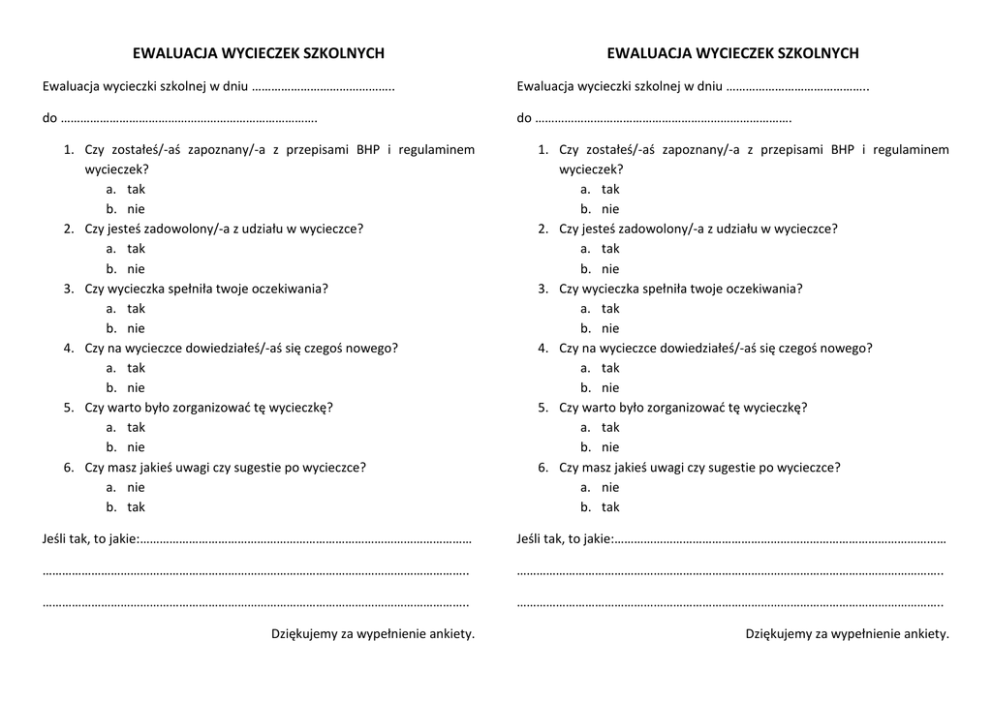 EWALUACJA WYCIECZEK SZKOLNYCH EWALUACJA WYCIECZEK SZKOLNYCH Ewaluacja wycieczki szkolnej w dniu …………………………………….. Ewaluacja wycieczki szkolnej w dniu …………………………………….. do ……………………………………………………………………. do ……………………………………………………………………. 1. Czy zostałeś/-aś zapoznany/-a z przepisami BHP i regulaminem wycieczek? a. tak b. nie 2. Czy jesteś zadowolony/-a z udziału w wycieczce? a. tak b. nie 3. Czy wycieczka spełniła twoje oczekiwania? a. tak b. nie 4. Czy na wycieczce dowiedziałeś/-aś się czegoś nowego? a. tak b. nie 5. Czy warto było zorganizować tę wycieczkę? a. tak b. nie 6. Czy masz jakieś uwagi czy sugestie po wycieczce? a. nie b. tak 1. Czy zostałeś/-aś zapoznany/-a z przepisami BHP i regulaminem wycieczek? a. tak b. nie 2. Czy jesteś zadowolony/-a z udziału w wycieczce? a. tak b. nie 3. Czy wycieczka spełniła twoje oczekiwania? a. tak b. nie 4. Czy na wycieczce dowiedziałeś/-aś się czegoś nowego? a. tak b. nie 5. Czy warto było zorganizować tę wycieczkę? a. tak b. nie 6. Czy masz jakieś uwagi czy sugestie po wycieczce? a. nie b. tak Jeśli tak, to jakie:………………………………………………………………………………………… Jeśli tak, to jakie:………………………………………………………………………………………… ………………………………………………………………………………………………………………….. ………………………………………………………………………………………………………………….. ………………………………………………………………………………………………………………….. ………………………………………………………………………………………………………………….. Dziękujemy za wypełnienie ankiety. Dziękujemy za wypełnienie ankiety.
