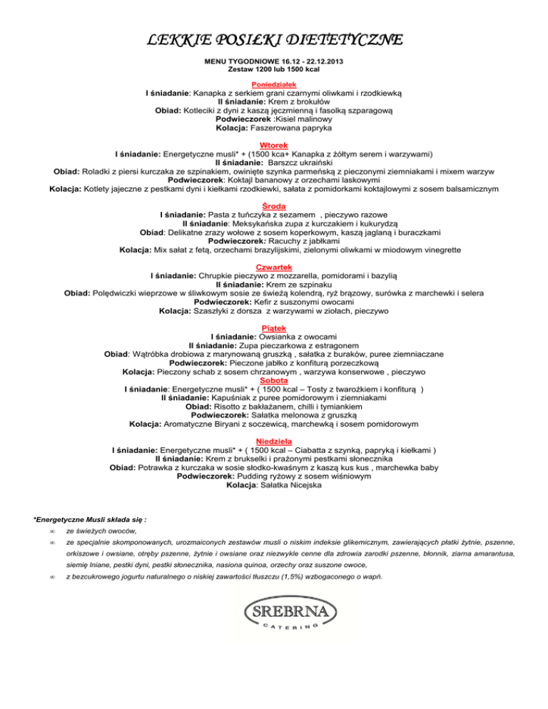 LEKKIE POSIŁKI DIETETYCZNE MENU TYGODNIOWE 16.12 - 22.12.2013 Zestaw 1200 lub 1500 kcal Poniedziałek I śniadanie: Kanapka z serkiem grani czarnymi oliwkami i rzodkiewką II śniadanie: Krem z brokułów Obiad: Kotleciki z dyni z kaszą jęczmienną i fasolką szparagową Podwieczorek :Kisiel malinowy Kolacja: Faszerowana papryka Wtorek I śniadanie: Energetyczne musli* + (1500 kca+ Kanapka z żółtym serem i warzywami) II śniadanie: Barszcz ukraiński Obiad: Roladki z piersi kurczaka ze szpinakiem, owinięte szynka parmeńską z pieczonymi ziemniakami i mixem warzyw Podwieczorek: Koktajl bananowy z orzechami laskowymi Kolacja: Kotlety jajeczne z pestkami dyni i kiełkami rzodkiewki, sałata z pomidorkami koktajlowymi z sosem balsamicznym Środa I śniadanie: Pasta z tuńczyka z sezamem , pieczywo razowe II śniadanie: Meksykańska zupa z kurczakiem i kukurydzą Obiad: Delikatne zrazy wołowe z sosem koperkowym, kaszą jaglaną i buraczkami Podwieczorek: Racuchy z jabłkami Kolacja: Mix sałat z fetą, orzechami brazylijskimi, zielonymi oliwkami w miodowym vinegrette Czwartek I śniadanie: Chrupkie pieczywo z mozzarella, pomidorami i bazylią II śniadanie: Krem ze szpinaku Obiad: Polędwiczki wieprzowe w śliwkowym sosie ze świeżą kolendrą, ryż brązowy, surówka z marchewki i selera Podwieczorek: Kefir z suszonymi owocami Kolacja: Szaszłyki z dorsza z warzywami w ziołach, pieczywo Piątek I śniadanie: Owsianka z owocami II śniadanie: Zupa pieczarkowa z estragonem Obiad: Wątróbka drobiowa z marynowaną gruszką , sałatka z buraków, puree ziemniaczane Podwieczorek: Pieczone jabłko z konfiturą porzeczkową Kolacja: Pieczony schab z sosem chrzanowym , warzywa konserwowe , pieczywo Sobota I śniadanie: Energetyczne musli* + ( 1500 kcal – Tosty z twarożkiem i konfiturą ) II śniadanie: Kapuśniak z puree pomidorowym i ziemniakami Obiad: Risotto z bakłażanem, chilli i tymiankiem Podwieczorek: Sałatka melonowa z gruszką Kolacja: Aromatyczne Biryani z soczewicą, marchewką i sosem pomidorowym Niedziela I śniadanie: Energetyczne musli* + ( 1500 kcal – Ciabatta z szynką, papryką i kiełkami ) II śniadanie: Krem z brukselki i prażonymi pestkami słonecznika Obiad: Potrawka z kurczaka w sosie słodko-kwaśnym z kaszą kus kus , marchewka baby Podwieczorek: Pudding ryżowy z sosem wiśniowym Kolacja: Sałatka Nicejska *Energetyczne Musli składa się : • ze świeżych owoców, • ze specjalnie skomponowanych, urozmaiconych zestawów musli o niskim indeksie glikemicznym, zawierających płatki żytnie, pszenne, orkiszowe i owsiane, otręby pszenne, żytnie i owsiane oraz niezwykle cenne dla zdrowia zarodki pszenne, błonnik, ziarna amarantusa, siemię lniane, pestki dyni, pestki słonecznika, nasiona quinoa, orzechy oraz suszone owoce, • z bezcukrowego jogurtu naturalnego o niskiej zawartości tłuszczu (1,5%) wzbogaconego o wapń.