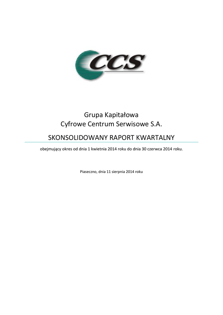 Grupa Kapitałowa Cyfrowe Centrum Serwisowe S.A. SKONSOLIDOWANY RAPORT KWARTALNY obejmujący okres od dnia 1 kwietnia 2014 roku do dnia 30 czerwca 2014 roku. Piaseczno, dnia 11 sierpnia 2014 roku 1. Informacje podstawowe. 1.1. Nazwa: Cyfrowe Centrum Serwisowe S.A. (zwana dalej „Spółką”). 1.2. Forma prawna : spółka akcyjna. 1.3. Siedziba: ul. Puławska 40A, 05-500 Piaseczno. 1.4. Podstawowy przedmiot działalności – naprawy gwarancyjne i pogwarancyjne telefonów komórkowych, tabletów i akcesoriów do urządzeń telekomunikacyjnych; sprzedaż detaliczna sprzętu telekomunikacyjnego, sprzedaż hurtowa sprzętu telekomunikacyjnego. 1.5. Organ prowadzący rejestr - Rejestr Przedsiębiorców w Krajowym Rejestrze Sądowym; numer KRS Spółki: 0000253995. 1.6. Zarząd: Według stanu na dzień 30 czerwca 2014 roku w skład Zarządu wchodzą następujące osoby: - Jerzy Maciej Zygmunt (Prezes) - Robert Frączek (Wiceprezes) - Aleksandra Kunka (Wiceprezes) W okresie od 1 kwietnia do 30 czerwca 2014 roku nie wystąpiły zmiany w składzie Zarządu Spółki. 1.7. Rada Nadzorcza: Według stanu na dzień 30 czerwca 2014 roku w skład Rady Nadzorczej wchodzą następujące osoby: - Aleksander Lesz (Przewodniczący Rady Nadzorczej) - Jerzy Kurczyna (Zastępca Przewodniczącego Rady Nadzorczej) - Jakub Zygmunt (Sekretarz Rady Nadzorczej) - Tomasz Jobda (Członek Rady Nadzorczej) - Hubert Maciąg (Członek Rady Nadzorczej) W okresie od 1 kwietnia do 30 czerwca 2014 nie wystąpiły zmiany w składzie Rady Nadzorczej Spółki. 1.8. Podmiot uprawniony do badania sprawozdań finansowych: C&R Auditors Sp. z o.o. ul. Spójni 22 03-604 Warszawa 1.9. Notowania w Alternatywnym Systemie Obrotu (na rynku NewConnect) Giełdy Papierów Wartościowych w Warszawie S.A. - informacje ogólne: Giełda Papierów Wartościowych w Warszawie S.A. ul. Książęca 4 00-498 Warszawa Oznaczenie (symbol): CCS Kontakty z inwestorami: Robert Frączek, e-mail: [email protected] Cyfrowe Centrum Serwisowe S.A. ul. Puławska 40 A 05-500 Piaseczno 1.10. Czas trwania Spółki: nieograniczony. 2 Cyfrowe Centrum Serwisowe S.A., 05-500 Piaseczno, ul. Puławska 40a Spółka wpisana do rejestru przedsiębiorców w Sądzie Rejonowym dla m. st. Warszawy XIV Wydział Gospodarczy Krajowego Rejestru Sądowego pod numerem KRS 0000253995, NIP: 951-19-78-674, kapitał zakładowy: 1 589 100 PLN (kapitał został w całości wpłacony) 1.11. Kapitał zakładowy Spółki wynosi 1.589.100 (jeden milion pięćset osiemdziesiąt dziewięć tysięcy sto) złotych i dzieli się na 15.891.000 (piętnaście milionów osiemset dziewięćdziesiąt jeden tysięcy) akcji zwykłych, na okaziciela. 1.12. Okres objęty niniejszym Raportem: 01.04.2014 roku - 30.06.2014 roku. 2. Opis organizacji Grupy Kapitałowej, ze wskazaniem jednostek podlegających konsolidacji. 2.1. Grupa Kapitałowa Cyfrowe Centrum Serwisowe S.A. składa się z Cyfrowego Centrum Serwisowego S.A. (jednostka dominująca) oraz z jednostek powiązanych. Jednostki powiązane zostały wymienione w poniższej tabeli. Spółka % posiadanych głosów Fresh Mobile Concepts spółka z ograniczoną odpowiedzialnością 100% Cyfrowe Centrum Serwisowe spółka z ograniczoną odpowiedzialnością (lit. UAB “Skaitmeninis priežiūros centras”) 100% Cyfrowe Centrum Serwisowe - Ukraina Sp. z o.o. (ukr. Товариство з обмеженою відповідальністю „Цифровий сервісний центр – Україна”) 100% CCS Energia spółka z ograniczoną odpowiedzialnością 51% Cyfrowe Centrum Serwisowe S.A. posiada: a) 100% udział w kapitałach zakładowych spółek Fresh Mobile Concepts spółka z ograniczoną odpowiedzialnością, Cyfrowe Centrum Serwisowe spółka z ograniczoną odpowiedzialnością (lit. UAB “Skaitmeninis priežiūros centras”), Cyfrowe Centrum Serwisowe - Ukraina Sp. z o.o. (ukr. Товариство з обмеженою відповідальністю „Цифровий сервісний центр – Україна”), b) 51% udział w kapitale zakładowym spółki CCS Energia spółka z ograniczoną odpowiedzialnością. 2.2. Fresh Mobile Concepts spółka z ograniczoną odpowiedzialnością: - siedziba spółki - ul. Puławska 40A, 05-500 Piaseczno; - podstawa prawna działalności spółki - Akt założycielski spółki Fresh Mobile Concepts sp. z o.o. został sporządzony w dniu 27 grudnia 2006 roku, a spółka wpisana została do rejestru przedsiębiorców Krajowego Rejestru Sądowego w dniu 28 czerwca 2007 roku pod numerem KRS 283849; - kapitał zakładowy spółki wynosi 100.000 (sto tysięcy) złotych i dzieli się na 100 (sto) udziałów; - jednostka dominująca posiada 100 (sto) udziałów spółki Fresh Mobile Concepts sp. z o.o. o wartości nominalnej 1.000 (jeden tysiąc) złotych każdy udział i o łącznej wartości nominalnej 100.000 (sto tysięcy) złotych, co uprawnia jednostkę dominującą do wykonywania 100% głosów na Zgromadzeniu Wspólników; - przedmiotem działalności spółki Fresh Mobile Concepts sp. z o.o., zdefiniowanym w akcie założycielskim spółki, jest: naprawa i konserwacja sprzętu (tele) komunikacyjnego, naprawa i konserwacja elektronicznego sprzętu powszechnego użytku, naprawa i konserwacja urządzeń elektronicznych i optycznych, naprawa i konserwacja komputerów i urządzeń peryferyjnych, naprawa pozostałych artykułów użytku osobistego i domowego, instalowanie maszyn przemysłowych, sprzętu i wyposażenia, sprzedaż hurtowa sprzętu elektronicznego i telekomunikacyjnego oraz części do niego, sprzedaż hurtowa niewyspecjalizowana, sprzedaż detaliczna sprzętu telekomunikacyjnego prowadzona w 3 Cyfrowe Centrum Serwisowe S.A., 05-500 Piaseczno, ul. Puławska 40a Spółka wpisana do rejestru przedsiębiorców w Sądzie Rejonowym dla m. st. Warszawy XIV Wydział Gospodarczy Krajowego Rejestru Sądowego pod numerem KRS 0000253995, NIP: 951-19-78-674, kapitał zakładowy: 1 589 
