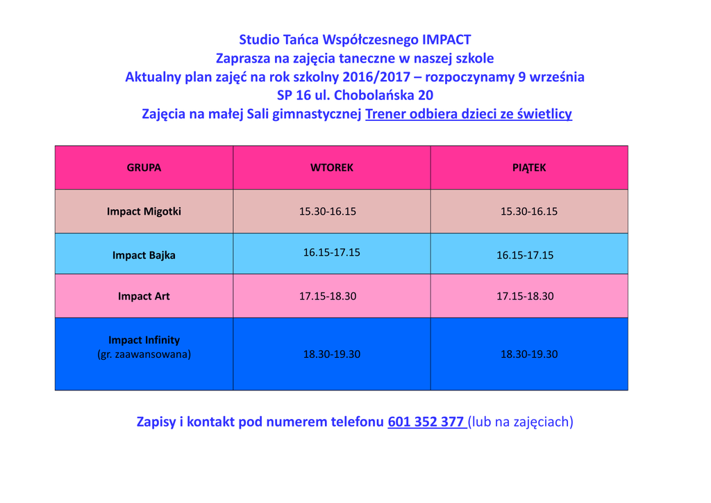 Studio Tańca Współczesnego IMPACT Zaprasza na zajęcia taneczne w naszej szkole Aktualny plan zajęć na rok szkolny 2016/2017 – rozpoczynamy 9 września SP 16 ul. Chobolańska 20 Zajęcia na małej Sali gimnastycznej Trener odbiera dzieci ze świetlicy GRUPA Impact Migotki Impact Bajka Impact Art Impact Infinity (gr. zaawansowana) WTOREK 15.30-16.15 16.15-17.15 17.15-18.30 18.30-19.30 PIĄTEK 15.30-16.15 16.15-17.15 17.15-18.30 18.30-19.30 Zapisy i kontakt pod numerem telefonu 601 352 377 (lub na zajęciach)
