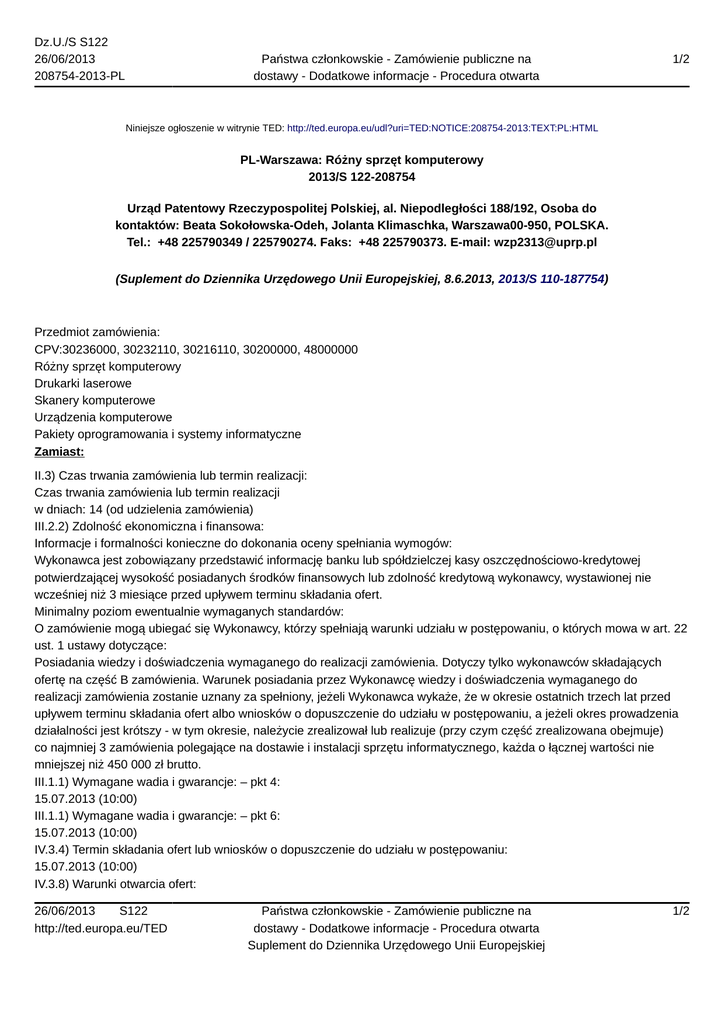 Dz.U./S S122 26/06/2013 208754-2013-PL Państwa członkowskie - Zamówienie publiczne na dostawy - Dodatkowe informacje - Procedura otwarta 1/2 Niniejsze ogłoszenie w witrynie TED: http://ted.europa.eu/udl?uri=TED:NOTICE:208754-2013:TEXT:PL:HTML PL-Warszawa: Różny sprzęt komputerowy 2013/S 122-208754 Urząd Patentowy Rzeczypospolitej Polskiej, al. Niepodległości 188/192, Osoba do kontaktów: Beata Sokołowska-Odeh, Jolanta Klimaschka, Warszawa00-950, POLSKA. Tel.: +48 225790349 / 225790274. Faks: +48 225790373. E-mail: [email protected] (Suplement do Dziennika Urzędowego Unii Europejskiej, 8.6.2013, 2013/S 110-187754) Przedmiot zamówienia: CPV:30236000, 30232110, 30216110, 30200000, 48000000 Różny sprzęt komputerowy Drukarki laserowe Skanery komputerowe Urządzenia komputerowe Pakiety oprogramowania i systemy informatyczne Zamiast: II.3) Czas trwania zamówienia lub termin realizacji: Czas trwania zamówienia lub termin realizacji w dniach: 14 (od udzielenia zamówienia) III.2.2) Zdolność ekonomiczna i finansowa: Informacje i formalności konieczne do dokonania oceny spełniania wymogów: Wykonawca jest zobowiązany przedstawić informację banku lub spółdzielczej kasy oszczędnościowo-kredytowej potwierdzającej wysokość posiadanych środków finansowych lub zdolność kredytową wykonawcy, wystawionej nie wcześniej niż 3 miesiące przed upływem terminu składania ofert. Minimalny poziom ewentualnie wymaganych standardów: O zamówienie mogą ubiegać się Wykonawcy, którzy spełniają warunki udziału w postępowaniu, o których mowa w art. 22 ust. 1 ustawy dotyczące: Posiadania wiedzy i doświadczenia wymaganego do realizacji zamówienia. Dotyczy tylko wykonawców składających ofertę na część B zamówienia. Warunek posiadania przez Wykonawcę wiedzy i doświadczenia wymaganego do realizacji zamówienia zostanie uznany za spełniony, jeżeli Wykonawca wykaże, że w okresie ostatnich trzech lat przed upływem terminu składania ofert albo wniosków o dopuszczenie do udziału w postępowaniu, a jeżeli okres prowadzenia działalności jest krótszy - w tym okresie, należycie zrealizował lub realizuje (przy czym część zrealizowana obejmuje) co najmniej 3 zamówienia polegające na dostawie i instalacji sprzętu informatycznego, każda o łącznej wartości nie mniejszej niż 450 000 zł brutto. III.1.1) Wymagane wadia i gwarancje: – pkt 4: 15.07.2013 (10:00) III.1.1) Wymagane wadia i gwarancje: – pkt 6: 15.07.2013 (10:00) IV.3.4) Termin składania ofert lub wniosków o dopuszczenie do udziału w postępowaniu: 15.07.2013 (10:00) IV.3.8) Warunki otwarcia ofert: 26/06/2013 S122 http://ted.europa.eu/TED Państwa członkowskie - Zamówienie publiczne na dostawy - Dodatkowe informacje - Procedura otwarta Suplement do Dziennika Urzędowego Unii Europejskiej 1/2 Dz.U./S S122 26/06/2013 208754-2013-PL Państwa członkowskie - Zamówienie publiczne na dostawy - Dodatkowe informacje - Procedura otwarta 2/2 15.07.2013 (10:30) Powinno być: II.3) Czas trwania zamówienia lub termin realizacji: Czas trwania zamówienia lub termin realizacji w dniach: 35 (od udzielenia zamówienia) III.2.2) Zdolność ekonomiczna i finansowa: Informacje i formalności konieczne do dokonania oceny spełniania wymogów: Wykonawca jest zobowiązany przedstawić informację banku lub spółdzielczej kasy oszczędnościowo-kredytowej potwierdzającej wysokość posiadanych środków finansowych lub zdolność kredytową wykonawcy, wystawionej nie wcześniej niż 3 miesiące przed upływem terminu składania ofert. Minimalny poziom ewentualnie wymaganych standardów: O zamówienie mogą ubiegać się Wykonawcy, którzy znajdują się w odpowiedniej sytuacji ekonomicznej i finansowej zapewniającej wykonanie niniejszego zamówienia tj. Wykonawca zobowiązany jest wykazać, ze posiada środki finansowe lub zdolność kredytową w kwocie: a) Dla części A – co najmniej 150 000 zł. b) Dla części B – co najmniej 450 000 zł. c) Dla części A i B – co najmniej 450 000 zł. brutto (tj. wykonawca składający ofertę na obydwie części zobowiązany jest wykazać się środkami finansowymi lub zdolnością kredytową w kwocie 450 000 zł. III.1.1) Wymagane wadia i gwarancje: – pkt 4: 18.07.2013 (10:00) III.1.1) Wymagane wadia i gwarancje: – pkt 6: 18.07.2013 (10:00) IV.3.4) Termin składania ofert lub wniosków o dopuszczenie do udziału w postępowaniu: 18.07.2013 (10:00) IV.3.8) Warunki otwarcia ofert: 18.07.2013 (10:30) Inne dodatkowe informacje Informacje do poprawienia lub dodania w odpowiedniej dokumentacji przetargowej. Więcej informacji w odpowiedniej dokumentacji przetargowej. 26/06/2013 S122 http://ted.europa.eu/TED Państwa członkowskie - Zamówienie publiczne na dostawy - Dodatkowe informacje - Procedura otwarta Suplement do Dziennika Urzędowego Unii Europejskiej 2/2