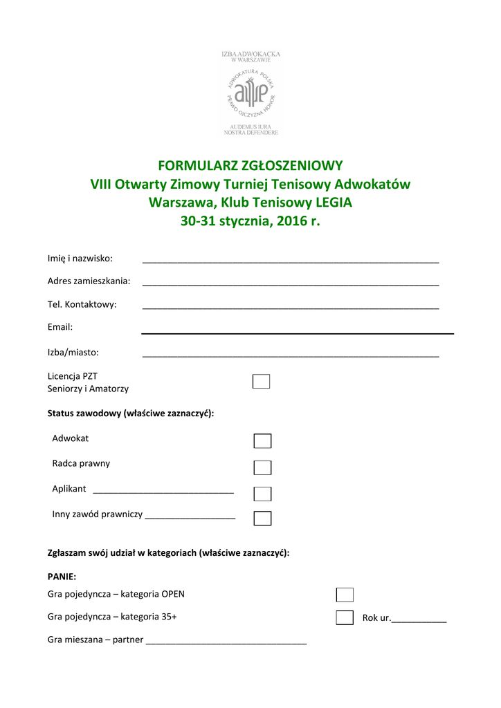 FORMULARZZGŁOSZENIOWY VIIIOtwartyZimowyTurniejTenisowyAdwokatów Warszawa,KlubTenisowyLEGIA 30-31stycznia,2016r. Imięinazwisko: ___________________________________________________________ Adreszamieszkania: ___________________________________________________________ Tel.Kontaktowy: ___________________________________________________________ Email: Izba/miasto: ___________________________________________________________ LicencjaPZT SeniorzyiAmatorzy Statuszawodowy(właściwezaznaczyć): Adwokat Radcaprawny Aplikant____________________________ Innyzawódprawniczy__________________ Zgłaszamswójudziałwkategoriach(właściwezaznaczyć): PANIE: Grapojedyncza–kategoriaOPEN Grapojedyncza–kategoria35+ Rokur.___________ Gramieszana–partner________________________________ PANOWIE: Grapojedyncza–kategoriaOPEN Grapojedyncza–kategoria35+ Grapojedyncza–kategoria45+ Grapojedyncza–kategoria55+ Rokur.___________ Grapojedyncza–kategoria65+ Grapodwójna/mieszana–partner______________________ Rokur.___________ Rokur.___________ Rokur.___________ Rokur.___________ Rokur._____/_____ Niniejszymoświadczam,iż: 1. Dobrowolnie oraz na własne ryzyko i odpowiedzialność zgłaszam swój udział w imprezie organizowanej przez Komisję Kultury, Sportu i TurystykiOkręgowejRadyAdwokackiejwWarszawiepodnazwą"VIIIOtwartyZimowyTurniejTenisowyAdwokatów",któryodbędziesię wdniach17-18stycznia2015r.wKlubieTenisowymLEGIA; 2. Akceptujęto,żeorganizatornieubezpieczauczestnikówturniejuodnastępstwnieszczęśliwychwypadkówiododpowiedzialnościcywilnej; 3. Zobowiązujesiędoprzestrzeganiawszelkichzasadbezpieczeństwaizdrowegorozsądkuwtrakcieudziałuwimprezie; 4. Zobowiązujesiędopostępowaniazgodniezduchemrywalizacjiorazposzanowaniemdlainnychuczestnikówimprezy; 5. Jestemświadoma(y),żewprzypadkunieprzestrzeganiapunktów3i4powyżejmogęzostaćwykluczonyzudziałuwimprezie; 6. WyrażamzgodęnaprzetwarzaniemoichdanychosobowychzawartychwoświadczeniuprzezOrganizatoranapotrzebyimprezy(zgodniez ustawązdnia29sierpnia1997rokuoochroniedanychosobowych,Dz.U.nr133,poz.833,zezm.)orazwyrażamzgodęnaotrzymywaniew przyszłościdrogąe-mailowąinformacjiopodobnychimprezach; 7. Wyrażamzgodęnawykorzystaniemojegoimienia,nazwiska,informacjiowykonywanymzawodzieorazwizerunkuwmateriałach,relacjachi sprawozdaniachzimprezywprasielubinnychśrodkachmasowegoprzekazutakichjakInternet. DATA______________________PODPIS_________________________________ PARTNERZY: