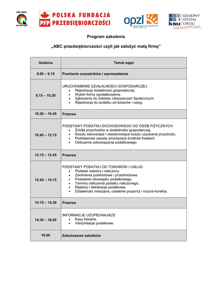 ISO 9001 ZETOM-CERT Program szkolenia „ABC przedsiębiorczości czyli jak założyć małą firmę” Temat zajęć Godzina 9.00 – 9.15 Powitanie uczestników i wprowadzenie 9.15 – 10.30 URUCHOMIENIE DZIAŁALNOŚCI GOSPODARCZEJ Rejestracja działalności gospodarczej . Wybór formy opodatkowania. Zgłoszenie do Zakładu Ubezpieczeń Społecznych. Rejestracja do podatku od towarów i usług. 10.30 – 10.45 Przerwa 10.45 – 12.15 PODSTAWY PODATKU DOCHODOWEGO OD OSÓB FIZYCZNYCH Źródła przychodów w działalności gospodarczej. Koszty stanowiące i niestanowiące koszty uzyskania przychodu. Podstawowe zasady amortyzacji środków trwałych. Obliczenie zobowiązania podatkowego. 12.15 – 12.45 Przerwa 12.45 – 14.15 PODSTAWY PODATKU OD TOWARÓW I USŁUG Podatek należny i naliczony. Zwolnienia podmiotowe i przedmiotowe. Powstanie obowiązku podatkowego. Terminy odliczenia podatku naliczonego. Rejestry i deklaracje podatkowe. Działalność mieszana, ustalenie proporcji i roczna korekta. 14.15 – 14.30 Przerwa 14.30 – 16.00 INFORMACJE UZUPEŁNIAJĄCE Kasy fiskalne. Interpretacje podatkowe. 16.00 Zakończenie szkolenia