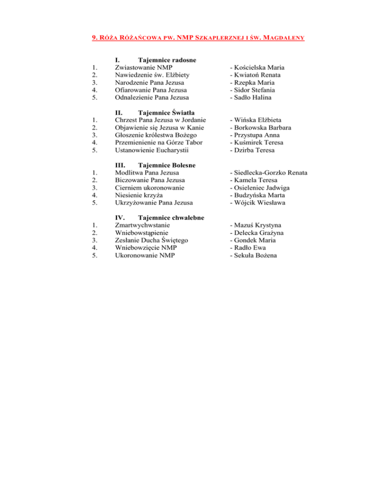 9. RÓŻA RÓŻAŃCOWA PW. NMP SZKAPLERZNEJ I ŚW. MAGDALENY 1. 2. 3. 4. 5. I. Tajemnice radosne Zwiastowanie NMP Nawiedzenie św. Elżbiety Narodzenie Pana Jezusa Ofiarowanie Pana Jezusa Odnalezienie Pana Jezusa - Kościelska Maria - Kwiatoń Renata - Rzepka Maria - Sidor Stefania - Sadło Halina 1. 2. 3. 4. 5. II. Tajemnice Światła Chrzest Pana Jezusa w Jordanie Objawienie się Jezusa w Kanie Głoszenie królestwa Bożego Przemienienie na Górze Tabor Ustanowienie Eucharystii - Wińska Elżbieta - Borkowska Barbara - Przystupa Anna - Kuśmirek Teresa - Dzirba Teresa 1. 2. 3. 4. 5. III. Tajemnice Bolesne Modlitwa Pana Jezusa Biczowanie Pana Jezusa Cierniem ukoronowanie Niesienie krzyża Ukrzyżowanie Pana Jezusa - Siedlecka-Gorzko Renata - Kamela Teresa - Osieleniec Jadwiga - Budzyńska Marta - Wójcik Wiesława 1. 2. 3. 4. 5. IV. Tajemnice chwalebne Zmartwychwstanie Wniebowstąpienie Zesłanie Ducha Świętego Wniebowzięcie NMP Ukoronowanie NMP - Mazuś Krystyna - Delecka Grażyna - Gondek Maria - Radło Ewa - Sekuła Bożena