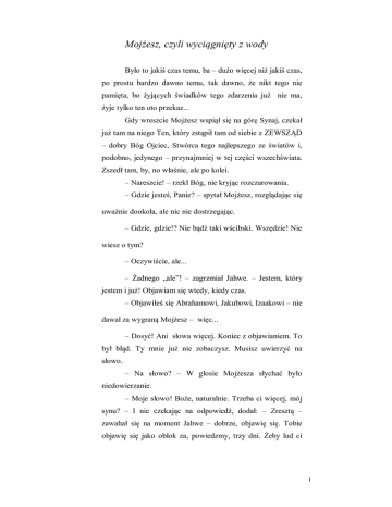 Mojżesz, czyli wyciągnięty z wody Było to jakiś czas temu, ba – dużo więcej niż jakiś czas, po prostu bardzo dawno temu, tak dawno, że nikt tego nie pamięta, bo żyjących świadków tego zdarzenia już nie ma, żyje tylko ten oto przekaz... Gdy wreszcie Mojżesz wspiął się na górę Synaj, czekał już tam na niego Ten, który zstąpił tam od siebie z ZEWSZĄD – dobry Bóg Ojciec, Stwórca tego najlepszego ze światów i, podobno, jedynego – przynajmniej w tej części wszechświata. Zszedł tam, by, no właśnie, ale po kolei. – Nareszcie! – rzekł Bóg, nie kryjąc rozczarowania. – Gdzie jesteś, Panie? – spytał Mojżesz, rozglądając się uważnie dookoła, ale nic nie dostrzegając. – Gdzie, gdzie!? Nie bądź taki wścibski. Wszędzie! Nie wiesz o tym? – Oczywiście, ale... – Żadnego „ale”! – zagrzmiał Jahwe. – Jestem, który jestem i już! Objawiam się wtedy, kiedy czas. – Objawiłeś się Abrahamowi, Jakubowi, Izaakowi – nie dawał za wygraną Mojżesz – więc... – Dosyć! Ani słowa więcej. Koniec z objawianiem. To był błąd. Ty mnie już nie zobaczysz. Musisz uwierzyć na słowo. – Na słowo? – W głosie Mojżesza słychać było niedowierzanie. – Moje słowo! Boże, naturalnie. Trzeba ci więcej, mój synu? – I nie czekając na odpowiedź, dodał: – Zresztą – zawahał się na moment Jahwe – dobrze, objawię się. Tobie objawię się jako obłok za, powiedzmy, trzy dni. Żeby lud ci 1 uwierzył. A teraz powiedz mi, dlaczego tyle czasu zajęło ci dotarcie tutaj? Zbyt dużo go zmitrężyłeś. – Robiłem i robię wszystko, co w mojej mocy... – Być może za mało. – Jestem tylko człowiekiem... – Tego akurat nie musisz mi przypominać, wiem o tym aż za dobrze – zirytował się Jahwe. – Czas Jezusa dopiero nadejdzie. – Kogo? Jakiego... – Nie twój interes. – Wydawało mi się... – Właśnie, wydawało ci się – uciął krótko i stanowczo Bóg i zamilkł. A po chwili: – Nie mówiłem ci tego podczas ostatniego naszego spotkania na górze Horeb, ale ciekawi mnie, dlaczegoś zabił tego Egipcjanina? – Bił mojego rodaka... – Nic by mu nie było! – brutalnie przerwał mu Jahwe. – On by go nie zabił. Za to ty wszystko tym zabójstwem zepsułeś. Miałem dla ciebie całkiem inną, krótszą drogę do ziemi Kananejczyka. – Ja... nie wiedziałem... Bił go, więc... – Słowa Mojżesza rwały się. – No dobrze już, dobrze – powiedział łagodniej Jahwe, widząc jego ból i przygnębienie. – Co się stało, to się nie odstanie. Ważne, że w końcu dotarliście tutaj. I dotrzecie wkrótce tam, gdzie obiecałem wam, że dojdziecie. Wiesz, że stale jestem przy tobie i nie możesz mnie zawieść. – Wiem, Panie mój. – No! Więc nie obawiaj się trudności i przeciwności losu. Tak jak byłem przy waszym wyjściu z domu egipskiej 2 niewoli, gdzie dokonałem tych wszystkich sztuczek, tak również... – Sztuczek? – wtrącił z niedowierzaniem Mojżesz. – A coś taki zdziwiony? – Nie rozumiem... – No chyba nie wierzysz w cuda? Cudów, mój drogi, nie ma. Są jedynie sztuczki. Raz lepsze, innym razem gorsze, ale to zawsze tylko sztuczki. – Więc to wszystko to... – Uhm. Zaskoczony? – Boże mój! Trudno nie być. – W głosie Mojżesza pobrzmiewało rozczarowanie. – Nie dramatyzuj, nie jesteśmy w teatrze. – W czym? – Nieważne. Zapadło chwilowe milczenie. – Więc to wszystko to tylko sztuczki – powiedział głucho do siebie Mojżesz, jakby nadal nie wierzył w to wszystko, co usłyszał i chciał tym siebie przekonać. – I ta przemiana laski w węża... – Zgadza się – potwierdził Jahwe. – I wody w krew w Nilu też. I żaby, które zesłałem na Egipt; i plaga komarów, a potem much; i bydło, które padło, a to, które nie padło, wykończyły wrzody i pryszcze; i grad i błyskawice; a w końcu i szarańcza, która miała wykończyć to, co zdołało się uratować z poprzednich plag. – A Morze Czerwone? Przecież... – Och, to dziecinnie proste. Widzisz, jakby ci to najprościej wytłumaczyć, żebyś pojął. – Na moment Jahwe zawiesił głos. – Najkrócej mówiąc, to wpływ księżyca na ziemię. Taka mała sztuczka przy tworzeniu tej części waszego 3 wszechświata. – Jahwe nie krył zadowolenia z własnej potęgi i pomysłowości. Mojżesz słuchał tego wszystkiego z niedowierzaniem, odzierany raz po raz ze złudzeń przez tego, któremu zawierzył i któremu oddał się bezgranicznie, a który teraz z dziwną i niezrozumiałą dla niego satysfakcją brutalnie sprowadzał go z obłoków bezgranicznej wiary na ziemię. – A pierworodni synowie Egipcjan… – Ten los akurat Egipcjanie zgotowali sobie sami. Błąd w przechowywaniu zapasów ziarna, w które wdały się bardzo groźne toksyny. Zwykły pech. – Teraz wszystko rozumiem... – No widzisz że to nietrudne. W końcu wiedziałem kogo do tej misji wybieram. – Więc faraon o wszystkim wiedział – kontynuował swoją myśl Mojżesz głuchy na słowa Boga – tylko ja naiwny myślałem, że to wszystko to Twoja bezgraniczna moc czynienia cudów. – O co ci chodzi? – zapytał lekko poirytowany Jahwe, ale jego pytanie pozostało bez odpowiedzi. Mojżesz, głuchy na wszystko, ciągnął swoją dalej mowę zwątpienia, a jednocześnie i akt oskarżenia: – I dopiero jak zesłałeś noc na Egipt, która trwała trzy dni, to się wystraszył i ugiął. Więc może dlatego tak długo trwała ta nasza wędrówka do tego miejsca. Bo on, tak naprawdę, bał się Ciebie... – Co, oskarżasz mnie? Obwiniasz za to, że was wybrałem? – Nie krył coraz większej irytacji i rozczarowania Jahwe. – Że ciebie, Mojżeszu, uczyniłem mężem opatrznościowym Izraela – ludu wybranego i umiłowanego przeze mnie? Taka jest twoja zapłata – niewdzięczność?! 4 – Skądże – nieśmiało, pełen skruchy, próbował oponować Mojżesz. – Jakże bym śmiał... – O 