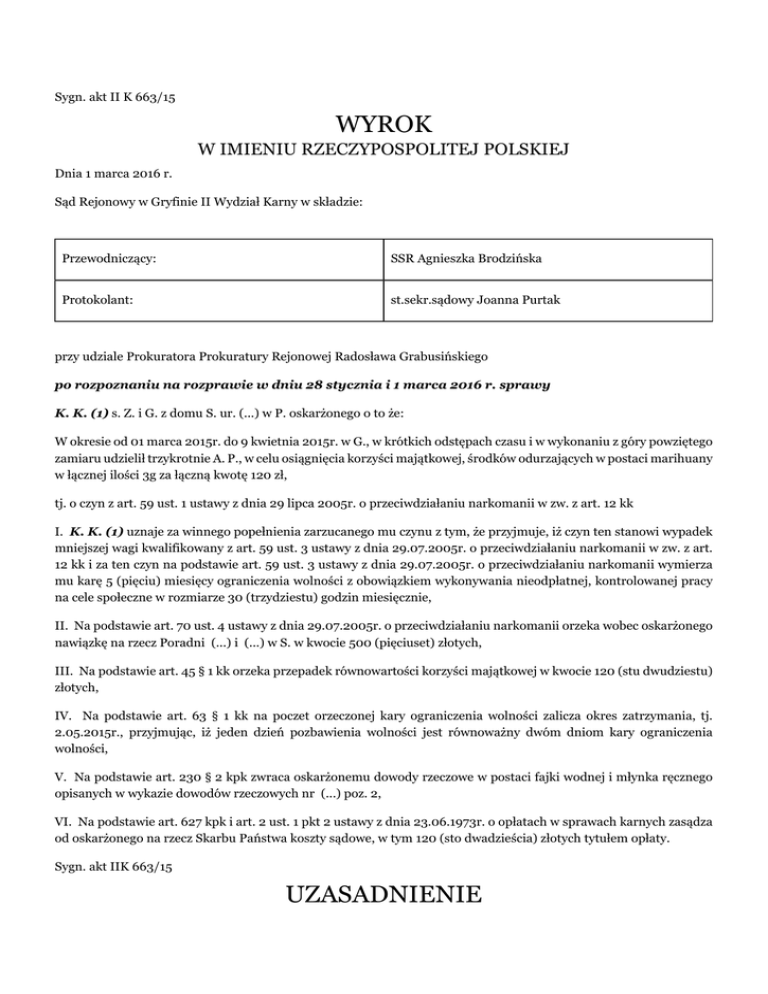 Sygn. akt II K 663/15 WYROK W IMIENIU RZECZYPOSPOLITEJ POLSKIEJ Dnia 1 marca 2016 r. Sąd Rejonowy w Gryfinie II Wydział Karny w składzie: Przewodniczący: SSR Agnieszka Brodzińska Protokolant: st.sekr.sądowy Joanna Purtak przy udziale Prokuratora Prokuratury Rejonowej Radosława Grabusińskiego po rozpoznaniu na rozprawie w dniu 28 stycznia i 1 marca 2016 r. sprawy K. K. (1) s. Z. i G. z domu S. ur. (...) w P. oskarżonego o to że: W okresie od 01 marca 2015r. do 9 kwietnia 2015r. w G., w krótkich odstępach czasu i w wykonaniu z góry powziętego zamiaru udzielił trzykrotnie A. P., w celu osiągnięcia korzyści majątkowej, środków odurzających w postaci marihuany w łącznej ilości 3g za łączną kwotę 120 zł, tj. o czyn z art. 59 ust. 1 ustawy z dnia 29 lipca 2005r. o przeciwdziałaniu narkomanii w zw. z art. 12 kk I. K. K. (1) uznaje za winnego popełnienia zarzucanego mu czynu z tym, że przyjmuje, iż czyn ten stanowi wypadek mniejszej wagi kwalifikowany z art. 59 ust. 3 ustawy z dnia 29.07.2005r. o przeciwdziałaniu narkomanii w zw. z art. 12 kk i za ten czyn na podstawie art. 59 ust. 3 ustawy z dnia 29.07.2005r. o przeciwdziałaniu narkomanii wymierza mu karę 5 (pięciu) miesięcy ograniczenia wolności z obowiązkiem wykonywania nieodpłatnej, kontrolowanej pracy na cele społeczne w rozmiarze 30 (trzydziestu) godzin miesięcznie, II. Na podstawie art. 70 ust. 4 ustawy z dnia 29.07.2005r. o przeciwdziałaniu narkomanii orzeka wobec oskarżonego nawiązkę na rzecz Poradni (...) i (...) w S. w kwocie 500 (pięciuset) złotych, III. Na podstawie art. 45 § 1 kk orzeka przepadek równowartości korzyści majątkowej w kwocie 120 (stu dwudziestu) złotych, IV. Na podstawie art. 63 § 1 kk na poczet orzeczonej kary ograniczenia wolności zalicza okres zatrzymania, tj. 2.05.2015r., przyjmując, iż jeden dzień pozbawienia wolności jest równoważny dwóm dniom kary ograniczenia wolności, V. Na podstawie art. 230 § 2 kpk zwraca oskarżonemu dowody rzeczowe w postaci fajki wodnej i młynka ręcznego opisanych w wykazie dowodów rzeczowych nr (...) poz. 2, VI. Na podstawie art. 627 kpk i art. 2 ust. 1 pkt 2 ustawy z dnia 23.06.1973r. o opłatach w sprawach karnych zasądza od oskarżonego na rzecz Skarbu Państwa koszty sądowe, w tym 120 (sto dwadzieścia) złotych tytułem opłaty. Sygn. akt IIK 663/15 UZASADNIENIE A. P. poznał K. K. (1) za pośrednictwem kolegi o nazwisku Ł. i pseudonimie (...). Mężczyzna ten poinformował A. P., że może od K. K. (1) kupować narkotyki. Odbywało się to w ten sposób, że A. P. swojemu znajomemu o pseudonimie (...) przekazywał pieniądze. Po chwili w umówione miejsce przychodził K. K. (1) i przynosił marihuanę. W okresie od 1 marca 2015 r. do 9 kwietnia 2015 r. A. P. trzykrotnie zakupił od K. K. (1) marihuanę, każdorazowo po 1 gramie, płacąc 40 zł za gram. Dowód: zeznania A. P. k.166 w zw. z k.15-15v. i k.63v. W dniu 9 kwietnia 2015 r. A. P. około godziny 12.00 spotkał w G. mężczyznę o pseudonimie (...) i przekazał mu 40 zł w celu zakupu marihuany. Umówili się pod sklepem (...). Po około 20-25 minut w umówione miejsce przyszedł K. K. (1) i przekazał A. P. 1 gram marihuany zawinięty w folię aluminiową. Około godziny 17.20 A. P. spotkał R. K. z którym zamierzali wypalić marihuanę. Około godziny 18.30 na ulicy (...) w G. funkcjonariusze KPP w G. Ł. C., J. K. i M. I. dokonali legitymowania A. P. i R. K.. U A. P. w toku przeszukania ujawnili zwitek papieru z zawartością suszu roślinnego. A. P. oświadczył, iż jest to marihuana, którą kupił w tym dniu od K. K. (1). Dowód: zeznania A. P. k.166 w zw. z k.15-15v. i k.63v. protokół przeszukania osoby k.7-8 protokół oględzin rzeczy k.18-19 opinia z badań chemicznych k.99100 notatka urzędowa k. 1 W trakcie przeszukania pomieszczenia mieszkalnego położnego w G. przy ul. (...), zajmowanego przez K. K. (1) ujawniono fajkę wodną służącą do palenia marihuany oraz plastikowy młynek pudełkowy do rozdrabniania suszu. W substancji smolistej barwy brunatno brązowej znajdującej się na powierzchni wewnętrznej fajki wodnej stwierdzono obecność ∆9 - (...), co świadczy iż używana była do palenia konopi lub produktów z nich otrzymanych. W zabrudzeniach znajdujących się wewnątrz dwuczęściowego młynka również stwierdzono obecność ∆9 - (...), co świadczy, iż był używany do rozdrabniania suszu konopi. Dowód: protokół przeszukania k.30-32 protokół oględzin k.38-41 opinia biegłego z zakresu badań chemicznych k.94-96 K. K. (1) ma 22 lata, ma wykształcenie średnie. Jest kawalerem, nie posiada nikogo na swoim utrzymaniu. Obecnie jest zatrudniony jako sprzątacz wagonów z dochodem 500 zł miesięcznie. W przeszłości był karany na terenie Niemiec za kradzież. Dowód: wyjaśnienia oskarżonego k.165 dane osobopoznawcze k. 20 dane o karalności k. 87 K. K. (1) nie przyznał się do popełnienia zarzucanego mu czynu. W toku postępowania przygotowawczego wyjaśnił, iż nie zna A. P. i podczas przesłuchania pierwszy raz usłyszał o tej osobie. Nigdy nie sprzedawał środków odurzających i ich nie zażywał. Ujawniona u niego fajka wodna i młynek służyły do palenia i mielenia tytoniu, który kupował na wagę. Nie zna osoby o nazwisku Ł., zna natomiast kolegę o pseudonimie (...). Nie kupował od niego ani nie sprzedawał mu żadnych środków odurzających. Nie załatwiał też nikomu narkotyków. Na rozprawie oskarżony dodatkowo wyjaśnił, iż pierwszy raz widział A. P. podczas konfrontacji. Świadek rozpoznał go, bo policjant na niego naciskał. Policjant krzyczał na niego, a świadek skulił głowę i powiedział, że kupił marihuanę od niego. Ujawniona fajka wodna i młynek zostały pozostawione przez kolegę, a oskarżony tych przedmiotów nie używał. Po odczytaniu wcześniejszych wyjaśnień oświadczył, iż palił tytoń z fajki, a wyjaśniał inaczej ponieważ miał na myśli, że nie 