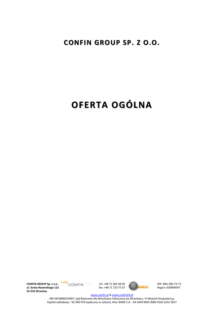 CONFIN GROUP S P . Z O.O. OFERTA OGÓLNA CONFIN GROUP Sp. z o.o. tel: +48 71 364 38 03 NIP: 894-‐296-‐73-‐73 ul. Grota-‐Roweckiego 112 fax: +48 71 723 75 37 Regon: 020909597 52-‐232 Wrocław www.confin.pl & www.confin24.pl KRS NR 0000323907, Sąd Rejonowy dla Wrocławia-‐Fabrycznej we Wrocławiu, VI Wydział Gospodarczy, Kapitał zakładowy -‐ 92.500 PLN (opłacony w całości), Alior BANK S.A. : 94 2490 0005 0000 4520 3231 5817 Szanowni Państwo, w codziennym funkcjonowaniu firmy lub JST nie ma miejsca na brak profesjonalizmu i podejmowania decyzji w nieskończoność. Pośpieszne decyzje mogą powodować niemałe konsekwencje finansowe. Sp. z o.o. jest brokerem finansowym oraz doradcą biznesowym posiadającym wieloletnie doświadczenie w obszarze finansów, tj. FAKTORINGU, LEASINGU, KREDYTÓW, DOTACJI UNIJNYCH a także obszarze consultingu np. w przygotowywaniu SPECJALISTYCZNYCH OPRACOWAŃ. Specjalizujemy się w poszukiwaniu najlepszych ofert wśród instytucji finansowych działających na polskim rynku. Wyszukujemy oferty spełniające Państwa oczekiwania pod względem jakościowym, jak i cenowym. Jako doradca biznesowy działamy na każdym etapie zarządzania w obszarze szeroko rozumianego consultingu, tworząc dla Państwa indywidualne rozwiązania i specjalistyczne opracowania. REALIZOWANE PROJEKTY Chcielibyśmy zaprezentować niektóre projekty, które były realizowane przez CONFIN GROUP Sp. z o.o. w ciągu ostatnich 2 lat. PROJEKTY UE ZAKOŃCZONE SUKCESEM Ø Ekodynamic Sp. z o.o. Sp. Komandytowa -‐ dotacja na inwestycje Ø Sprzętkom (InwazjaPC) -‐ dotacja na usługi Ø Confin Group Sp. z o.o. -‐ dotacja na inwestycje PROJEKTY DLA JST Ø Strategia Rozwoju Miasta i Gminy Kąty Wrocławskie – tworzenie całego dokumentu (w tym opis programów inwestycyjnych i możliwości pozyskiwania dotacji unijnych) oraz współpraca z Wrocławską Agencję Rozwoju Regionalnego S.A. w zakresie przygotowania Strategii. Dokument został przyjęty jednogłośnie w lutym 2009 r. Ø Ślężańska Agencja Rozwoju Regionalnego Sp. z o.o. -‐ przygotowanie projektu rozwoju firmy z wykorzystaniem dotacji unijnych. Ø Aktualnie opracowywany Program Rozwoju Dróg Gminnych dla Gminy Siechnice. PROJEKTY ZREALIZOWANE W OKRESIE OSTATNICH 6 MIESIĘCY: Ø Przygotowanie wniosku UE „Paszport do Eksportu” dla Ekodynamic Sp. z o.o. Sp. Komandytowa Ø Przygotowanie wniosku UE „Wspieranie działalności gospodarczej w dziedzinie gospodarki elektronicznej” dla DCC Marcin Wieszczeczyński Ø Stworzenie Analizy Finansowej dla projektu UE 8.3 „ Przeciwdziałanie wykluczeniu cyfrowemu – enclusion” oraz napisanie wniosku UE dla Gminy Książ Wielki CONFIN GROUP Sp. z o.o. tel: +48 71 364 38 03 NIP: 894-‐296-‐73-‐73 ul. Grota-‐Roweckiego 112 fax: +48 71 723 75 37 Regon: 020909597 52-‐232 Wrocław www.confin.pl & www.confin24.pl KRS NR 0000323907, Sąd Rejonowy dla Wrocławia-‐Fabrycznej we Wrocławiu, VI Wydział Gospodarczy, Kapitał zakładowy -‐ 92.500 PLN (opłacony w całości), Alior BANK S.A. : 94 2490 0005 0000 4520 3231 5817 Ø Stworzenie Analizy Finansowej dla projektu UE 8.3 „ Przeciwdziałanie wykluczeniu cyfrowemu – enclusion” oraz napisanie wniosku UE dla Gminy Gąsawa Ø Stworzenie Analizy Finansowej dla projektu UE 8.3 „ Przeciwdziałanie wykluczeniu cyfrowemu – enclusion” oraz napisanie wniosku UE dla firmy konsultingowej, która umieściła te opracowania na stronach www.uke.gov.pl Ø Przygotowanie wniosku UE „Tworzenie i Rozwój Mikroprzedsiębiorstw” oraz Ekonomiczny Plan Operacji dla Factory Fitness Kamila Ludwikowska Ø Opracowanie strategii rozwoju firmy oraz analizy finansowej a także poszukiwanie źródeł finansowania dla największego w Polsce parku rozrywki rodzinnej (www.bobolandia.com.pl ) Ø Opracowanie dotyczące możliwości pozyskania funduszy unijnych dla WAGO ELWAG Sp. z o.o. Ø Inne opracowania z zakresu poszukiwania finansowania dla firm (factoring, kredyt, leasing) Ø Opracowanie wniosku na Modernizację Gospodarstwa Rolniczego. KREDYT, LEASING I FAKTORING W CONFIN GROUP SP. Z O.O. KREDYT – jest jednym z najczęściej stosowanych instrumentów finansowych zaliczanych do zewnętrznych źródeł finansowania. Służą finansowaniu potrzeb rozwojowych, jak i działalności bieżącej. Przez umowę bank zobowiązuje się oddać do dyspozycji kredytobiorcy na czas oznaczony w umowie określoną kwotę środków pieniężnych (na określony cel), a kredytobiorca zobowiązuje się do korzystania z niej na warunkach określonych w umowie, zwrotu kwoty wykorzystanego kredytu wraz z odsetkami w oznaczonych terminach spłaty oraz zapłaty prowizji od udzielonego kredytu. LEASING – jest umownym stosunkiem cywilnoprawnym. W ramach leasingu jedna ze stron (finansujący, leasingodawca) przekazuje drugiej stronie (korzystającemu, leasingobiorcy) prawo do korzystania z określonego dobra materialnego na pewien uzgodniony w umowie leasingu okres, w zamian za ustalone raty leasingowe. Na raty leasingowe składają się składnik kapitałowy odzwierciedlający wartość dobra materialnego przypadającego na okres leasingu i składnik odsetkowy stanowiący wynagrodzenia dla leasingodawcy. FAKTORING – jest jedną z form finansowania działalności przedsiębiorstwa. Polega on na wykupieniu przez faktora (bank lub wyspecjalizowaną instytucję finansową) nieprzeterminowanych faktur wystawionych przez Państwa przedsiębiorstwo. Dzięki transakcji pieniądze natychmiast trafiają na konto. FAKTORING -‐ to także kompleksowa usługa związana m.in. z: o weryfikacją dłużników (usługa dostosowana do specyfiki branży) o pomocą w odzyskiwaniu przeterminowanych należności o zarządzaniu wierzytelnościami o monitorowaniem spłat o prowadzeniem kont rozliczeniowych o doradztwem w wyjaśnianiu kwestii spornych CONFIN GROUP Sp. z o.o. tel: +48 71 364 38 03 NIP: 894-‐296-‐73-‐73 ul. Grota-‐Roweckiego 112 fax: +48 71 723 75