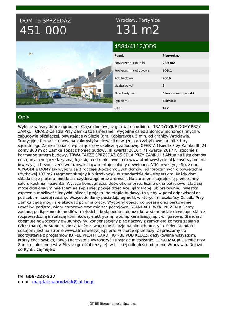 Wrocław, Partynice DOM na SPRZEDAŻ 131 m2 451 000 4584/4112/ODS Rynek Pierwotny Powierzchnia działki 239 m2 Powierzchnia użytkowa 103.1 Rok budowy 2016 Liczba pokoi 5 Stan budynku Stan deweloperski Typ domu Bliźniak Gaz Tak Opis Wybierz własny dom z ogrodem! Część domów już gotowa do odbioru! TRADYCYJNE DOMY PRZY ZAMKU TOPACZ Osiedla Przy Zamku to kameralne i wygodne osiedla domów jednorodzinnych w zabudowie bliźniaczej, powstające w Ślęzie (gm. Kobierzyce), 5 min. od granicy Wrocławia. Tradycyjna forma i stonowana kolorystyka elewacji nawiązują do zabytkowej architektury sąsiedniego Zamku Topacz, wpisując się w okoliczną zabudowę. OFERTA Osiedle Przy Zamku III: 24 domy 800 m od Zamku Topacz Koniec budowy: III kwartał 2016 r. / I kwartał 2017 r., zgodnie z harmonogramem budowy. TRWA TAKŻE SPRZEDAŻ OSIEDLA PRZY ZAMKU II! Aktualna lista domów dostępnych w sprzedaży znajduje się na stronie inwestora www.atminwestycje.pl Jakość wykonania inwestycji i bezpieczeństwo transakcji gwarantuje solidny deweloper, ATM Inwestycje Sp. z o.o. WYGODNE DOMY Do wyboru są 2 rodzaje 3-poziomowych domów jednorodzinnych o powierzchni użytkowej 103 m2 (segment skrajny lub środkowy), w standardzie deweloperskim. Każdy dom składa się z parteru, poddasza użytkowego oraz antresoli. Na parterze znajduje się przestronny salon, kuchnia i łazienka. Wyższa kondygnacja, doświetlona przez liczne okna połaciowe, stać się może doskonałym miejscem na sypialnię, pokoje dziecięce, garderobę lub pracownię. Inwestor zapewnia możliwość indywidualizacji projektu na etapie budowy, tak, aby w pełni odpowiadał on potrzebom każdej rodziny. Wszystkie domy posiadają ogródki, w których mieszkańcy Osiedla Przy Zamku będą mogli zrelaksować po dniu pracy. Wygodny dojazd do posesji oraz parkowanie umożliwi podjazd, wiaty garażowe oraz miejsca postojowe. STANDARD WYKOŃCZENIA Domy zostaną podłączone do mediów miejskich i będą oddane do użytku w standardzie deweloperskim z rozprowadzoną instalacją kominkową, elektryczną, wodną, kanalizacyjną, c-o i gazową. Standard obejmuje nowoczesny dwufunkcyjny, kondensacyjny piec gazowy z zamkniętą komorą spalania (Viessmann). W standardzie są także zewnętrzne żaluzje na oknach prostych. Pełen standard dostępny jest na stronie www.atminwestycje.pl oraz w biurze sprzedaży. Zapraszamy do skorzystania z programów JOT-BE PROFIT CARD I JOT-BE POD KLUCZ, dedykowane wszystkim, którzy chcą szybko, łatwo i korzystnie wykończyć i urządzić mieszkanie. LOKALIZACJA Osiedle Przy Zamku położone jest w Ślęzie (gm. Kobierzyce), w bliskiej odległości od granic Wrocławia. Dojazd do Rynku zajmuje o tel. 609-222-527 email: [email protected] JOT-BE Nieruchomości Sp.z o.o. JOT-BE Nieruchomości Sp.z o.o. Powered by TCPDF (www.tcpdf.org)
