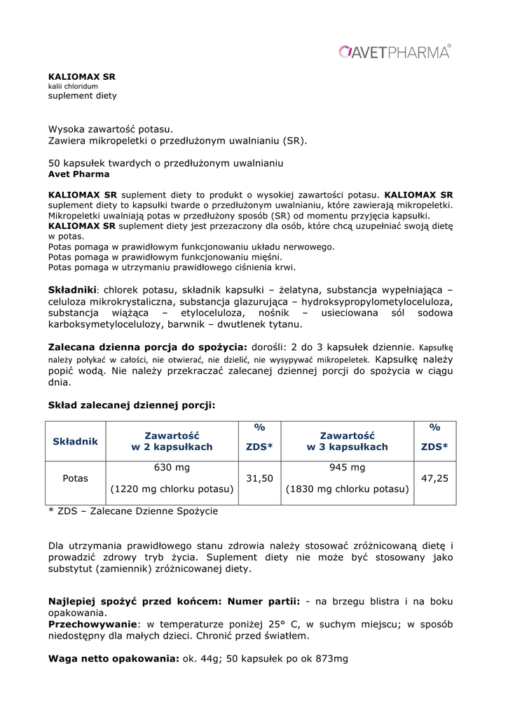 KALIOMAX SR kalii chloridum suplement diety Wysoka zawartość potasu. Zawiera mikropeletki o przedłużonym uwalnianiu (SR). 50 kapsułek twardych o przedłużonym uwalnianiu Avet Pharma KALIOMAX SR suplement diety to produkt o wysokiej zawartości potasu. KALIOMAX SR suplement diety to kapsułki twarde o przedłużonym uwalnianiu, które zawierają mikropeletki. Mikropeletki uwalniają potas w przedłużony sposób (SR) od momentu przyjęcia kapsułki. KALIOMAX SR suplement diety jest przezaczony dla osób, które chcą uzupełniać swoją dietę w potas. Potas pomaga w prawidłowym funkcjonowaniu układu nerwowego. Potas pomaga w prawidłowym funkcjonowaniu mięśni. Potas pomaga w utrzymaniu prawidłowego ciśnienia krwi. Składniki: chlorek potasu, składnik kapsułki – żelatyna, substancja wypełniająca – celuloza mikrokrystaliczna, substancja glazurująca – hydroksypropylometyloceluloza, substancja wiążąca – etyloceluloza, nośnik – usieciowana sól sodowa karboksymetylocelulozy, barwnik – dwutlenek tytanu. Zalecana dzienna porcja do spożycia: dorośli: 2 do 3 kapsułek dziennie. Kapsułkę należy połykać w całości, nie otwierać, nie dzielić, nie wysypywać mikropeletek. Kapsułkę należy popić wodą. Nie należy przekraczać zalecanej dziennej porcji do spożycia w ciągu dnia. Skład zalecanej dziennej porcji: Składnik Potas Zawartość w 2 kapsułkach 630 mg (1220 mg chlorku potasu) % ZDS* 31,50 Zawartość w 3 kapsułkach 945 mg (1830 mg chlorku potasu) % ZDS* 47,25 * ZDS – Zalecane Dzienne Spożycie Dla utrzymania prawidłowego stanu zdrowia należy stosować zróżnicowaną dietę i prowadzić zdrowy tryb życia. Suplement diety nie może być stosowany jako substytut (zamiennik) zróżnicowanej diety. Najlepiej spożyć przed końcem: Numer partii: - na brzegu blistra i na boku opakowania. Przechowywanie: w temperaturze poniżej 25° C, w suchym miejscu; w sposób niedostępny dla małych dzieci. Chronić przed światłem. Waga netto opakowania: ok. 44g; 50 kapsułek po ok 873mg Producent: AVET Pharma S.K.A ul. Fleminga 33B, 03-176 Warszawa www.avetpharma.pl Ostrzeżenie: Nie stosować w przypadku nadwrażliwości lub uczulenia na którykolwiek ze składników preparatu. Nie zaleca się stosowania preparatu dzieciom, kobietom w ciąży i karmiącym piersią.