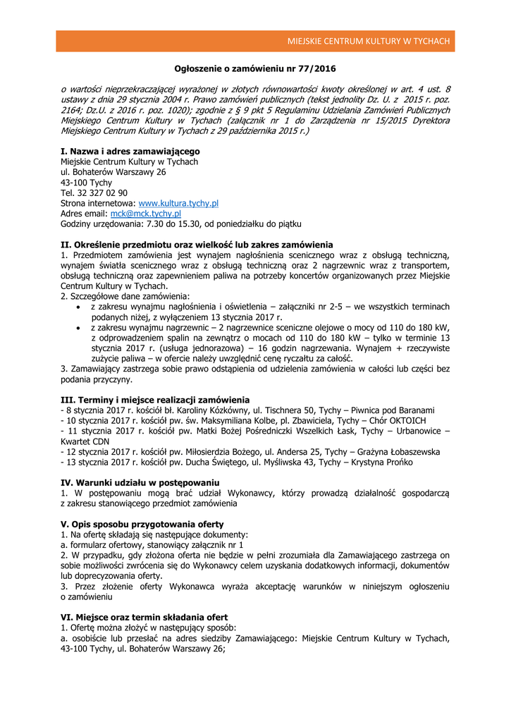 MIEJSKIE CENTRUM KULTURY W TYCHACH Ogłoszenie o zamówieniu nr 77/2016 o wartości nieprzekraczającej wyrażonej w złotych równowartości kwoty określonej w art. 4 ust. 8 ustawy z dnia 29 stycznia 2004 r. Prawo zamówień publicznych (tekst jednolity Dz. U. z 2015 r. poz. 2164; Dz.U. z 2016 r. poz. 1020); zgodnie z § 9 pkt 5 Regulaminu Udzielania Zamówień Publicznych Miejskiego Centrum Kultury w Tychach (załącznik nr 1 do Zarządzenia nr 15/2015 Dyrektora Miejskiego Centrum Kultury w Tychach z 29 października 2015 r.) I. Nazwa i adres zamawiającego Miejskie Centrum Kultury w Tychach ul. Bohaterów Warszawy 26 43-100 Tychy Tel. 32 327 02 90 Strona internetowa: www.kultura.tychy.pl Adres email: [email protected] Godziny urzędowania: 7.30 do 15.30, od poniedziałku do piątku II. Określenie przedmiotu oraz wielkość lub zakres zamówienia 1. Przedmiotem zamówienia jest wynajem nagłośnienia scenicznego wraz z obsługą techniczną, wynajem światła scenicznego wraz z obsługą techniczną oraz 2 nagrzewnic wraz z transportem, obsługą techniczną oraz zapewnieniem paliwa na potrzeby koncertów organizowanych przez Miejskie Centrum Kultury w Tychach. 2. Szczegółowe dane zamówienia: z zakresu wynajmu nagłośnienia i oświetlenia – załączniki nr 2-5 – we wszystkich terminach podanych niżej, z wyłączeniem 13 stycznia 2017 r. z zakresu wynajmu nagrzewnic – 2 nagrzewnice sceniczne olejowe o mocy od 110 do 180 kW, z odprowadzeniem spalin na zewnątrz o mocach od 110 do 180 kW – tylko w terminie 13 stycznia 2017 r. (usługa jednorazowa) – 16 godzin nagrzewania. Wynajem + rzeczywiste zużycie paliwa – w ofercie należy uwzględnić cenę ryczałtu za całość. 3. Zamawiający zastrzega sobie prawo odstąpienia od udzielenia zamówienia w całości lub części bez podania przyczyny. III. Terminy i miejsce realizacji zamówienia - 8 stycznia 2017 r. kościół bł. Karoliny Kózkówny, ul. Tischnera 50, Tychy – Piwnica pod Baranami - 10 stycznia 2017 r. kościół pw. św. Maksymiliana Kolbe, pl. Zbawiciela, Tychy – Chór OKTOICH - 11 stycznia 2017 r. kościół pw. Matki Bożej Pośredniczki Wszelkich Łask, Tychy – Urbanowice – Kwartet CDN - 12 stycznia 2017 r. kościół pw. Miłosierdzia Bożego, ul. Andersa 25, Tychy – Grażyna Łobaszewska - 13 stycznia 2017 r. kościół pw. Ducha Świętego, ul. Myśliwska 43, Tychy – Krystyna Prońko IV. Warunki udziału w postępowaniu 1. W postępowaniu mogą brać udział Wykonawcy, którzy prowadzą działalność gospodarczą z zakresu stanowiącego przedmiot zamówienia V. Opis sposobu przygotowania oferty 1. Na ofertę składają się następujące dokumenty: a. formularz ofertowy, stanowiący załącznik nr 1 2. W przypadku, gdy złożona oferta nie będzie w pełni zrozumiała dla Zamawiającego zastrzega on sobie możliwości zwrócenia się do Wykonawcy celem uzyskania dodatkowych informacji, dokumentów lub doprecyzowania oferty. 3. Przez złożenie oferty Wykonawca wyraża akceptację warunków w niniejszym ogłoszeniu o zamówieniu VI. Miejsce oraz termin składania ofert 1. Ofertę można złożyć w następujący sposób: a. osobiście lub przesłać na adres siedziby Zamawiającego: Miejskie Centrum Kultury w Tychach, 43-100 Tychy, ul. Bohaterów Warszawy 26; MIEJSKIE CENTRUM KULTURY W TYCHACH b. drogą emailową: [email protected] c. faksem: 32 327 02 91, w. 25 w terminie do 28 grudnia 2016 r., do godz. 15.00 Oferty złożone po terminie oraz oferty częściowe nie będą rozpatrywane VII. Kryteria oceny ofert i ich znaczenie 1. Przy wyborze ofert kryterium oceny stanowi: cena – 100% wagi kryterium. 2. Cena oferty musi uwzględniać wszystkie koszty realizacji zamówienia, również te, których nie można było przewidzieć w chwili składania oferty, a które mogłyby mieć wpływ na prawidłową i terminową realizację zamówienia. 3. Oferty złożone po terminie oraz oferty częściowe nie będą rozpatrywane. VIII. Miejsce i termin ogłoszenia o wyborze najkorzystniejszej oferty: Ogłoszenie o wyborze najkorzystniejszej oferty, wraz z wartościami poszczególnych ofert brutto, zostanie przesłane do Wykonawców biorących udział w postępowaniu oraz na stronie BIP Miejskiego Centrum Kultury w Tychach (bez podania wartości ofert), w zakładce: „Zamówienia publiczne” w terminie do: 29 grudnia 2016 r., do godz. 14.00 IX. Informacje dodatkowe Osobą odpowiedzialną merytorycznie za opis przedmiotu zamówienia jest: Anna Śmieszek-Szkutek, tel. +48 726 26 13 75; 32 327 02 90 w. 25 email: [email protected] X. Załączniki stanowiące integralną część ogłoszenia o zamówieniu: a. Formularz ofertowy – załącznik nr 1