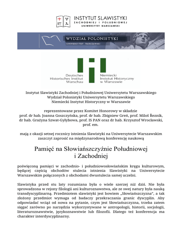 Instytut Slawistyki Zachodniej i Południowej Uniwersytetu Warszawskiego Wydział Polonistyki Uniwersytetu Warszawskiego Niemiecki Instytut Historyczny w Warszawie reprezentowane przez Komitet Honorowy w składzie prof. dr hab. Joanna Goszczyńska, prof. dr hab. Zbigniew Greń, prof. Miloš Řezník, dr hab. Grażyna Szwat-Gyłybowa, prof. IS PAN oraz dr hab. Krzysztof Wrocławski, prof. em. mają z okazji setnej rocznicy istnienia Slawistyki na Uniwersytecie Warszawskim zaszczyt zaprosić na międzynarodową konferencję naukową Pamięć na Słowiańszczyźnie Południowej i Zachodniej poświęconą pamięci w zachodnio- i południowosłowiańskim kręgu kulturowym, będącej częścią obchodów stulecia istnienia Slawistyki na Uniwersytecie Warszawskim połączonych z obchodami dwustulecia samej uczelni. Slawistyka przed stu laty rozumiana była o wiele szerzej niż dziś. Nie była sprowadzona w rejony filologii ani kulturoznawstwa, ale ze swej natury była nauką transdyscyplinarną. Przedmiotem slawistyki jest bowiem „Słowiańszczyzna”, a tak złożony przedmiot wymaga od badaczy przekraczania granic dyscyplin. Aby odpowiadać wciąż od nowa na pytanie, czym jest Słowiańszczyzna, trzeba zatem sięgać zarówno po narzędzia wykorzystywane w antropologii, historii, socjologii, literaturoznawstwie, językoznawstwie lub filozofii. Dlatego też konferencja ma charakter interdyscyplinarny. Zagadnienie pamięci stało się w ostatnich dziesięcioleciach jednym z centralnych problemów opisywanych przez humanistykę, głównie za sprawą prac takich naukowców jak Jan i Aleida Assmann, Pierre Nora, Paul Connerton czy Paul Ricoeur. Nie bez znaczenia jest tu także nadzwyczaj intensywny wśród współczesnych badaczy oddźwięk myśli Maurice’a Halbwachsa, do którego doszło w kilkadziesiąt lat po wydaniu jego pracy La Mémoire collective poświęconej społecznym ramom pamięci zbiorowej. Ponieważ obchody rocznicy powstania Slawistyki na Uniwersytecie Warszawskim oraz istnienia samego Uniwersytetu Warszawskiego są w naszym przekonaniu formą ceremonii upamiętniających, uznaliśmy, że stanowi to dobrą okazję do podjęcia refleksji nad szeroko rozumianą problematyką pamięci. Jak pisze Paul Ricoeur, w starożytnej Grecji istniały dwa słowa na oznaczenie przypominania mnēmē i anamnēsis. Pierwsze oznaczało wspomnienie jako coś, co pojawiało się całkowicie biernie, do tego stopnia, że jego doznanie charakteryzowano jako uczucie - pathos. Mnēmē stawiało zatem pytanie „co?”, dotyczące przedmiotu treści. W drugim przypadku wspomnienie rozumiano jako obiekt poszukiwania, zwanego zazwyczaj przypominaniem, przywoływaniem, które wymaga aktywności podmiotu. Nasuwa się zatem pytanie o to, „kto?” pamięta. W nowszej tradycji filozoficznej określone ono zostało przez Henriego Bergsona jako „przywoływanie pracochłonne” posiadające rozmyślną formę. W tym sensie na plan pierwszy wysuwa się ten aspekt formy pamięci, w którym kluczowym jest pytanie „jak?”. Chcielibyśmy zatem, żeby konferencja stała się okazją do zaprezentowania tego, jak różne perspektywy współczesnych badań wykorzystywanych w studiach slawistycznych slawistyce poszukują odpowiedzi na pytania: kto, co i jak pamięta? Należy przy tym zauważyć, że badania pamięcioznawcze na Słowiańszczyźnie borykają się z problemem recepcji. Chodzi tu zarówno o brak recepcji oryginalnych koncepcji wypracowanych w krajach słowiańskich na forum międzynarodowym, jak też o opóźnienia wynikające z barier w przyswajaniu teorii powstałych na gruncie zachodniej humanistyki. Nie bez znaczenia jest też wewnętrzna bariera między poszczególnymi państwami zachodnio- i południowosłowiańskimi. Chcielibyśmy, żeby konferencja stała się również okazją do podjęcia metarefleksji nad ograniczeniami i trudnościami w badaniach nad pamięcią, na jakie napotykają się badacze skoncentrowani na obszarze Słowiańszczyzny. Udział w konferencji w roli key speakers zapowiedzieli już prof. Miroslav Hroch (Praga), prof. Ivan Čolović (Belgrad) oraz prof. Marie-Janine Calic (Monachium). Termin: 27-28.11.2015 Miejsce: Stara Biblioteka Uniwersytecka, Uniwersytet Warszawski, Warszawa, Polska Proponowane zagadnienia: Słowiańskie pamięci i pamiętanie: co się pamięta na Słowiańszczyźnie? - o słowiańskich przedmiotach pamięci; kto pamięta na Słowiańszczyźnie? - jednostka, grupa, badacz, historiografia versus uczestnicy procesu historycznego; jak się pamięta na Słowiańszczyźnie? - kultura pamięci w krajach słowiańskich, przywracanie pamięci, pamięć w ruchu: pamiętanie a kulturowe przetworzenia, przekształcanie pamięci zastanej, kreowanie pamięci: tradycje wynalezione, tradycje odnalezione, pamięć i język, język pamięci. Teorie pamięci na Słowiańszczyźnie: koncepcje pamięcioznawcze w krajach słowiańskich: oryginalne idee czy bezwolna recepcja?; bariery komunikacyjne między naukowcami zajmującymi się pamięcią w krajach słowiańskich i na Zachodzie: przyczyny, skutki, propozycje rozwiązań?; przyczyny popularności niektórych koncepcji pamięcioznawczych na obszarze Słowiańszczyzny: recepcja i przetworzenia; najważniejsi pamięcioznawcy z krajów słowiańskich: recepcja ich myśli w kraju i za granicą; czy istnieje jakikolwiek paradygmat pamięcioznawczy w krajach słowiańskich?; najbardziej popularne koncepcje w badaniach pamięci w krajach zachodnioi południowosłowiańskich: przyczyny, porównanie przypadków poszczególnych krajów, określenie, w jakich case studies są używane i dlaczego. Forma konferencji: przyjęci po analizie abstraktów referenci zostaną poproszeni o wcześniej rozwinięte abstrakty w języku angielskim zawierające główne tezy ich wystąpień, tak by i inni uczestnicy panelu mogli się z nimi zapoznać. W ten sposób chcielibyśmy uzyskać żywą i interesującą dyskusję na zaproponowane przez 
