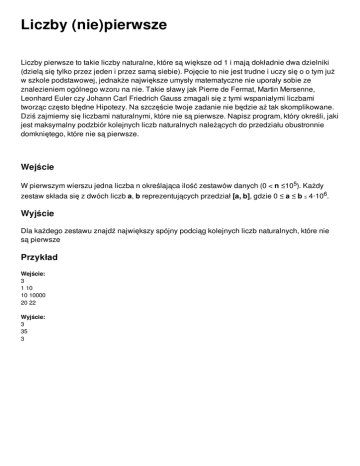 Liczby (nie)pierwsze Liczby pierwsze to takie liczby naturalne, które są większe od 1 i mają dokładnie dwa dzielniki (dzielą się tylko przez jeden i przez samą siebie). Pojęcie to nie jest trudne i uczy się o o tym już w szkole podstawowej, jednakże największe umysły matematyczne nie uporały sobie ze znalezieniem ogólnego wzoru na nie. Takie sławy jak Pierre de Fermat, Martin Mersenne, Leonhard Euler czy Johann Carl Friedrich Gauss zmagali się z tymi wspaniałymi liczbami tworząc często błędne Hipotezy. Na szczęście twoje zadanie nie będzie aż tak skomplikowane. Dziś zajmiemy się liczbami naturalnymi, które nie są pierwsze. Napisz program, który określi, jaki jest maksymalny podzbiór kolejnych liczb naturalnych należących do przedziału obustronnie domkniętego, które nie są pierwsze. Wejście W pierwszym wierszu jedna liczba n określająca ilość zestawów danych (0 < n ≤105). Każdy zestaw składa się z dwóch liczb a, b reprezentujących przedział [a, b], gdzie 0 ≤ a ≤ b ≤ 4⋅106. Wyjście Dla każdego zestawu znajdź największy spójny podciąg kolejnych liczb naturalnych, które nie są pierwsze Przykład Wejście: 3 1 10 10 10000 20 22 Wyjście: 3 35 3