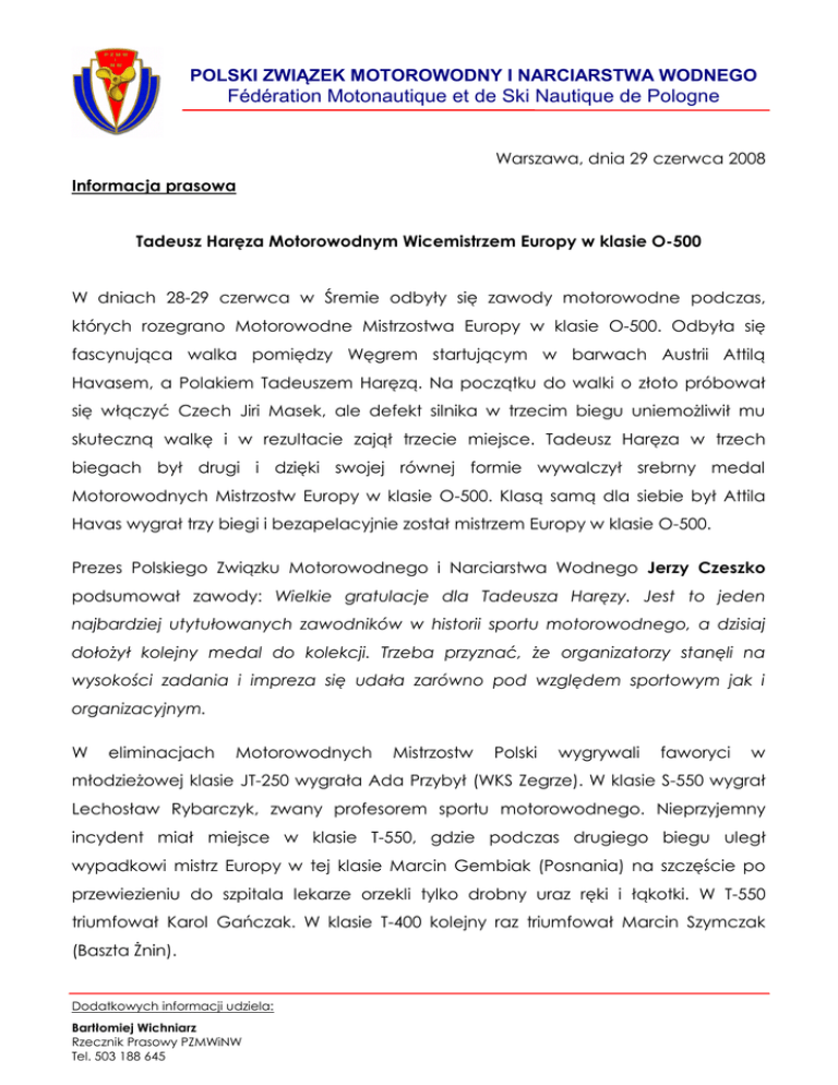 POLSKI ZWIĄZEK MOTOROWODNY I NARCIARSTWA WODNEGO Fédération Motonautique et de Ski Nautique de Pologne Warszawa, dnia 29 czerwca 2008 Informacja prasowa Tadeusz Haręza Motorowodnym Wicemistrzem Europy w klasie O-500 W dniach 28-29 czerwca w Śremie odbyły się zawody motorowodne podczas, których rozegrano Motorowodne Mistrzostwa Europy w klasie O-500. Odbyła się fascynująca walka pomiędzy Węgrem startującym w barwach Austrii Attilą Havasem, a Polakiem Tadeuszem Haręzą. Na początku do walki o złoto próbował się włączyć Czech Jiri Masek, ale defekt silnika w trzecim biegu uniemożliwił mu skuteczną walkę i w rezultacie zajął trzecie miejsce. Tadeusz Haręza w trzech biegach był drugi i dzięki swojej równej formie wywalczył srebrny medal Motorowodnych Mistrzostw Europy w klasie O-500. Klasą samą dla siebie był Attila Havas wygrał trzy biegi i bezapelacyjnie został mistrzem Europy w klasie O-500. Prezes Polskiego Związku Motorowodnego i Narciarstwa Wodnego Jerzy Czeszko podsumował zawody: Wielkie gratulacje dla Tadeusza Haręzy. Jest to jeden najbardziej utytułowanych zawodników w historii sportu motorowodnego, a dzisiaj dołożył kolejny medal do kolekcji. Trzeba przyznać, że organizatorzy stanęli na wysokości zadania i impreza się udała zarówno pod względem sportowym jak i organizacyjnym. W eliminacjach Motorowodnych Mistrzostw Polski wygrywali faworyci w młodzieżowej klasie JT-250 wygrała Ada Przybył (WKS Zegrze). W klasie S-550 wygrał Lechosław Rybarczyk, zwany profesorem sportu motorowodnego. Nieprzyjemny incydent miał miejsce w klasie T-550, gdzie podczas drugiego biegu uległ wypadkowi mistrz Europy w tej klasie Marcin Gembiak (Posnania) na szczęście po przewiezieniu do szpitala lekarze orzekli tylko drobny uraz ręki i łąkotki. W T-550 triumfował Karol Gańczak. W klasie T-400 kolejny raz triumfował Marcin Szymczak (Baszta Żnin). Dodatkowych informacji udziela: Bartłomiej Wichniarz Rzecznik Prasowy PZMWiNW Tel. 503 188 645 POLSKI ZWIĄZEK MOTOROWODNY I NARCIARSTWA WODNEGO Fédération Motonautique et de Ski Nautique de Pologne Następne motorowodne zawody odbędą się w Zbąszyniu w dniach 6-7 września, a odbędą się Motorowodne Mistrzostwa Europy S-550 oraz Motorowodne Mistrzostwa Polski O-125, T-550, T-400 oraz OSY-400. WYNIKI: Motorowodne Mistrzostwa Europy w klasie O-500: 1. Attila Havas (Austria) 2. Tadeusz Haręza (Polska) 3. Jiri Masek (Czechy) Eliminacja Motorowodnych Mistrzostw Polski JT-250: 1. Ada Przybył (WKS Zegrze) 2. Maciej Wojewódzki (WKS Zegrze) 3. Piotr Kowalski (WKS Zegrze) Eliminacje Motorowodnych Mistrzostw Polski S-550: 1. Lechosław Rybarczyk (Posnania) 2. Łukasz Ciołek (Ślizg Szczecin) 3. Adam Łabędzki (Austria) Eliminacje Motorowodnych Mistrzostw Polski T-400 1. Marcin Szymczyk (Baszta Żnin) 2. Marcin Mucha (Posnania) 3. Jacek Kołpaczyński (Ślizg Szczecin) Eliminacje Motorowodnych Mistrzostw Polski T-550 1. Karol Gańczak (Austria) 2. Krzysztof Śniadecki (Baszta Żnin) 3. Michał Gembiak (Posnania) Informacje o PZMWiNW: O-500 Silnik: o pojemności do 500 ccm, Typ kadłuba: Katamaran, Waga kadłuba: min. 180kg, Waga razem z pilotem: min. 260kg, Polski Związek Motorowodny i Narciarstwa Wodnego to organizacja pozarządowa działająca na podstawie ustawy o stowarzyszenia i sporcie kwalifikowanym. Jest Dodatkowych informacji udziela: Bartłomiej Wichniarz Rzecznik Prasowy PZMWiNW Tel. 503 188 645 POLSKI ZWIĄZEK MOTOROWODNY I NARCIARSTWA WODNEGO Fédération Motonautique et de Ski Nautique de Pologne członkiem międzynarodowych organizacji UIM (Union International Motonautique) oraz IWSF (International Water Ski Federation). PZMWiNW działa na rzecz sportu motorowodnego i narciarstwa wodnego. Dodatkowych informacji udziela: Bartłomiej Wichniarz Rzecznik Prasowy PZMWiNW Tel. 503 188 645