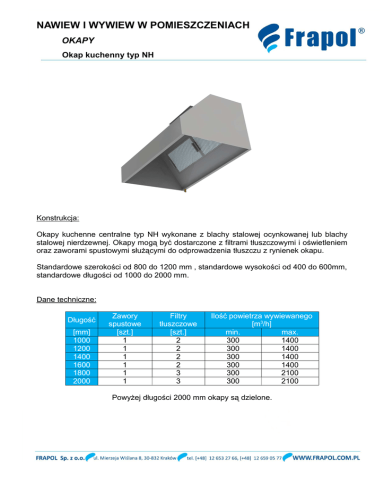 NAWIEW I WYWIEW W POMIESZCZENIACH OKAPY Okap kuchenny typ NH Konstrukcja: Okapy kuchenne centralne typ NH wykonane z blachy stalowej ocynkowanej lub blachy stalowej nierdzewnej. Okapy mogą być dostarczone z filtrami tłuszczowymi i oświetleniem oraz zaworami spustowymi służącymi do odprowadzenia tłuszczu z rynienek okapu. Standardowe szerokości od 800 do 1200 mm , standardowe wysokości od 400 do 600mm, standardowe długości od 1000 do 2000 mm. Dane techniczne: Długość [mm] 1000 1200 1400 1600 1800 2000 Zawory spustowe [szt.] 1 1 1 1 1 1 Filtry tłuszczowe [szt.] 2 2 2 2 3 3 Ilość powietrza wywiewanego [m3/h] min. max. 300 1400 300 1400 300 1400 300 1400 300 2100 300 2100 Powyżej długości 2000 mm okapy są dzielone. NAWIEW I WYWIEW W POMIESZCZENIACH OKAPY Okap kuchenny typ NH Waga okapu NH [kg] szerokość x wysokość 800 x 400 800 x 500 800 x 600 900 x 400 900 x 500 900 x 600 1000 x 400 1000 x 500 1000 x 600 1100 x 400 1100 x 500 1100 x 600 1200 x 400 1200 x 500 1200 x 600 długość 1m długość 2 m 27 44 29 48 31 52 29 48 31 52 33 56 31 52 33 56 35 60 33 56 35 60 37 64 35 60 37 64 39 68 NAWIEW I WYWIEW W POMIESZCZENIACH OKAPY Okap kuchenny typ NH Przykład zamówienia: