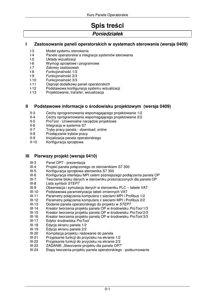 Kurs Panele Operatorskie Spis tre ci Poniedziałek I Zastosowanie paneli operatorskich w systemach sterowania (wersja 0409) I-3 I-4 I-5 I-6 I-7 I-8 I-9 I-10 I-11 I-12 I-13 II Podstawowe informacje o rodowisku projektowym (wersja 0409) II-3 II-4 II-5 II-6 II-7 II-8 II-9 II-10 III Model systemu sterowania Panele operatorskie a integracja systemów sterowania Układy wizualizacji Wymogi sprz towe i programowe Zakresy zastosowa Funkcjonalno 1/3 Funkcjonalno 2/3 Funkcjonalno 3/3 Osprz t dodatkowy paneli operatorskich Podstawowa konfiguracja systemu wizualizacji Projektowanie, transfer, wizualizacja Cechy oprogramowania wspomagaj cego projektowanie 1/2 Cechy oprogramowania wspomagaj cego projektowanie 2/2 ProTool - Uniwersalne narz dzie projektowe Integracja w systemie S7 Tryby pracy panela - download, online Przeł czanie trybów pracy Inicjalizacja panela operatorskiego Konfiguracja sprz towa Pierwszy projekt (wersja 0410) III-3 III-4 III-5 III-6 III-7 III-8 III-9 III-10 III-11 III-12 III-13 III-14 III-15 III-16 III-17 III-18 III-19 III-20 III-21 III-22 III-23 III-24 Panel OP7 - prezentacja Projekt panela poł czonego ze sterownikiem S7 300 Konfiguracja sprz towa sterownika S7 300 Konfiguracja interfejsu MPI celem pó niejszego podł czenia panela OP Tworzenie bloku danych w sterowniku przeznaczonych dla panela OP Lista symboli STEP7 Obserwacja i symulacja danych w sterowniku PLC – tabele VAT Podstawowa parametryzacja tabeli zmiennych VAT Parametry poł czenia komputera z sieciami MPI i Profibus 1/2 Parametry poł czenia komputera z sieciami MPI i Profibus 2/2 Dodanie panela operatorskiego do projektu w STEP7 Kreator tworzenia projektu panela OP w rodowisku ProTool 1/3 Kreator tworzenia projektu panela OP w rodowisku ProTool 2/3 Kreator tworzenia projektu panela OP w rodowisku ProTool 3/3 Edytor rodowiska ProTool Edycja ekranu panela 1/2 Edycja ekranu panela 2/2 Kompilacja projektu i ładowanie do panela Przypisanie funkcji do przycisku na ekranie 1/2 Przypisanie funkcji do przycisku na ekranie 2/2 ZADANIE „Stworzenie projektu dla panela OP7” Etapy tworzenia projektu panela operatorskiego - podsumowanie 0-1 Kurs Panele Operatorskie IV Oprogramowanie ProTool - interfejs u ytkownika (wersja 0409) IV-3 IV-4 IV-5 IV-6 IV-7 IV-8 IV-9 IV-10 IV-11 IV-12 IV-13 IV-14 IV-15 IV-16 IV-17 IV-18 IV-19 IV-20 IV-21 IV-22 IV-23 IV-24 IV-25 IV-26 IV-27 IV-28 IV-29 V Interfejs u ytkownika 1/2 Interfejs u ytkownika 2/2 Edytor ekranów Edytor zdarze i alarmów Receptury Edytor zmiennych Listy tekstowe i graficzne Ustawienia główne kanału komunikacyjnego Obszary wymiany danych ze sterownikiem Omówienie menu programu – „Menu File” 1/3 Omówienie menu programu – „Menu File” 2/3 Omówienie menu programu – „Menu File” 3/3 Katalogi z projektem w przypadku rodowiska zintegrowanego ze STEP 7 Ładowanie projektu do panela 1/2 Ładowanie projektu do panela 2/2 Pobranie danych o konfiguracji z panela operatorskiego Manager projektu – ProTool niezintegrowany z pakietem STEP 7 Omówienie menu programu – „Menu Edit” Omówienie menu programu – „Menu View” Omówienie menu programu – „Menu Insert” Omówienie menu programu – „Menu System” Omówienie menu programu – „Menu Options” Omówienie menu programu – „Menu Window” i „Help” Przenoszenie obiektów Menu – grupowanie funkcji Przykładowe projekty Standardowe ekrany Ekran panela operatorskiego (wersja 0410) V-3 V-4 V-5 V-6 V-7 V-8 V-9 V-10 V-11 V-12 V-13 V-14 V-15 V-16 V-17 V-18 V-19 V-20 V-21 V-22 V-23 V-24 V-25 V-26 V-27 V-28 V-29 V-30 V-31 Elementy statyczne i dynamiczne ekranu Typy ekranów Edytory ekranów Ekran panela OP7 Teksty pomocy powi zane z podekranami Panel OP7 - klawiatura Klawiatura panela OP7 1/3 Klawiatura panela OP7 2/3 Klawiatura panela OP7 3/3 Komunikaty i ekrany u ytkownika w panelu OP7 Hierarchia ekranów panela - omówienie Hierarchia ekranów panela – funkcja otwieraj ca katalog Parametry ekranu - General Parametry ekranu - Help text Ekran panela OP37 Klawiatura panela OP37 1/3 Klawiatura panela OP37 2/3 Klawiatura panela OP37 3/3 Mo liwo ci selekcji ekranów 1/2 Mo liwo ci selekcji ekranów 2/2 Funkcje do selekcji ekranów panela tekstowego Funkcje do selekcji ekranów innych paneli Klawisze funkcyjne/programowe Klawisze funkcyjne – mo liwo ci parametryzacji 1/3 Klawisze funkcyjne – mo liwo ci parametryzacji 2/3 Klawisze funkcyjne – mo liwo ci parametryzacji 3/3 ZADANIE „Zmiana ekranów na panelu OP7” ZADANIE „Wydruk ekranu panela na drukark ” ZADANIE „Menu hierarchiczne” 0-2 Kurs Panele Operatorskie Wtorek VI Definicja zmiennych (wersja 0410) VI-3 VI-4 VI-5 VI-6 VI-7 VI-8 VI-9 VI-10 VI-11 VI-12 VI-13 VI-14 VI-15 VI-16 VI-17 VI-18 VI-19 VI-20 VI-21 VI-22 VI-23 VII Definicja zmiennej Rodzaje zmiennych w ProTool Typy danych wykorzystywanych w panelach Wykorzystanie zmiennych Definicja zmiennej 1/2 Definicja zmiennej 2/2 Sposoby prezentacji zmiennej w polu edycyjnym 1/2 Sposoby prezentacji zmiennej w polu edycyjnym 2/2 Warto ci graniczne Liczby ułamkowe zapisywane w formacie stałoprzecinkowym Przypisanie funkcji do zmiennej Warto ci pocz tkowe Aktualizacja zmiennych Archiwizacja warto ci zmiennych 1/2 Archiwizacja warto ci zmiennych 2/2 Skalowanie Dodanie pola edycyjnego do ekranu panela 1 Dodanie pola edycyjnego do ekranu panela 2 ZADANIE „Definicje zmiennych” ZADANIE „Prezentacja ró nych typów zmiennych” ZADANIE „Wykorzystanie listy referencyjnej” Przegl d paneli operatorskich firmy SIEMENS (wersja 0410) VII-3 VII-4 VII-5 VII-6 VII-7 VII-8 VII-9 VII-10 VIII Dokumentacja dotycz ca paneli – katalogi, dokumentacja Panele-przyciski Panele micro Panele tekstowe Panele graficzne Panele dotykowe Multi-panele Panele PC Wersje j zykowe projektów (wersja 0409) VIII-3 VIII-4 VIII-5 VIII-6 VIII-7 VIII-8 VIII-9 VIII-10 VIII-11 VIII-12 VIII-13 VIII-14 VIII-15 VIII-16 Poziomy j zykowe Dodawanie kolejnego j zyka do projektu Konfiguracja parametrów aktualnie ed