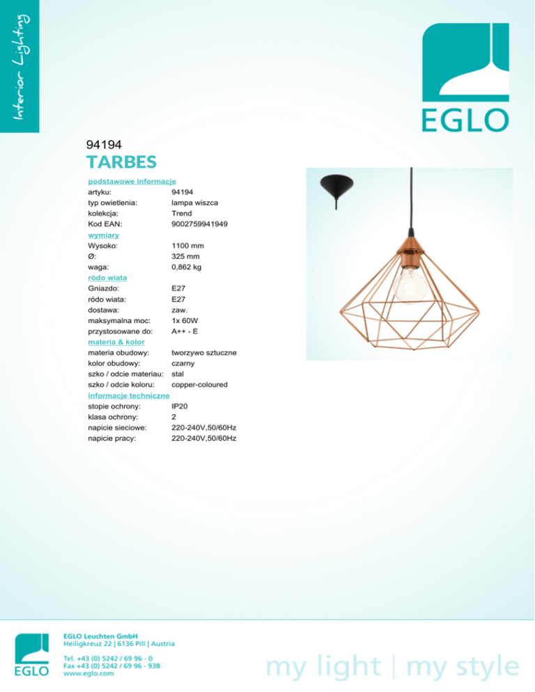 94194 TARBES podstawowe informacje artyku: 94194 typ owietlenia: lampa wiszca kolekcja: Trend Kod EAN: 9002759941949 wymiary Wysoko: 1100 mm Ø: 325 mm waga: 0,862 kg ródo wiata Gniazdo: E27 ródo wiata: E27 dostawa: zaw. maksymalna moc: 1x 60W przystosowane do: A++ - E materia & kolor materia obudowy: tworzywo sztuczne kolor obudowy: czarny szko / odcie materiau: stal szko / odcie koloru: copper-coloured informacje techniczne stopie ochrony: IP20 klasa ochrony: 2 napicie sieciowe: 220-240V,50/60Hz napicie pracy: 220-240V,50/60Hz