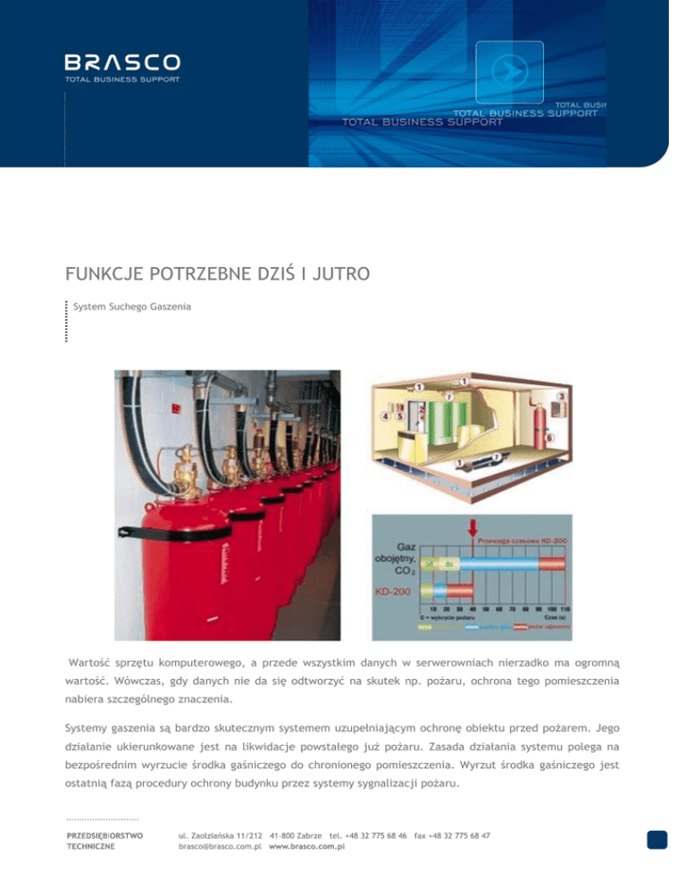 FUNKCJE POTRZEBNE DZIŚ I JUTRO System Suchego Gaszenia Wartość sprzętu komputerowego, a przede wszystkim danych w serwerowniach nierzadko ma ogromną wartość. Wówczas, gdy danych nie da się odtworzyć na skutek np. pożaru, ochrona tego pomieszczenia nabiera szczególnego znaczenia. Systemy gaszenia są bardzo skutecznym systemem uzupełniającym ochronę obiektu przed pożarem. Jego działanie ukierunkowane jest na likwidacje powstałego już pożaru. Zasada działania systemu polega na bezpośrednim wyrzucie środka gaśniczego do chronionego pomieszczenia. Wyrzut środka gaśniczego jest ostatnią fazą procedury ochrony budynku przez systemy sygnalizacji pożaru. System gaszenia TA-200 oparty na środku gaśniczym HFC 227ea gwarantuje ochronę strategicznych danych, wartościowego sprzętu elektronicznego oraz minimalizuje straty spowodowane przestojami eksploatacyjnymi. Nadaje się do gaszenia pożarów klasy A (drewno i inne materiały zawierające celulozę), klasy B (ciecze palne) oraz pożarów klasy C (sprzęt oraz instalacje elektryczne pod napięciem). Mechanizm gaszenia pożarów przy użyciu FM-200 ma charakter aktywny. Jego działanie polega na fizycznym schładzaniu bezpośredniej strefy pożaru na poziomie molekularnym. Jest czystym środkiem gazowym, nie zawierającym żadnych dodatków olejowych lub żrących. Po użyciu nie pozostawia śladów i może być szybko usunięty poprzez wentylację pomieszczenia. Wysoki próg parowania FM-200, w połączeniu z właściwie zaprojektowanym systemem, nie powoduje termicznych uszkodzeń czułych urządzeń elektronicznych i elektrycznych. Nie przewodzi również prądu i przy braku nadmiernej wilgoci nie wchodzi w reakcje z powszechnie stosowanymi materiałami konstrukcyjnymi, takimi jak: metale i polimery. Tym samym nie powoduje korozji. W stężeniu projektowym (do 9%), środek ten nie stanowi jakiegokolwiek zagrożenia dla człowieka - nawet w jego obecności ewakuacja ludzi może być bezpiecznie przeprowadzona. Ugaszenie pożaru we wczesnej krytycznej fazie to najskuteczniejszy sposób uniknięcia nieodwracalnych szkód oraz związanych z nimi kosztów napraw, dlatego nasz system daje wymierne oszczędności w kwotach często wielokrotnie przewyższających koszt wykonania naszej instalacji gaśniczej TA-200. Wykonane przez nas instalacje i dostarczane urządzenia projektowane są tak, aby spełniać wymagania norm oraz posiadać atesty i świadectwa dopuszczenia instytutów i placówek certyfikujących, takich jak: CNBOP-Polska, Certyfikat Centrum Naukowo-Badawczego Ochrony Przeciwpożarowej - Aprobata Techniczna CNBOP PZH-Polska, Atest Państwowego Zakładu Higieny na środek gaśniczy znak budowlany B na zgodność z wymaganiami dyrektywy CPD Unii Europejskiej (Obowiązek znakowania Stałych Urządzeń Gaśniczych znakiem budowlanym B wynika z ustawy o wyrobach budowlanych z dnia 16 kwietnia 2004r. (Dz. U. 2004 Nr 92 poz. 881 z późń. zm).) Znakowanie CE i П (Pi) na zgodność z dyrektywami PED i TPED Zespół BRASCO e-mail:[email protected] Zapraszamy do zapoznania się z pozostałymi naszymi systemami dla serwerowni: System monitoringu środowiska (kontrola temperatury, wilgotności, sterowanie klimatyzacją, itp.) Zasilanie gwarantowane i rezerwowe (UPS, generator) Monitoring wizyjny IP Systemy zabezpieczeń technicznych (systemy ppoż, alarmowe, kontroli dostępu)