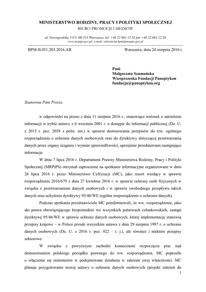 MINISTERSTWO RODZINY, PRACY I POLITYKI SPOŁECZNEJ BIURO PROMOCJI I MEDIÓW ul. Nowogrodzka 1/3/5, 00-513 Warszawa, tel. +48 22 661 12 35 fax +48 22 661 12 26 www.mrpips.gov.pl; e-mail: [email protected] BPM-II.051.203.2016.AB Warszawa, dnia 24 sierpnia 2016 r. Pani Małgorzata Szumańska Wiceprezeska Fundacji Panoptykon [email protected] Szanowna Pani Prezes, w odpowiedzi na pismo z dnia 11 sierpnia 2016 r., stanowiące wniosek o udzielenie informacji w trybie ustawy z 6 września 2001 r. o dostępie do informacji publicznej (Dz. U. z 2015 r. poz. 2058 z późn. zm.) w sprawie dostosowania przepisów do tzw. ogólnego rozporządzenia o ochronie danych osobowych oraz do dyrektywy dotyczącej przetwarzania danych przez organy ścigania i wymiar sprawiedliwości, uprzejmie przedstawiam następujące informacje. W dniu 7 lipca 2016 r. Departament Prawny Ministerstwa Rodziny, Pracy i Polityki Społecznej (MRPiPS) otrzymał zaproszenie na spotkanie informacyjne organizowane w dniu 26 lipca 2016 r. przez Ministerstwo Cyfryzacji (MC), jako resort wiodący w sprawie rozporządzenia 2016/679 z dnia 27 kwietnia 2016 r. w sprawie ochrony osób fizycznych w związku z przetwarzaniem danych osobowych i w sprawie swobodnego przepływu takich danych oraz uchylenia dyrektywy 95/46/WE (ogólne rozporządzenie o ochronie danych). Podczas spotkania przedstawiciele MC poinformowali, że ww. rozporządzenie, jako akt prawa obowiązującego bezpośrednio we wszystkich państwach członkowskich, zastąpi dyrektywę 95/46/WE w sprawie ochrony danych osobowych, której implementację stanowią przepisy krajowe – w Polsce przede wszystkim ustawa z dnia 29 sierpnia 1997 r. o ochronie danych osobowych (Dz. U. z 2016 r. poz. 922 – t. j.), ale również i niektóre przepisy sektorowe. W związku z powyższym zachodzi konieczność rozpoczęcia prac nad dostosowaniem polskiego porządku prawnego do ww. rozporządzenia. MC poprosiło o włączenie się ministerstw w podejmowane działania w zakresie swej właściwości. MC planuje przygotowanie nowej ustawy o ochronie danych osobowych (projekt założeń do 1 ustawy - pod koniec 2016 r., projekt ustawy - II poł. 2017 r.), która będzie regulować przede wszystkim ustanowienie i sposób działania organu ochrony danych osobowych, jednak niezależnie od tego niezbędne jest wprowadzenie szeregu zmian w przepisach szczególnych o charakterze sektorowym znajdujących się w kompetencjach poszczególnych ministerstw i organów centralnych. Mając na względzie powyższe, Departament Prawny zwrócił się z prośbą o dokonanie wstępnego przeglądu i oceny zgodności przepisów znajdujących się w zakresie właściwości departamentów i biur MRPiPS z przyjętymi przepisami unijnego rozporządzenia o ochronie danych osobowych z punktu widzenie konieczności ich uchylenia, zmiany bądź wprowadzenia dodatkowych uregulowań. Pierwsze próby uporządkowania aktów prawnych w zakresie danych osobowych zostały podjęte przez Ministerstwo już w ubiegłym roku. Wynikiem tego wstępnego rozpoznania była tabela (w załączeniu) pn. "Zestawienie przepisów prawa odnoszących się do ochrony danych osobowych" z projektem wykazu przepisów prawa polskiego w zakresie resortu pracy ze stanem prawnym na dzień 28 sierpnia 2015 r. Natomiast dyrektywa Parlamentu Europejskiego i Rady (UE) 2016/680 z dnia 27 kwietnia 2016 r. w sprawie ochrony osób fizycznych w związku z przetwarzaniem danych osobowych przez właściwe organy do celów zapobiegania przestępczości, prowadzenia postępowań przygotowawczych, wykrywania i ścigania czynów zabronionych i wykonywania kar, w sprawie swobodnego przepływu takich danych oraz uchylająca decyzję ramową Rady 2008/977/WSiSW nie znajduje się w zakresie właściwości MRPiPS. Z poważaniem Dyrektor Biura Promocji i Mediów Magdalena Kłosińska /-podpisano bezpiecznym podpisem elektronicznym weryfikowanym przy pomocy ważnego klasyfikowanego certyfikatu/ Załącznik: Tabela: „Zestawienie przepisów prawa odnoszących się do ochrony danych osobowych”. Chcesz się dowiedzieć, jak załatwić swoją urzędową sprawę – kliknij na www.obywatel.gov.pl lub zadzwoń pod numer 222 500 108 2
