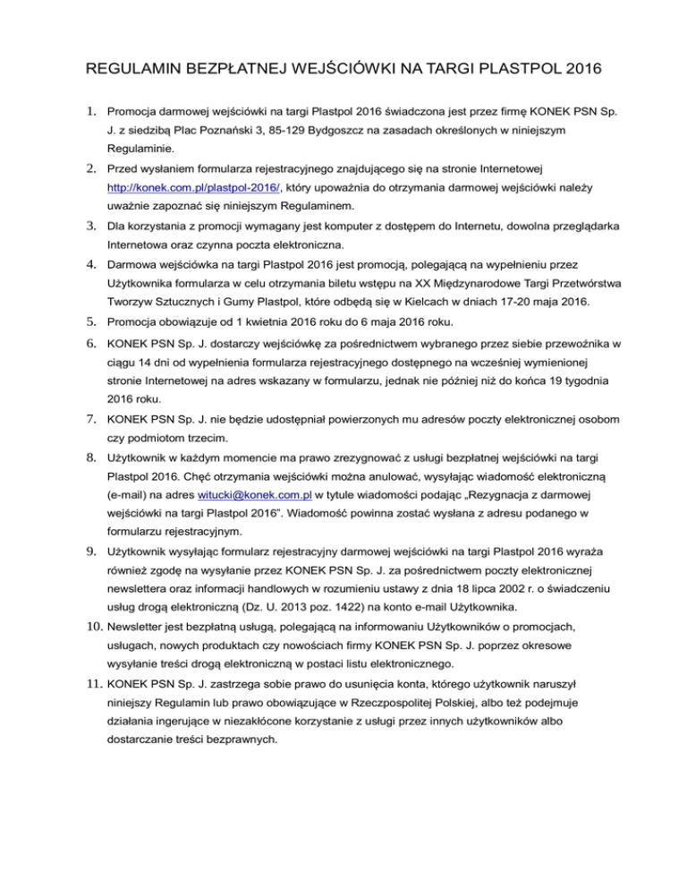 REGULAMIN BEZPŁATNEJ WEJŚCIÓWKI NA TARGI PLASTPOL 2016 1. Promocja darmowej wejściówki na targi Plastpol 2016 świadczona jest przez firmę KONEK PSN Sp. J. z siedzibą Plac Poznański 3, 85-129 Bydgoszcz na zasadach określonych w niniejszym Regulaminie. 2. Przed wysłaniem formularza rejestracyjnego znajdującego się na stronie Internetowej http://konek.com.pl/plastpol-2016/, który upoważnia do otrzymania darmowej wejściówki należy uważnie zapoznać się niniejszym Regulaminem. 3. Dla korzystania z promocji wymagany jest komputer z dostępem do Internetu, dowolna przeglądarka Internetowa oraz czynna poczta elektroniczna. 4. Darmowa wejściówka na targi Plastpol 2016 jest promocją, polegającą na wypełnieniu przez Użytkownika formularza w celu otrzymania biletu wstępu na XX Międzynarodowe Targi Przetwórstwa Tworzyw Sztucznych i Gumy Plastpol, które odbędą się w Kielcach w dniach 17-20 maja 2016. 5. Promocja obowiązuje od 1 kwietnia 2016 roku do 6 maja 2016 roku. 6. KONEK PSN Sp. J. dostarczy wejściówkę za pośrednictwem wybranego przez siebie przewoźnika w ciągu 14 dni od wypełnienia formularza rejestracyjnego dostępnego na wcześniej wymienionej stronie Internetowej na adres wskazany w formularzu, jednak nie później niż do końca 19 tygodnia 2016 roku. 7. KONEK PSN Sp. J. nie będzie udostępniał powierzonych mu adresów poczty elektronicznej osobom czy podmiotom trzecim. 8. Użytkownik w każdym momencie ma prawo zrezygnować z usługi bezpłatnej wejściówki na targi Plastpol 2016. Chęć otrzymania wejściówki można anulować, wysyłając wiadomość elektroniczną (e-mail) na adres [email protected] w tytule wiadomości podając „Rezygnacja z darmowej wejściówki na targi Plastpol 2016”. Wiadomość powinna zostać wysłana z adresu podanego w formularzu rejestracyjnym. 9. Użytkownik wysyłając formularz rejestracyjny darmowej wejściówki na targi Plastpol 2016 wyraża również zgodę na wysyłanie przez KONEK PSN Sp. J. za pośrednictwem poczty elektronicznej newslettera oraz informacji handlowych w rozumieniu ustawy z dnia 18 lipca 2002 r. o świadczeniu usług drogą elektroniczną (Dz. U. 2013 poz. 1422) na konto e-mail Użytkownika. 10. Newsletter jest bezpłatną usługą, polegającą na informowaniu Użytkowników o promocjach, usługach, nowych produktach czy nowościach firmy KONEK PSN Sp. J. poprzez okresowe wysyłanie treści drogą elektroniczną w postaci listu elektronicznego. 11. KONEK PSN Sp. J. zastrzega sobie prawo do usunięcia konta, którego użytkownik naruszył niniejszy Regulamin lub prawo obowiązujące w Rzeczpospolitej Polskiej, albo też podejmuje działania ingerujące w niezakłócone korzystanie z usługi przez innych użytkowników albo dostarczanie treści bezprawnych.