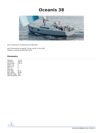 Oceanis 38 Jacht z obecnej linii modelowej stoczni Beneteau. Jacht nominowany do nagrody "Family cruiser" w roku 2014. Zdobywca nagrody Sail Best Boat 2014. Parametry Długość: 11,5 m Szerokość: 3,99 m Zanurzenie: 2,05 m Kabin 1 os.: 0 Kabin 2 os.: 3 Max. os.: 6 Łazienek: 1 Pow. żagli: 65 m2 Moc silnika: 30 KM Zbiornik wody: 330 l Zbiornik paliwa: 130 l www.pro-skippers.com, strona: 1 www.pro-skippers.com, strona: 2 www.pro-skippers.com, strona: 3