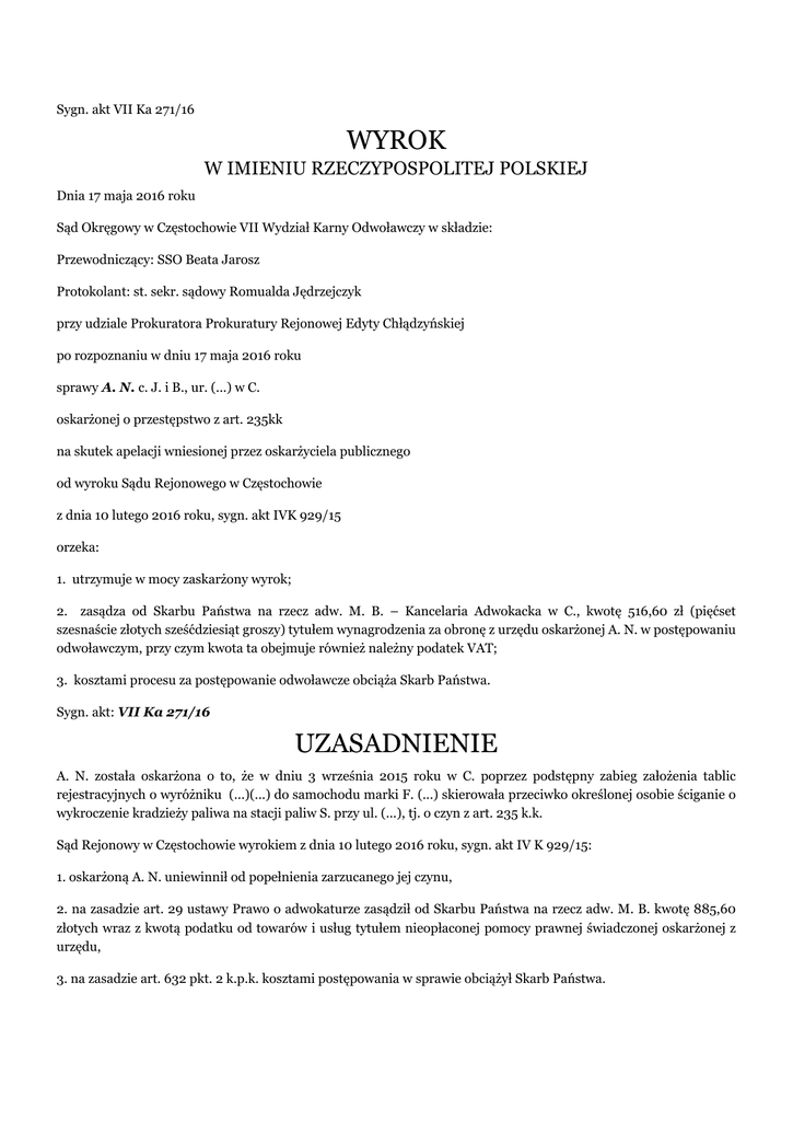 Sygn. akt VII Ka 271/16 WYROK W IMIENIU RZECZYPOSPOLITEJ POLSKIEJ Dnia 17 maja 2016 roku Sąd Okręgowy w Częstochowie VII Wydział Karny Odwoławczy w składzie: Przewodniczący: SSO Beata Jarosz Protokolant: st. sekr. sądowy Romualda Jędrzejczyk przy udziale Prokuratora Prokuratury Rejonowej Edyty Chłądzyńskiej po rozpoznaniu w dniu 17 maja 2016 roku sprawy A. N. c. J. i B., ur. (...) w C. oskarżonej o przestępstwo z art. 235kk na skutek apelacji wniesionej przez oskarżyciela publicznego od wyroku Sądu Rejonowego w Częstochowie z dnia 10 lutego 2016 roku, sygn. akt IVK 929/15 orzeka: 1. utrzymuje w mocy zaskarżony wyrok; 2. zasądza od Skarbu Państwa na rzecz adw. M. B. – Kancelaria Adwokacka w C., kwotę 516,60 zł (pięćset szesnaście złotych sześćdziesiąt groszy) tytułem wynagrodzenia za obronę z urzędu oskarżonej A. N. w postępowaniu odwoławczym, przy czym kwota ta obejmuje również należny podatek VAT; 3. kosztami procesu za postępowanie odwoławcze obciąża Skarb Państwa. Sygn. akt: VII Ka 271/16 UZASADNIENIE A. N. została oskarżona o to, że w dniu 3 września 2015 roku w C. poprzez podstępny zabieg założenia tablic rejestracyjnych o wyróżniku (...)(...) do samochodu marki F. (...) skierowała przeciwko określonej osobie ściganie o wykroczenie kradzieży paliwa na stacji paliw S. przy ul. (...), tj. o czyn z art. 235 k.k. Sąd Rejonowy w Częstochowie wyrokiem z dnia 10 lutego 2016 roku, sygn. akt IV K 929/15: 1. oskarżoną A. N. uniewinnił od popełnienia zarzucanego jej czynu, 2. na zasadzie art. 29 ustawy Prawo o adwokaturze zasądził od Skarbu Państwa na rzecz adw. M. B. kwotę 885,60 złotych wraz z kwotą podatku od towarów i usług tytułem nieopłaconej pomocy prawnej świadczonej oskarżonej z urzędu, 3. na zasadzie art. 632 pkt. 2 k.p.k. kosztami postępowania w sprawie obciążył Skarb Państwa. Od powyższego wyroku apelację wniósł Prokurator, zaskarżając orzeczenie w całości na niekorzyść oskarżonej, zarzucając mu błąd w ustaleniach faktycznych przyjętych za jego podstawę i mający wpływ na treść wyroku poprzez ustalenie na podstawie nieprawidłowej oceny dowodów, że oskarżona A. N. nie dokonała zarzucanego jej czynu wyczerpującego znamiona art. 235 k.k., w sytuacji, gdy prawidłowa ocena zgromadzonego w postępowaniu materiału dowodowego pozwala na uznanie, iż w/w oskarżonej można przypisać sprawstwo zarzuconego jej przestępstwa. Podnosząc wskazany zarzut wniósł o uchylenie zaskarżonego wyroku i przekazanie sprawy Sądowi I Instancji do ponownego rozpoznania. Sąd Okręgowy zważył, co następuje: Apelacja Prokuratora okazała się bezzasadna. Już w tym miejscu należy podkreślić, że nie było w tej sprawie żadnych racji merytorycznych lub formalnych, które przemawiałyby za koniecznością uchylenia powyższego wyroku i przekazania sprawy A. N. do ponownego rozpoznania. W pierwszej kolejności wskazać należy, że Sąd Rejonowy zgromadził w tej sprawie pełny materiał dowodowy, który w żadnej mierze nie wymagał poszerzenia, czy też uzupełniania. Zresztą sam skarżący w wywiedzionej przez siebie apelacji nie podważa kompletności zgromadzonych dowodów, wprost wskazując, że postępowanie w niniejszej sprawie zostało przeprowadzone w sposób wyczerpujący, a przy tym formułując jedynie zarzut poczynienia przez Sąd a quo błędnych ustaleń faktycznych. W tym miejscu podnieść jednak należy, że skarżący stawiając taki zarzut nie kwestionuje poprawności oceny materiału dowodowego zgromadzonego w tej sprawie, a jedynie podważa wyprowadzone na podstawie tej oceny ustalenia w zakresie zamiaru jaki krytycznego dnia - zdaniem organu pierwszoinstancyjnego - miał przyświecać oskarżonej. Wbrew jednak twierdzeniom apelacji, Sąd merytoryczny w prawidłowy sposób ustalił tę fundamentalną na gruncie niniejszej sprawy kwestię, dochodząc do słusznego przekonania, że zachowanie się oskarżonej A. N. nie było ukierunkowane na skierowanie przeciwko określonej osobie (tj. P. K.) ścigania o wykroczenie kradzieży paliwa popełnionego na stacji paliw S. mieszczącej się w C. przy ul. (...), a tym samym nie wypełniło ustawowych znamion czynu stypizowanego w art. 235 k.k. Wskazać bowiem należy, że z wyjaśnień złożonych przez oskarżoną A. N. wynika, że zasadniczym celem jej działania była chęć kradzieży paliwa ze stacji paliw S. i unikniecie za tą kradzież odpowiedzialności wykroczeniowej, a nie danie organom ścigania impulsu do wszczęcia postępowania przeciwko P. K., tj. przeciwko osobie, która była właścicielem pojazdu, z którego wcześniej skradła tablicę rejestracyjną użytą do dokonania tegoż wykroczenia. Takie wyjaśnienia oskarżonej są zresztą logiczne, skoro oskarżona nie znała w ogóle P. K., a zatem nie miała żadnego powodu, aby skierować przeciwko niemu postępowanie w sprawie o wykroczenie. Konkludując powyższe, zdaniem Sądu ad quem, poczynione przez Sąd I Instancji ustalenia faktyczne są prawidłowe, zaś odmienny w tej mierze pogląd zaprezentowany przez rzecznika interesu publicznego w wywiedzionej przez niego apelacji ma jedynie walor polemiczny i w żadnej mierze nie mógł spowodować uchylenia kwestionowanego w toku instancji orzeczenia, zwłaszcza że skarżący - polemizując z tym wyrokiem - nie zarzucił pominięcia przez Sąd Rejonowy jakiegokolwiek dowodu, który mógłby rzucić nowe światło na rozpoznawana sprawę. Wskazać bowiem należy, ze skoro głównym i jedynym celem działania oskarżonej A. N. była chęć uniknięcia odpowiedzialności za kradzież paliwa, a nie skierowanie przeciwko P. K. postępowania w sprawie o wykroczenie, to w tym stanie rzeczy jej działanie nie wypełniło wszystkich ustawowych znamion występku z art. 235 k.k. i stąd należało ją uniewinnić od popełnienia zarzucanego jej czynu. Co istotne, podobny pogląd prawny wyraził także Sąd Najwyższy, kt