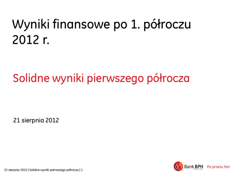 Wyniki finansowe po 1. półroczu 2012 r. Solidne wyniki pierwszego półrocza 21 sierpnia 2012 21 sierpnia 2012 | Solidne wyniki pierwszego półrocza | 1 Zastrzeżenie Niniejsza prezentacja nie jest częścią jakiejkolwiek oferty, zaproszenia, zachęty lub formy nakłaniania do sprzedaży lub składania zapisów na papiery wartościowe. Niniejsza prezentacja nie zawiera wszystkich informacji, które mogą być wymagane przez przyszłego inwestora. Niniejsza prezentacja, jej część, jak również okoliczności jej dystrybucji nie stanowią podstawy dla jakiejkolwiek umowy nabycia lub składania zapisów na papiery wartościowe. Prognozy oraz przewidywania zawarte w prezentacji opierają się na szeregu założeń i szacunków, uznanych przez nas za racjonalne, jednakże w sposób oczywisty podlegają wpływowi istotnych przyszłych i niepewnych zdarzeń biznesowych, operacyjnych, gospodarczych i konkurencyjnych, z których wiele pozostaje poza naszą kontrolą. Ponadto opierają się one na założeniach dotyczących przyszłych decyzji biznesowych, które mogą ulec zmianie. Rzeczywiste wyniki mogą znacząco odbiegać od zakładanych. Niektóre dane liczbowe i procentowe przedstawione w niniejszej prezentacji mogą się nie sumować z uwagi na dokonane zaokrąglenia. 21 sierpnia 2012 | Solidne wyniki pierwszego półrocza | 2 Agenda 1 Najważniejsze informacje 2 Wyniki finansowe 3 Podsumowanie 4 Suplement 21 sierpnia 2012 | Solidne wyniki pierwszego półrocza | 3 Najważniejsze informacje 21 sierpnia 2012 | Solidne wyniki pierwszego półrocza | 4 Najważniejsze informacje Zyskowność Wyniki Koszty • 51 mln zł zysku brutto w 2 kwartale… spadek o 33% r/r (93 mln zł… wzrost o 44% r/r z wyłączeniem jednorazowych odpisów) • Silny wzrost nowo udzielanych kredytów r/r: kredytów gotówkowych o 54%, kredytów dla MSP o 10%, kredytów dla korporacji o 57% • 5% spadek kosztów wobec poprzedniego roku z wyłączeniem 69 mln zł rezerw na restrukturyzację w 2 kwartale Odpisy na utratę wartości • 66% spadek kosztów ryzyka w 1 półroczu r/r Bezpieczeństwo • Współczynnik wypłacalności 13,4% według nowej metodologii 21 sierpnia 2012 | Solidne wyniki pierwszego półrocza | 5 Spełnienie naszej obietnicy marki Komunikacja marketingowa > Koncentracja na rozwoju filozofii fair play i zaufania wsparta dowodami potwierdzającymi pozycjonowanie marki oraz przejrzystą komunikacją opartą na faktach > Przeprowadzone kampanie Fair Play: » Kredyt gotówkowy (lut–kwi’12) » Konto osobiste (kwi–czer’12) > Wydajemy pieniądze na reklamę efektywnie (9. pozycja wśród banków w 1. półroczu `12) 21 dni na odstąpienie od umowy kredytowej Badanie kondycji finansowej Brak ukrytych opłat Kluczowe wskaźniki marki Pierwszy wymieniony bank Rozważany bank Top 5 Top 5 CELE #6 #9 7% 3% 2kw.11 2kw.12 „Bank, który działa wg przejrzystych zasad” Nr 1 #5 #8 „Bank, który gra fair” #4 22% 15% Top 5 #1 #3 2kw.11 2kw.12 #1 90 110 2kw.11 2kw.12 Ponownie wRESPECT Index 21 sierpnia 2012 | Solidne wyniki pierwszego półrocza | 6 Nr 1 #6 117 101 2kw.11 2kw.12 „Bank, któremu ufam” 85 2kw.11 #3 101 2kw.12 Dowody potwierdzające pozycjonowanie marki… doskonalenie sieci sprzedaży Obsługa i sprzedaż fair Placówka partnerska fair Nowa Księga standardów Standaryzacja polityki Oddział fair Zapewnienie jednolitego wyglądu i obsługi i sprzedaży w cenowej / parametrów/ obsługi: Oddziałach wskaźników produktów Uniwersalizacja Oddziałów… Monitoring standardów poprzez badania „Tajemniczego klienta” Forum Klientów Indywidualnych 21 sierpnia 2012 | Solidne wyniki pierwszego półrocza | 7 Rada Partnerów 100% sieci z obsługą kasową Modernizacja Oddziałów… 25% sieci Solidny wzrost sprzedaży Bankowość komercyjna Bankowość detaliczna Nowy wolumen kredytów gotówkowych • Sprzedaż kredytów gotówkowych (mln zł) +54% 488 317 2kw.11 2kw.12 wyższa o 10% kw/kw… najlepszy wynik od 2 lat • 48% wzrost r/r sprzedaży kont osobistych… • 75% wzrost r/r sprzedaży limitu w saldzie debetowym • 18% wzrost r/r sprzedaży kart kredytowych ze średnim nowym limitem wyższym o 15% • Otwarte 3 nowe oddziały • Nowe technologie: • Wdrożona aplikacja Augmented Reality (rozszerzonej rzeczywistości) Nowy wolumen kredytów komercyjnych* (mln zł) +37% 901 656 2kw.11 • 602 mln zł nowo udzielonych kredytów korporacyjnych… 299 mln zł kredytów udzielonych MSP • 123 nowych Klientów korporacyjnych 2kw.12 • Poprawa procesów i nowe produkty: • Dla mikrofirm: pożyczka hipoteczna i kredyt rewolwingowy oparte na ocenie scoringowej • Dla MSP: konta firmowe (Symetria Direct, Symetria i do wyszukiwania oddziałów i Symetria Pro) oraz uproszczenie procesu otwierania bankomatów rachunków • Nowa bankowość mobilna dla iPhone`ów oraz telefonów z systemem Android */ Nowe limity 21 sierpnia 2012 | Solidne wyniki pierwszego półrocza | 8 • Nowy wygląd systemu BusinessNet • Mocne wejście w 3 kwartał Wyniki finansowe 21 sierpnia 2012 | Solidne wyniki pierwszego półrocza | 9 Wyniki finansowe 2kw.12 Zmiana/kw. (%) Zmiana/r. (%) 1poł.12 Zmiana/r. (%) Wynik odsetkowy 321 +0,2% -3,1% 641 -3,6% Wynik z tytułu opłat i prowizji 128 -7,8% -17,6% 268 -16,4% Wynik na działalności bankowej* 455 -2,8% -8,4% 924 -7,6% Odpisy na utratę wartości -39 +27,5% -54,5% -69 -65,7% Przychody netto po odpisach** 417 -4,9% +1,1% 855 +7,1% Koszty -372 +5,6% +11,0% -724 +10,7% -330 -1,9% -4,8% -666 -2,4% Zysk brutto 51 -37,3% -33,0% 132 -6,8% Zysk netto 36 -41,6% -37,0% 97 -7,1% Mln zł Z wył. restrukturyzacji i jednorazowych pozycji 36 mln zł zysku netto mimo odpisów na restrukturyzację w wysokości 69 mln zł */ wynik na działalności bankowej = wynik odsetkowy + wynik z tytułu opłat i prowizji + wynik handlowy **/ przychody netto po odpisach = wynik na działalności bankowej + odpisy na utratę wartości zmiana/kw. (%) = 2kw.12 vs. 1kw.11 zmi