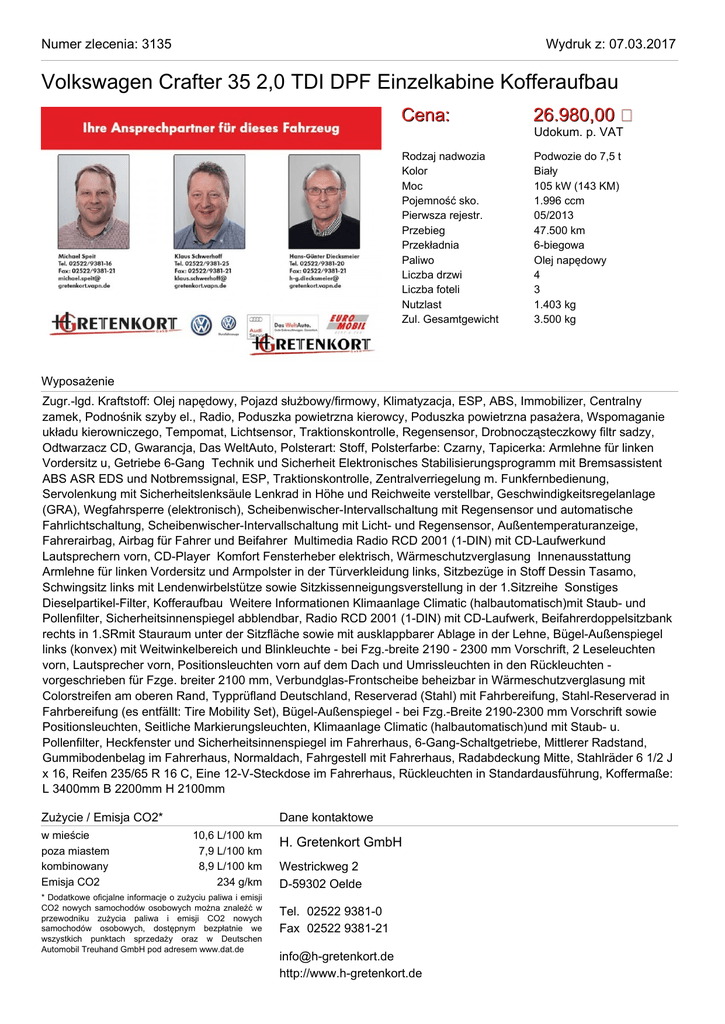 Numer zlecenia: 3135 Wydruk z: 07.03.2017 Volkswagen Crafter 35 2,0 TDI DPF Einzelkabine Kofferaufbau Cena: 26.980,00 Rodzaj nadwozia Kolor Moc Pojemność sko. Pierwsza rejestr. Przebieg Przekładnia Paliwo Liczba drzwi Liczba foteli Nutzlast Zul. Gesamtgewicht Podwozie do 7,5 t Biały 105 kW (143 KM) 1.996 ccm 05/2013 47.500 km 6-biegowa Olej napędowy 4 3 1.403 kg 3.500 kg Udokum. p. VAT Wyposażenie Zugr.-lgd. Kraftstoff: Olej napędowy, Pojazd służbowy/firmowy, Klimatyzacja, ESP, ABS, Immobilizer, Centralny zamek, Podnośnik szyby el., Radio, Poduszka powietrzna kierowcy, Poduszka powietrzna pasażera, Wspomaganie układu kierowniczego, Tempomat, Lichtsensor, Traktionskontrolle, Regensensor, Drobnocząsteczkowy filtr sadzy, Odtwarzacz CD, Gwarancja, Das WeltAuto, Polsterart: Stoff, Polsterfarbe: Czarny, Tapicerka: Armlehne für linken Vordersitz u, Getriebe 6-Gang Technik und Sicherheit Elektronisches Stabilisierungsprogramm mit Bremsassistent ABS ASR EDS und Notbremssignal, ESP, Traktionskontrolle, Zentralverriegelung m. Funkfernbedienung, Servolenkung mit Sicherheitslenksäule Lenkrad in Höhe und Reichweite verstellbar, Geschwindigkeitsregelanlage (GRA), Wegfahrsperre (elektronisch), Scheibenwischer-Intervallschaltung mit Regensensor und automatische Fahrlichtschaltung, Scheibenwischer-Intervallschaltung mit Licht- und Regensensor, Außentemperaturanzeige, Fahrerairbag, Airbag für Fahrer und Beifahrer Multimedia Radio RCD 2001 (1-DIN) mit CD-Laufwerkund Lautsprechern vorn, CD-Player Komfort Fensterheber elektrisch, Wärmeschutzverglasung Innenausstattung Armlehne für linken Vordersitz und Armpolster in der Türverkleidung links, Sitzbezüge in Stoff Dessin Tasamo, Schwingsitz links mit Lendenwirbelstütze sowie Sitzkissenneigungsverstellung in der 1.Sitzreihe Sonstiges Dieselpartikel-Filter, Kofferaufbau Weitere Informationen Klimaanlage Climatic (halbautomatisch)mit Staub- und Pollenfilter, Sicherheitsinnenspiegel abblendbar, Radio RCD 2001 (1-DIN) mit CD-Laufwerk, Beifahrerdoppelsitzbank rechts in 1.SRmit Stauraum unter der Sitzfläche sowie mit ausklappbarer Ablage in der Lehne, Bügel-Außenspiegel links (konvex) mit Weitwinkelbereich und Blinkleuchte - bei Fzg.-breite 2190 - 2300 mm Vorschrift, 2 Leseleuchten vorn, Lautsprecher vorn, Positionsleuchten vorn auf dem Dach und Umrissleuchten in den Rückleuchten vorgeschrieben für Fzge. breiter 2100 mm, Verbundglas-Frontscheibe beheizbar in Wärmeschutzverglasung mit Colorstreifen am oberen Rand, Typprüfland Deutschland, Reserverad (Stahl) mit Fahrbereifung, Stahl-Reserverad in Fahrbereifung (es entfällt: Tire Mobility Set), Bügel-Außenspiegel - bei Fzg.-Breite 2190-2300 mm Vorschrift sowie Positionsleuchten, Seitliche Markierungsleuchten, Klimaanlage Climatic (halbautomatisch)und mit Staub- u. Pollenfilter, Heckfenster und Sicherheitsinnenspiegel im Fahrerhaus, 6-Gang-Schaltgetriebe, Mittlerer Radstand, Gummibodenbelag im Fahrerhaus, Normaldach, Fahrgestell mit Fahrerhaus, Radabdeckung Mitte, Stahlräder 6 1/2 J x 16, Reifen 235/65 R 16 C, Eine 12-V-Steckdose im Fahrerhaus, Rückleuchten in Standardausführung, Koffermaße: L 3400mm B 2200mm H 2100mm Zużycie / Emisja CO2* w mieście poza miastem kombinowany Emisja CO2 Dane kontaktowe 10,6 L/100 km 7,9 L/100 km 8,9 L/100 km 234 g/km * Dodatkowe oficjalne informacje o zużyciu paliwa i emisji CO2 nowych samochodów osobowych można znaleźć w przewodniku zużycia paliwa i emisji CO2 nowych samochodów osobowych, dostępnym bezpłatnie we wszystkich punktach sprzedaży oraz w Deutschen Automobil Treuhand GmbH pod adresem www.dat.de H. Gretenkort GmbH Westrickweg 2 D-59302 Oelde Tel. 02522 9381-0 Fax 02522 9381-21 [email protected] http://www.h-gretenkort.de Numer zlecenia: 3135 Wydruk z: 07.03.2017 Volkswagen Crafter 35 2,0 TDI DPF Einzelkabine Kofferaufbau