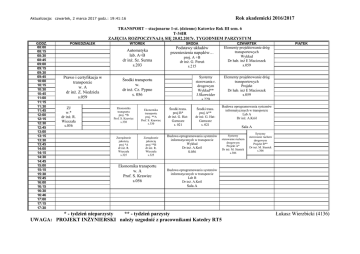 Rok akademicki 2016/2017 Aktualizacja: czwartek, 2 marca 2017 godz.: 19:41:16 TRANSPORT – stacjonarne 1-st. (dzienne) Katowice Rok III sem. 6 T-34IR ZAJĘCIA ROZPOCZYNAJĄ SIĘ 20.02.2017r. TYGODNIEM PARZYSTYM GODZ. 08:00 08:15 08:30 08:45 09:00 09:15 09:30 09:45 10:00 10:15 10:30 10:45 11:00 11:15 11:30 11:45 12:00 12:15 12:30 12:45 13:00 13:15 13:30 13:45 14:00 14:15 14:30 14:45 15:00 15:15 15:30 15:45 16:00 16:15 16:30 16:46 17:00 17:15 17:30 PONIEDZIAŁEK WTOREK Automatyka lab. A+B dr inż. Sz. Surma s.203 Prawo i certyfikacja w transporcie w. A dr inż. Z. Niedziela s.059 ZJ w.* dr inż. R. Wieszała s.056 ŚRODA CZWARTEK Podstawy układów przeniesienia napędów… Elementy projektowanie dróg transportowych Wykład Dr hab. inż E Macioszek s.059 proj. A +B dr inż. G. Peruń s.215 Systemy sterowania r. drogowym Wykład** J.Skorwider s.229 Środki transportu w. dr inż. Cz. Pypno s. 056 Ekonomika transportu proj. *B Prof. S. Krawiec s.330 Zarządzanie jakością proj *A dr inż. R. Wieszała s.325 Ekonomika transportu proj. **A Prof. S. Krawiec s.330 Zarządzanie jakością proj **B dr inż. R. Wieszała s.325 Ekonomika transportu w. A Prof. S. Krawiec s.056 Środki trans. proj B* dr inż. G. HatGarncarz s. 021 Środki trans. proj A** dr inż. G. HatGarncarz s. 021 Budowa oprogramowania systemów informatycznych w transporcie Wykład Dr inż. A.Król S.056 PIĄTEK Elementy projektowanie dróg transportowych Projekt Dr hab. inż E Macioszek s.059 Budowa oprogramowania systemów informatycznych w transporcie Lab A Dr inż. A.Król Sala A Systemy sterowanie ruchem drogowym Projekt A* Dr inż. M. Staniek s.306 Systemy sterowanie ruchem drogowym Projekt B** Dr inż. M. Staniek s.306 Budowa oprogramowania systemów informatycznych w transporcie Lab B Dr inż. A.Król Sala A * - tydzień nieparzysty ** - tydzień parzysty UWAGA: PROJEKT INŻYNIERSKI należy uzgodnić z pracownikami Katedry RT5 Łukasz Wierzbicki (4136)