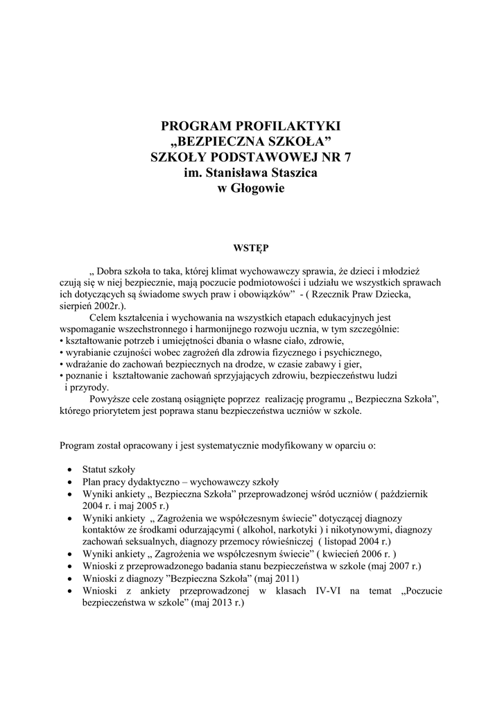 PROGRAM PROFILAKTYKI „BEZPIECZNA SZKOŁA” SZKOŁY PODSTAWOWEJ NR 7 im. Stanisława Staszica w Głogowie WSTĘP „ Dobra szkoła to taka, której klimat wychowawczy sprawia, że dzieci i młodzież czują się w niej bezpiecznie, mają poczucie podmiotowości i udziału we wszystkich sprawach ich dotyczących są świadome swych praw i obowiązków” - ( Rzecznik Praw Dziecka, sierpień 2002r.). Celem kształcenia i wychowania na wszystkich etapach edukacyjnych jest wspomaganie wszechstronnego i harmonijnego rozwoju ucznia, w tym szczególnie: • kształtowanie potrzeb i umiejętności dbania o własne ciało, zdrowie, • wyrabianie czujności wobec zagrożeń dla zdrowia fizycznego i psychicznego, • wdrażanie do zachowań bezpiecznych na drodze, w czasie zabawy i gier, • poznanie i kształtowanie zachowań sprzyjających zdrowiu, bezpieczeństwu ludzi i przyrody. Powyższe cele zostaną osiągnięte poprzez realizację programu „ Bezpieczna Szkoła”, którego priorytetem jest poprawa stanu bezpieczeństwa uczniów w szkole. Program został opracowany i jest systematycznie modyfikowany w oparciu o: • • • • • • • • Statut szkoły Plan pracy dydaktyczno – wychowawczy szkoły Wyniki ankiety „ Bezpieczna Szkoła” przeprowadzonej wśród uczniów ( październik 2004 r. i maj 2005 r.) Wyniki ankiety „ Zagrożenia we współczesnym świecie” dotyczącej diagnozy kontaktów ze środkami odurzającymi ( alkohol, narkotyki ) i nikotynowymi, diagnozy zachowań seksualnych, diagnozy przemocy rówieśniczej ( listopad 2004 r.) Wyniki ankiety „ Zagrożenia we współczesnym świecie” ( kwiecień 2006 r. ) Wnioski z przeprowadzonego badania stanu bezpieczeństwa w szkole (maj 2007 r.) Wnioski z diagnozy ”Bezpieczna Szkoła” (maj 2011) Wnioski z ankiety przeprowadzonej w klasach IV-VI na temat „Poczucie bezpieczeństwa w szkole” (maj 2013 r.) Diagnoza środowiska szkolnego Diagnozę w zakresie bezpieczeństwa w szkole dokonano na podstawie przeprowadzonych wśród uczniów ankiet „Bezpieczna Szkoła”, „Zagrożenia we współczesnym świecie”, „Poczucie bezpieczeństwa w szkole”, rozmów indywidualnych z rodzicami, uczniami, obserwacji i analizy dokumentacji pedagoga szkolnego, wywiadów z nauczycielami, wychowawcami klas oraz personelem szkoły. Odbiorcy programu Uczniowie, rodzice, opiekunowie, wszyscy pracownicy szkoły. Cel główny programu Poprawa stanu bezpieczeństwa uczniów w szkole. CELE SZCZEGÓŁOWE: 1. Podniesienie poziomu poczucia bezpieczeństwa ucznia w szkole: • uświadomienie uczniom potrzeby bezpieczeństwa, • zwiększenie zaufania uczniów do siebie w sytuacjach potencjalnej przemocy, • zapoznanie z różnymi formami agresji , • nauka radzenia sobie w groźnych społecznie sytuacjach, • wzmacnianie umiejętności świadomej rezygnacji z obcowania z przemocą, • ukazanie zachowań alternatywnych w sytuacjach wyzwalających agresję, • rozwijanie przez dzieci i młodzież samoświadomości własnych emocji i uczuć, • dostarczenie wielu doświadczeń wzmacniających poczucie własnej wartości, • pomoc w rozumieniu i rozwiązywaniu własnych trudności i problemów, • zapewnianie warunków do zdobywania i rozwijania zdolności oraz zainteresowań. 2. Uwrażliwienie nauczycieli na wszechobecność jawnych i ukrytych przejawów przemocy oraz wyposażenie ich w umiejętności: • • • • • • rozpoznawania, jakie cechy wychowawcy sprzyjają zapobieganiu przemocy w klasie, wystrzegania się agresywnych zachowań wobec wychowanków , interweniowania i reagowania, prowadzenia rozmów z ofiarą i sprawcą agresji, wzajemnego wspierania się, reagowania zgodnie z procedurami postępowania w sytuacjach zagrożenia dzieci demoralizacją. 3. Włączenie rodziców do tworzenia systemu przeciwdziałania przemocy w środowisku szkolnym i rodzinnym: • • • • wymiana informacji nt. agresywnych zachowań uczniów (ankietowanie, analiza, wnioski, indywidualne spotkania, zebrania), edukowanie ( scenariusze zajęć, debaty, broszury, ulotki, strona internetowa „Pedagog radzi”, zapoznanie z procedurami postępowania w sytuacjach zagrożenia dzieci demoralizacją), konsultacje z kadrą pedagogiczną, angażowanie Rady Rodziców do rozwiązywania szczególnych przypadków dot. zachowań agresywnych. 4. Podnoszenie poczucia bezpieczeństwa w szkole poprzez współpracę z instytucjami i organizacjami: • zapobieganie trudnościom szkolnym poprzez systematyczne spotkania z pedagogami, psychologami, terapeutami i ludźmi przychodzącymi z pomocą uczniom, nauczycielom i rodzicom ( współpraca z instytucjami: PPP, PCPR, ośrodkami: „Szansa” i „Maraton”); • współpraca z Sądem Rejonowym, Wydziałem dla Nieletnich - kuratorami mającymi dozór nad niektórymi rodzinami; • warsztaty prowadzone przez pracowników PPP dla nauczycieli; • współpraca ze świetlicami terapeutycznymi przy Kościele Bożego Ciała i MOPS-u przy ul. Strumykowej 3; • współpraca z organizacjami: „Szansa”, „Maraton” – zajęcia socjoterapeutyczne dla uczniów przejawiających zaburzenia zachowania; • współpraca z Policją – spotkania z policjantem w kl. I-III nt. bezpiecznej drogi do i ze szkoły, w kl. IV-VI nt. odpowiedzialności dzieci i rodziców za popełniane czyny, przepisy prawne dotyczące nieletnich; wypracowanie procedur postępowania nauczycieli w sytuacjach zagrożenia dzieci i młodzieży demoralizacją; • imprezy integracyjne kl. I-III z placówkami przedszkolnymi – wielobój sprawnościowy, zawody pomiędzy rodzicami – promocja bezpiecznych zabaw. • współpraca ze „Szkołą Życia” – zajęcia integracyjne kształtujące pozytywne relacje. 5. Monitoring newralgicznych miejsc w budynku szkolnym i terenu wokół szkoły. Czynniki ryzyka: • • • • • • • • • • doświadczenie przemocy w dzieciństwie deficyt kontaktu niespójne zasady, normy, reguły w rodzin