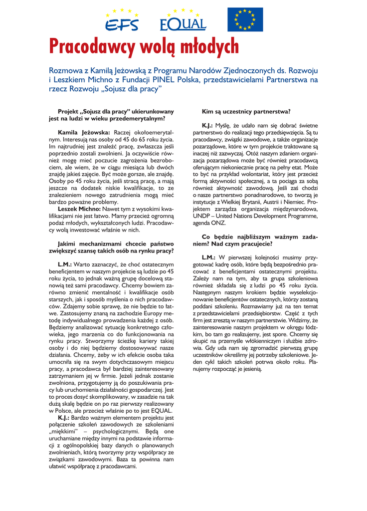 Pracodawcy wolą młodych Rozmowa z Kamilą Jeżowską z Programu Narodów Zjednoczonych ds. Rozwoju i Leszkiem Michno z Fundacji PINEL Polska, przedstawicielami Partnerstwa na rzecz Rozwoju „Sojusz dla pracy” Projekt „Sojusz dla pracy” ukierunkowany jest na ludzi w wieku przedemerytalnym? Kamila Jeżowska: Raczej okołoemerytalnym. Interesują nas osoby od 45 do 65 roku życia. Im najtrudniej jest znaleźć pracę, zwłaszcza jeśli poprzednio zostali zwolnieni. Ja oczywiście również mogę mieć poczucie zagrożenia bezrobociem, ale wiem, że w ciągu miesiąca lub dwóch znajdę jakieś zajęcie. Być może gorsze, ale znajdę. Osoby po 45 roku życia, jeśli stracą pracę, a mają jeszcze na dodatek niskie kwalifikacje, to ze znalezieniem nowego zatrudnienia mogą mieć bardzo poważne problemy. Leszek Michno: Nawet tym z wysokimi kwalifikacjami nie jest łatwo. Mamy przecież ogromną podaż młodych, wykształconych ludzi. Pracodawcy wolą inwestować właśnie w nich. Jakimi mechanizmami chcecie państwo zwiększyć szansę takich osób na rynku pracy? L.M.: Warto zaznaczyć, że choć ostatecznym beneficjentem w naszym projekcie są ludzie po 45 roku życia, to jednak ważną grupę docelową stanowią też sami pracodawcy. Chcemy bowiem zarówno zmienić mentalność i kwalifikacje osób starszych, jak i sposób myślenia o nich pracodawców. Zdajemy sobie sprawę, że nie będzie to łatwe. Zastosujemy znaną na zachodzie Europy metodę indywidualnego prowadzenia każdej z osób. Będziemy analizować sytuację konkretnego człowieka, jego marzenia co do funkcjonowania na rynku pracy. Stworzymy ścieżkę kariery takiej osoby i do niej będziemy dostosowywać nasze działania. Chcemy, żeby w ich efekcie osoba taka umocniła się na swym dotychczasowym miejscu pracy, a pracodawca był bardziej zainteresowany zatrzymaniem jej w firmie. Jeżeli jednak zostanie zwolniona, przygotujemy ją do poszukiwania pracy lub uruchomienia działalności gospodarczej. Jest to proces dosyć skomplikowany, w zasadzie na tak dużą skalę będzie on po raz pierwszy realizowany w Polsce, ale przecież właśnie po to jest EQUAL. K.J.: Bardzo ważnym elementem projektu jest połączenie szkoleń zawodowych ze szkoleniami „miękkimi” – psychologicznymi. Będą one uruchamiane między innymi na podstawie informacji z ogólnopolskiej bazy danych o planowanych zwolnieniach, którą tworzymy przy współpracy ze związkami zawodowymi. Baza ta powinna nam ułatwić współpracę z pracodawcami. Kim są uczestnicy partnerstwa? K.J.: Myślę, że udało nam się dobrać świetne partnerstwo do realizacji tego przedsięwzięcia. Są tu pracodawcy, związki zawodowe, a także organizacje pozarządowe, które w tym projekcie traktowane są inaczej niż zazwyczaj. Otóż naszym zdaniem organizacja pozarządowa może być również pracodawcą oferującym niekoniecznie pracę na pełny etat. Może to być na przykład wolontariat, który jest przecież formą aktywności społecznej, a ta pociąga za sobą również aktywność zawodową. Jeśli zaś chodzi o nasze partnerstwo ponadnarodowe, to tworzą je instytucje z Wielkiej Brytanii, Austrii i Niemiec. Projektem zarządza organizacja międzynarodowa, UNDP – United Nations Development Programme, agenda ONZ. Co będzie najbliższym ważnym zadaniem? Nad czym pracujecie? L.M.: W pierwszej kolejności musimy przygotować kadrę osób, które będą bezpośrednio pracować z beneficjentami ostatecznymi projektu. Zależy nam na tym, aby ta grupa szkoleniowa również składała się z ludzi po 45 roku życia. Następnym naszym krokiem będzie wyselekcjonowanie beneficjentów ostatecznych, którzy zostaną poddani szkoleniu. Rozmawiamy już na ten temat z przedstawicielami przedsiębiorstw. Część z tych firm jest zresztą w naszym partnerstwie. Widzimy, że zainteresowanie naszym projektem w okręgu łódzkim, bo tam go realizujemy, jest spore. Chcemy się skupić na przemyśle włókienniczym i służbie zdrowia. Gdy uda nam się zgromadzić pierwszą grupę uczestników określimy jej potrzeby szkoleniowe. Jeden cykl takich szkoleń potrwa około roku. Planujemy rozpocząć je jesienią.