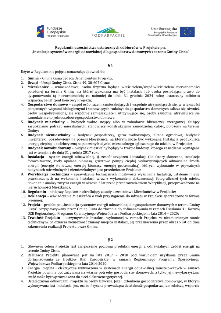 Regulamin uczestnictwa ostatecznych odbiorców w Projekcie pn. „Instalacja systemów energii odnawialnej dla gospodarstw domowych z terenu Gminy Cisna” §1 Użyte w Regulaminie pojęcia oznaczają odpowiednio: 1. 2. 3. 4. 5. 6. 7. 8. 9. 10. 11. 12. 13. Gmina – Gmina Cisna będąca Beneficjentem Projektu; Urząd – Urząd Gminy Cisna, Cisna 49, 38-607 Cisna; Mieszkaniec – wnioskodawca, osoba fizyczna będąca właścicielem/współwłaścicielem nieruchomości położonej na terenie Gminy, na której wykonana ma być Instalacja lub osoba posiadająca prawo do dysponowania tą nieruchomością co najmniej do dnia 31 grudnia 2024 roku; ostateczny odbiorca wsparcia/beneficjent końcowy Projektu; Gospodarstwo domowe – zespół osób razem zamieszkujących i wspólnie utrzymujących się, w większości połączonych więzami biologicznymi i stanowiących rodziny; do gospodarstw domowych zalicza się również osoby niespokrewnione, ale wspólnie zamieszkujące i utrzymujące się; osoby samotne, utrzymujące się samodzielnie to jednoosobowe gospodarstwa domowe; Budynek mieszkalny – budynek wolno stojący albo w zabudowie bliźniaczej, szeregowej, służący zaspokajaniu potrzeb mieszkalnych, stanowiący konstrukcyjnie samodzielną całość, położony na terenie Gminy; Budynek niemieszkalny – budynek gospodarczy, garaż wolnostojący, altana ogrodowa, budynek inwentarski, posadowiony na posesji Mieszkańca, na którym może być wykonana Instalacja produkująca energię cieplną lub elektryczną na potrzeby budynku mieszkalnego zgłoszonego do udziału w Projekcie; Budynek nowobudowany – budynek mieszkalny będący w trakcie budowy, którego zasiedlenie wymagane jest w terminie do dnia 31 grudnia 2017 roku; Instalacja – system energii odnawialnej, tj. zespół urządzeń i instalacji (kolektory słoneczne, instalacje fotowoltaiczne, kotły opalane biomasą, gruntowe pompy ciepła) wykorzystujących odnawialne źródła energii (energię słoneczną, energię biomasy, energię geotermalną), których wykonanie w prywatnych budynkach mieszkalnych i niemieszkalnych jest przedmiotem Projektu; Weryfikacja Techniczna – sprawdzenie technicznych możliwości wykonania Instalacji, ustalenie miejsc przeznaczonych na wykonanie Instalacji wraz z wykonaniem dokumentacji fotograficznej tych miejsc, dokonanie analizy zużycia energii w okresie 2 lat przed przeprowadzeniem Weryfikacji, przeprowadzone na nieruchomości Mieszkańca; Regulamin – niniejszy Regulamin określający zasady uczestnictwa Mieszkańców w Projekcie; Deklaracja – oświadczenie Mieszkańca o woli przystąpienia do udziału w Projekcie sporządzone w formie pisemnej; Projekt – projekt pn. „Instalacja systemów energii odnawialnej dla gospodarstw domowych z terenu Gminy Cisna” przygotowywany przez Gminę Cisna do złożenia do dofinansowania w ramach Działania 3.1 Rozwój OZE Regionalnego Programu Operacyjnego Województwa Podkarpackiego na lata 2014 – 2020; Trwałość Projektu – utrzymywanie Instalacji wykonanej w ramach Projektu w niezmienionym stanie technicznym, co oznacza niemożność zmiany miejsca Instalacji, jej przeznaczenia przez okres 5 lat od dnia zakończenia realizacji Projektu przez Gminę. §2 1. 2. 3. 4. Głównym celem Projektu jest zwiększenie poziomu produkcji energii z odnawialnych źródeł energii na terenie Gminy Cisna. Realizacja Projektu planowana jest na lata 2017 – 2018 pod warunkiem uzyskania przez Gminę dofinansowania ze środków Unii Europejskiej w ramach Regionalnego Programu Operacyjnego Województwa Podkarpackiego na lata 2014-2020. Energia cieplna i elektryczna wytworzona w systemach energii odnawialnej zainstalowanych w ramach Projektu powinna być zużywana na własne potrzeby gospodarstw domowych, a tylko jej niewykorzystana część może być wprowadzona do sieci elektroenergetycznej. Ostatecznymi odbiorcami Projektu są osoby fizyczne. Jeżeli członkiem gospodarstwa domowego, w którym wykonywana jest Instalacja, jest osoba fizyczna prowadząca działalność gospodarczą lub rolniczą, wsparcie 1 5. 6. 7. 8. 9. na rzecz odbiorcy ostatecznego udzielane jest w formie pomocy de minimis. W takim przypadku Mieszkaniec jest zobowiązany załączyć do Deklaracji oświadczenie o wysokości dotychczas otrzymanej pomocy de minimis. Uczestnictwo Mieszkańca w Projekcie jest dobrowolne. Warunkiem uczestnictwa Mieszkańca w Projekcie jest: 1) lokalizacja nieruchomości Mieszkańca, na której wykonana ma być Instalacja, na terenie Gminy; 2) uregulowany stan prawny nieruchomości, na której wykonana ma być Instalacja Mieszkańca – własność/współwłasność lub posiadane prawo do dysponowania nieruchomością co najmniej do 31 grudnia 2024 roku potwierdzone w formie pisemnej; w przypadku, gdy Mieszkaniec jest właścicielem lub współwłaścicielem kilku nieruchomości, może złożyć Deklarację przystąpienia do Projektu tylko na jedną nieruchomość; 3) brak jakichkolwiek nieuregulowanych a wymagalnych zobowiązań Mieszkańca wobec Gminy na dzień złożenia Deklaracji oraz na dzień podpisania Umowy z Gminą; 4) złożenie przez Mieszkańca prawidłowo wypełnionej Deklaracji uczestnictwa w Projekcie w terminie i miejscu wskazanym przez Gminę; Deklaracja powinna zawierać dane wszystkich właścicieli, współwłaścicieli lub osób posiadających prawo do dysponowania nieruchomością, na której wykonana ma być Instalacja i powinna być przez wszystkich podpisana; 5) wyrażenie w Deklaracji zgody na bezpłatne użyczenie Gminie miejsca na wykonanie Instalacji w przypadku wyboru Projektu do dofinansowania na okres realizacji Projektu oraz przez 5 lat od zakończenia Projektu; 6) po zakwalifikowaniu Mieszkańca do udziału w Projekcie podpisanie w terminie do dnia 15 października 2016 roku umowy użyczenia, zawierającej zgodę Mieszkańca na bezpłatne dysponowanie przez Gminę nieruchomością stanowiącą własność Mieszkańca lub będącą 