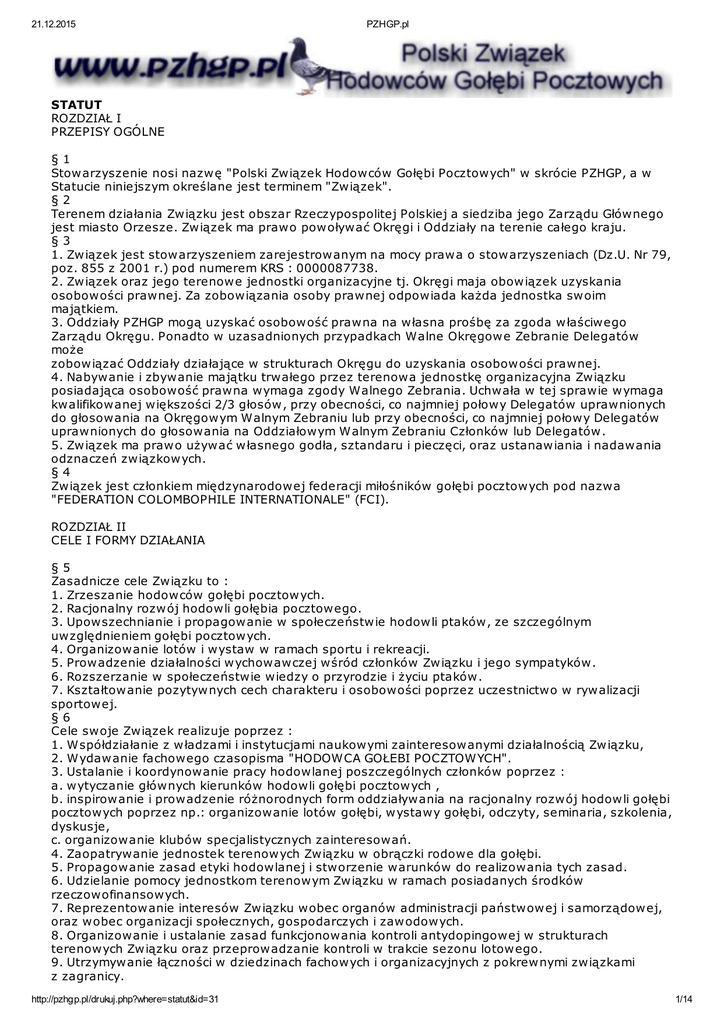 21.12.2015 PZHGP.pl STATUT ROZDZIAŁ I PRZEPISY OGÓLNE §1 Stowarzyszenie nosi nazwę "Polski Związek Hodowców Gołębi Pocztowych" w skrócie PZHGP, a w Statucie niniejszym określane jest terminem "Związek". §2 Terenem działania Związku jest obszar Rzeczypospolitej Polskiej a siedziba jego Zarządu Głównego jest miasto Orzesze. Związek ma prawo powoływać Okręgi i Oddziały na terenie całego kraju. §3 1. Związek jest stowarzyszeniem zarejestrowanym na mocy prawa o stowarzyszeniach (Dz.U. Nr 79, poz. 855 z 2001 r.) pod numerem KRS : 0000087738. 2. Związek oraz jego terenowe jednostki organizacyjne tj. Okręgi maja obowiązek uzyskania osobowości prawnej. Za zobowiązania osoby prawnej odpowiada każda jednostka swoim majątkiem. 3. Oddziały PZHGP mogą uzyskać osobowość prawna na własna prośbę za zgoda właściwego Zarządu Okręgu. Ponadto w uzasadnionych przypadkach Walne Okręgowe Zebranie Delegatów może zobowiązać Oddziały działające w strukturach Okręgu do uzyskania osobowości prawnej. 4. Nabywanie i zbywanie majątku trwałego przez terenowa jednostkę organizacyjna Związku posiadająca osobowość prawna wymaga zgody Walnego Zebrania. Uchwała w tej sprawie wymaga kwalifikowanej większości 2/3 głosów, przy obecności, co najmniej połowy Delegatów uprawnionych do głosowania na Okręgowym Walnym Zebraniu lub przy obecności, co najmniej połowy Delegatów uprawnionych do głosowania na Oddziałowym Walnym Zebraniu Członków lub Delegatów. 5. Związek ma prawo uż ywać własnego godła, sztandaru i pieczęci, oraz ustanawiania i nadawania odznaczeń związkowych. §4 Związek jest członkiem międzynarodowej federacji miłośników gołębi pocztowych pod nazwa "FEDERATION COLOMBOPHILE INTERNATIONALE" (FCI). ROZDZIAŁ II CELE I FORMY DZIAŁANIA §5 Zasadnicze cele Związku to : 1. Zrzeszanie hodowców gołębi pocztowych. 2. Racjonalny rozwój hodowli gołębia pocztowego. 3. Upowszechnianie i propagowanie w społeczeństwie hodowli ptaków, ze szczególnym uwzględnieniem gołębi pocztowych. 4. Organizowanie lotów i wystaw w ramach sportu i rekreacji. 5. Prowadzenie działalności wychowawczej wśród członków Związku i jego sympatyków. 6. Rozszerzanie w społeczeństwie wiedzy o przyrodzie i ż yciu ptaków. 7. Kształtowanie pozytywnych cech charakteru i osobowości poprzez uczestnictwo w rywalizacji sportowej. §6 Cele swoje Związek realizuje poprzez : 1. Współdziałanie z władzami i instytucjami naukowymi zainteresowanymi działalnością Związku, 2. Wydawanie fachowego czasopisma "HODOWCA GOŁEBI POCZTOWYCH". 3. Ustalanie i koordynowanie pracy hodowlanej poszczególnych członków poprzez : a. wytyczanie głównych kierunków hodowli gołębi pocztowych , b. inspirowanie i prowadzenie różnorodnych form oddziaływania na racjonalny rozwój hodowli gołębi pocztowych poprzez np.: organizowanie lotów gołębi, wystawy gołębi, odczyty, seminaria, szkolenia, dyskusje, c. organizowanie klubów specjalistycznych zainteresowań. 4. Zaopatrywanie jednostek terenowych Związku w obrączki rodowe dla gołębi. 5. Propagowanie zasad etyki hodowlanej i stworzenie warunków do realizowania tych zasad. 6. Udzielanie pomocy jednostkom terenowym Związku w ramach posiadanych środków rzeczowofinansowych. 7. Reprezentowanie interesów Związku wobec organów administracji państwowej i samorządowej, oraz wobec organizacji społecznych, gospodarczych i zawodowych. 8. Organizowanie i ustalanie zasad funkcjonowania kontroli antydopingowej w strukturach terenowych Związku oraz przeprowadzanie kontroli w trakcie sezonu lotowego. 9. Utrzymywanie łączności w dziedzinach fachowych i organizacyjnych z pokrewnymi związkami z zagranicy. http://pzhgp.pl/drukuj.php?where=statut&id=31 1/14 21.12.2015 PZHGP.pl 10. Propagowanie wiedzy na temat hodowli ptaków i ich ochronie wśród lokalnej społeczności. §7 Związek może prowadzić działalność gospodarcza według zasad określonych w odrębnych przepisach, z zastrzeżeniem, ż e dochód z działalności gospodarczej służy wyłącznie działalności statutowej i nie może być przeznaczony do podziału miedzy członków Związku. ROZDZIAŁ III CZŁONKOWIE ICH PRAWA I OBOWIĄZKI §8 1. Członkiem Związku może zostać osoba fizyczna i osoba prawna. 2. Członkowie Związku dzielą się na : a. członków zwyczajnych, b. członków nadzwyczajnych, c. członków honorowych, d. członków wspierających. §9 1. Członkiem zwyczajnym Związku może być obywatel Polski i cudzoziemiec, jeżeli : a. hoduje gołębie pocztowe na terenie Polski, b. wniesie pisemna deklaracje do wybranego przez siebie Zarządu Oddziału i załączy do niej pisemną pozytywna opinie 2 członków Oddziału do którego chce wstąpić, c. zda egzamin ze znajomości podstawowych zasad hodowli gołębia pocztowego, znajomości Statutu i regulaminów PZHGP, d. uiści przewidziana Regulaminem Organizacyjnym PZHGP opłatę wpisowa, e. zostanie przyjęty przez Zarząd Oddziału. 2. W przypadku nie przyjęcia kandydata na członka przez Zarząd Oddziału, od uchwały Zarządu Oddziału odmawiającej przyjęcia członka, zainteresowanemu służy prawo odwołania się do Walnego Zebrania Oddziału w terminie 30 dni od daty otrzymania treści uchwały na piśmie. Uchwała ta winna być doręczona stronie w ciągu 30 dni od daty jej podjęcia i zawierać uzasadnienie odmowy. Uchwała Walnego Zebrania Oddziału, jest ostateczna i nie podlega odwołaniu w ramach Związku. 3. Po wyczerpaniu postepowania wewnątrz organizacyjnego, w sprawach związanych z odmowa przyjęcia do stowarzyszenia osoba zainteresowana może dochodzić swych praw na drodze sadowej przed sadami powszechnymi. 4. Członkiem nadzwyczajnym Związku może być osoba niepełnoletnia w wieku od 11 do 16 lat, jeżeli spełni warunki wymienione w § 9 pkt.1 ppkt. a,b,d,e oraz otrzyma pisemna zgodę rodziców względnie opiekunów oraz ich opiekę podczas sprawowani