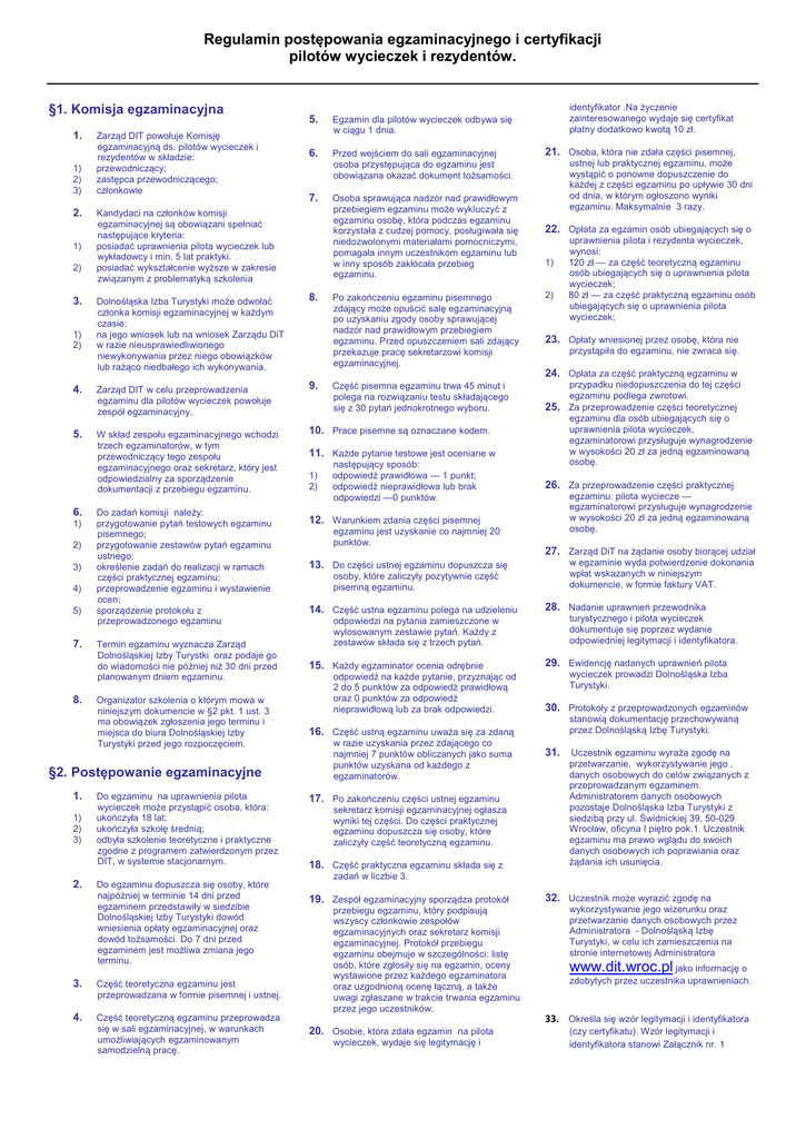 Regulamin postępowania egzaminacyjnego i certyfikacji pilotów wycieczek i rezydentów. §1. Komisja egzaminacyjna 1. 1) 2) 3) 2. 1) 2) Zarząd DIT powołuje Komisję egzaminacyjną ds. pilotów wycieczek i rezydentów w składzie: przewodniczący; zastępca przewodniczącego; członkowie 5. Egzamin dla pilotów wycieczek odbywa się w ciągu 1 dnia. 6. Przed wejściem do sali egzaminacyjnej osoba przystępująca do egzaminu jest obowiązana okazać dokument tożsamości. 7. Osoba sprawująca nadzór nad prawidłowym przebiegiem egzaminu może wykluczyć z egzaminu osobę, która podczas egzaminu korzystała z cudzej pomocy, posługiwała się niedozwolonymi materiałami pomocniczymi, pomagała innym uczestnikom egzaminu lub w inny sposób zakłócała przebieg egzaminu. Kandydaci na członków komisji egzaminacyjnej są obowiązani spełniać następujące kryteria: posiadać uprawnienia pilota wycieczek lub wykładowcy i min. 5 lat praktyki. posiadać wykształcenie wyższe w zakresie związanym z problematyką szkolenia Po zakończeniu egzaminu pisemnego zdający może opuścić salę egzaminacyjną po uzyskaniu zgody osoby sprawującej nadzór nad prawidłowym przebiegiem egzaminu. Przed opuszczeniem sali zdający przekazuje pracę sekretarzowi komisji egzaminacyjnej. Dolnośląska Izba Turystyki może odwołać członka komisji egzaminacyjnej w każdym czasie: na jego wniosek lub na wniosek Zarządu DiT w razie nieusprawiedliwionego niewykonywania przez niego obowiązków lub rażąco niedbałego ich wykonywania. 8. 4. Zarząd DIT w celu przeprowadzenia egzaminu dla pilotów wycieczek powołuje zespół egzaminacyjny. 9. 5. W skład zespołu egzaminacyjnego wchodzi trzech egzaminatorów, w tym przewodniczący tego zespołu egzaminacyjnego oraz sekretarz, który jest odpowiedzialny za sporządzenie dokumentacji z przebiegu egzaminu. 10. Prace pisemne są oznaczane kodem. 3. 1) 2) 6. 1) 2) 3) 4) 5) 7. 8. Do zadań komisji należy: przygotowanie pytań testowych egzaminu pisemnego; przygotowanie zestawów pytań egzaminu ustnego; określenie zadań do realizacji w ramach części praktycznej egzaminu; przeprowadzenie egzaminu i wystawienie ocen; sporządzenie protokołu z przeprowadzonego egzaminu Termin egzaminu wyznacza Zarząd Dolnośląskiej Izby Turystki oraz podaje go do wiadomości nie później niż 30 dni przed planowanym dniem egzaminu. Organizator szkolenia o którym mowa w niniejszym dokumencie w §2 pkt. 1 ust. 3 ma obowiązek zgłoszenia jego terminu i miejsca do biura Dolnośląskiej Izby Turystyki przed jego rozpoczęciem. §2. Postępowanie egzaminacyjne 1. 1) 2) 3) 2. Do egzaminu na uprawnienia pilota wycieczek może przystąpić osoba, która: ukończyła 18 lat; ukończyła szkołę średnią; odbyła szkolenie teoretyczne i praktyczne zgodne z programem zatwierdzonym przez DIT, w systemie stacjonarnym. Do egzaminu dopuszcza się osoby, które najpóźniej w terminie 14 dni przed egzaminem przedstawiły w siedzibie Dolnośląskiej Izby Turystyki dowód wniesienia opłaty egzaminacyjnej oraz dowód tożsamości. Do 7 dni przed egzaminem jest możliwa zmiana jego terminu. 3. Część teoretyczna egzaminu jest przeprowadzana w formie pisemnej i ustnej. 4. Część teoretyczną egzaminu przeprowadza się w sali egzaminacyjnej, w warunkach umożliwiających egzaminowanym samodzielną pracę. identyfikator .Na życzenie zainteresowanego wydaje się certyfikat płatny dodatkowo kwotą 10 zł. 21. Osoba, która nie zdała części pisemnej, ustnej lub praktycznej egzaminu, może wystąpić o ponowne dopuszczenie do każdej z części egzaminu po upływie 30 dni od dnia, w którym ogłoszono wyniki egzaminu. Maksymalnie 3 razy. 22. Opłata za egzamin osób ubiegających się o 1) 2) uprawnienia pilota i rezydenta wycieczek, wynosi: 120 zł — za część teoretyczną egzaminu osób ubiegających się o uprawnienia pilota wycieczek; 80 zł — za część praktyczną egzaminu osób ubiegających się o uprawnienia pilota wycieczek; 23. Opłaty wniesionej przez osobę, która nie przystąpiła do egzaminu, nie zwraca się. 24. Opłata za część praktyczną egzaminu w Część pisemna egzaminu trwa 45 minut i polega na rozwiązaniu testu składającego się z 30 pytań jednokrotnego wyboru. 11. Każde pytanie testowe jest oceniane w 1) 2) następujący sposób: odpowiedź prawidłowa — 1 punkt; odpowiedź nieprawidłowa lub brak odpowiedzi —0 punktów. przypadku niedopuszczenia do tej części egzaminu podlega zwrotowi. 25. Za przeprowadzenie części teoretycznej egzaminu dla osób ubiegających się o uprawnienia pilota wycieczek, egzaminatorowi przysługuje wynagrodzenie w wysokości 20 zł za jedną egzaminowaną osobę. 26. Za przeprowadzenie części praktycznej egzaminu: pilota wyciecze — egzaminatorowi przysługuje wynagrodzenie w wysokości 20 zł za jedną egzaminowaną osobę. 12. Warunkiem zdania części pisemnej egzaminu jest uzyskanie co najmniej 20 punktów. 27. Zarząd DiT na żądanie osoby biorącej udział w egzaminie wyda potwierdzenie dokonania wpłat wskazanych w niniejszym dokumencie, w formie faktury VAT. 13. Do części ustnej egzaminu dopuszcza się osoby, które zaliczyły pozytywnie część pisemną egzaminu. 14. Część ustna egzaminu polega na udzieleniu 28. Nadanie uprawnień przewodnika turystycznego i pilota wycieczek dokumentuje się poprzez wydanie odpowiedniej legitymacji i identyfikatora. odpowiedzi na pytania zamieszczone w wylosowanym zestawie pytań. Każdy z zestawów składa się z trzech pytań. 15. Każdy egzaminator ocenia odrębnie odpowiedź na każde pytanie, przyznając od 2 do 5 punktów za odpowiedź prawidłową oraz 0 punktów za odpowiedź nieprawidłową lub za brak odpowiedzi. 29. Ewidencję nadanych uprawnień pilota wycieczek prowadzi Dolnośląska Izba Turystyki. 30. Protokoły z przeprowadzonych egzaminów stanowią dokumentację przechowywaną przez Dolnośląską Izbę Turystyki. 16. Część ustną egza