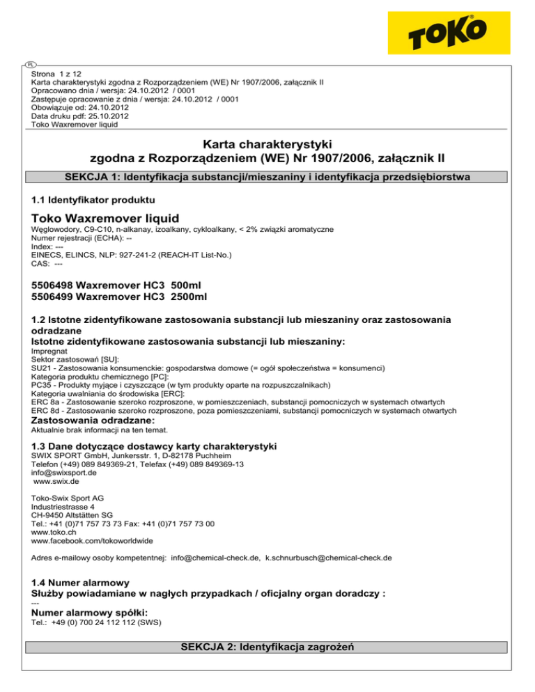 Strona 1 z 12 Karta charakterystyki zgodna z Rozporządzeniem (WE) Nr 1907/2006, załącznik II Opracowano dnia / wersja: 24.10.2012 / 0001 Zastępuje opracowanie z dnia / wersja: 24.10.2012 / 0001 Obowiązuje od: 24.10.2012 Data druku pdf: 25.10.2012 Toko Waxremover liquid Karta charakterystyki zgodna z Rozporządzeniem (WE) Nr 1907/2006, załącznik II SEKCJA 1: Identyfikacja substancji/mieszaniny i identyfikacja przedsiębiorstwa 1.1 Identyfikator produktu Toko Waxremover liquid Węglowodory, C9-C10, n-alkanay, izoalkany, cykloalkany, < 2% związki aromatyczne Numer rejestracji (ECHA): -Index: --EINECS, ELINCS, NLP: 927-241-2 (REACH-IT List-No.) CAS: --- 5506498 Waxremover HC3 500ml 5506499 Waxremover HC3 2500ml 1.2 Istotne zidentyfikowane zastosowania substancji lub mieszaniny oraz zastosowania odradzane Istotne zidentyfikowane zastosowania substancji lub mieszaniny: Impregnat Sektor zastosowań [SU]: SU21 - Zastosowania konsumenckie: gospodarstwa domowe (= ogół społeczeństwa = konsumenci) Kategoria produktu chemicznego [PC]: PC35 - Produkty myjące i czyszczące (w tym produkty oparte na rozpuszczalnikach) Kategoria uwalniania do środowiska [ERC]: ERC 8a - Zastosowanie szeroko rozproszone, w pomieszczeniach, substancji pomocniczych w systemach otwartych ERC 8d - Zastosowanie szeroko rozproszone, poza pomieszczeniami, substancji pomocniczych w systemach otwartych Zastosowania odradzane: Aktualnie brak informacji na ten temat. 1.3 Dane dotyczące dostawcy karty charakterystyki SWIX SPORT GmbH, Junkersstr. 1, D-82178 Puchheim Telefon (+49) 089 849369-21, Telefax (+49) 089 849369-13 [email protected] www.swix.de Toko-Swix Sport AG Industriestrasse 4 CH-9450 Altstätten SG Tel.: +41 (0)71 757 73 73 Fax: +41 (0)71 757 73 00 www.toko.ch www.facebook.com/tokoworldwide Adres e-mailowy osoby kompetentnej: [email protected], [email protected] 1.4 Numer alarmowy Służby powiadamiane w nagłych przypadkach / oficjalny organ doradczy : --- Numer alarmowy spółki: Tel.: +49 (0) 700 24 112 112 (SWS) SEKCJA 2: Identyfikacja zagrożeń Strona 2 z 12 Karta charakterystyki zgodna z Rozporządzeniem (WE) Nr 1907/2006, załącznik II Opracowano dnia / wersja: 24.10.2012 / 0001 Zastępuje opracowanie z dnia / wersja: 24.10.2012 / 0001 Obowiązuje od: 24.10.2012 Data druku pdf: 25.10.2012 Toko Waxremover liquid 2.1 Klasyfikacja substancji lub mieszaniny 2.1.1 Klasyfikacja zgodnie z rozporządzeniem (WE) Nr 1272/2008 (CLP) Klasa zagrożenia Kategoria zagrożenia Zwrot określający zagrożenie Flam. Liq. 3 H226-Łatwopalna ciecz i pary. Asp. Tox. 1 H304-Połknięcie i dostanie się przez drogi oddechowe może grozić śmiercią. STOT SE 3 H336-Może wywoływać uczucie senności lub zawroty głowy. Aquatic Chronic 3 H412-Działa szkodliwie na organizmy wodne, powodując długotrwałe skutki. 2.1.2 Klasyfikacja zgodnie z dyrektywami 67/548/EWG oraz 1999/45/WE (łącznie ze zmianami) Łatwopalny, R10 Produkt niebezpieczny dla środowiska, R52-53 Xn, Produkt szkodliwy, R65 R66 R67 2.2 Elementy oznakowania 2.2.1 Oznakowanie zgodnie z rozporządzeniem (WE) Nr 1272/2008 (CLP) Węglowodory, C9-C10, n-alkanay, izoalkany, cykloalkany, < 2% związki aromatyczne CAS ---, Index:--- EC: 927-241-2 (REACH-IT List-No.) Niebezpieczeństwo Zwrot określający zagrożenie H226-Łatwopalna ciecz i pary. H304-Połknięcie i dostanie się przez drogi oddechowe może grozić śmiercią. H336-Może wywoływać uczucie senności lub zawroty głowy. H412-Działa szkodliwie na organizmy wodne, powodując długotrwałe skutki. P101-W razie konieczności zasięgnięcia porady lekarza należy pokazać pojemnik lub etykietę. P102-Chronić przed dziećmi. Zapobieganie P210-Przechowywać z dala od źródeł ciepła/iskrzenia/otwartego ognia/gorących powierzchni. Palenie wzbronione. P243Przedsięwziąć środki ostrożności zapobiegające statycznemu rozładowaniu. P261-Unikać wdychania pary i rozpylonej cieczy. P271-Stosować wyłącznie na zewnątrz lub w dobrze wentylowanym pomieszczeniu Reagowanie P301+P310-W PRZYPADKU POŁKNIĘCIA: Natychmiast skontaktować się z OŚRODKIEM ZATRUĆ lub z lekarzem. P331-NIE wywoływać wymiotów. Przechowywanie P405-Przechowywać pod zamknięciem. Usuwanie P501-Zawartość/pojemnik przekazać do utylizacji odpadów specjalnych. EUH066-Powtarzające się narażenie może powodować wysuszanie lub pękanie skóry. 2.3 Inne zagrożenia Brak substancji vPvB Brak substancji PBT Strona 3 z 12 Karta charakterystyki zgodna z Rozporządzeniem (WE) Nr 1907/2006, załącznik II Opracowano dnia / wersja: 24.10.2012 / 0001 Zastępuje opracowanie z dnia / wersja: 24.10.2012 / 0001 Obowiązuje od: 24.10.2012 Data druku pdf: 25.10.2012 Toko Waxremover liquid Rozporządzenie (WE) Nr 648/2004 30 % i więcej węglowodorów alifatycznych SEKCJA 3: Skład/informacja o składnikach 3.1 Substancja Węglowodory, C9-C10, n-alkanay, izoalkany, cykloalkany, < 2% związki aromatyczne Numer rejestracji (REACH) Index EINECS, ELINCS, NLP CAS Stęż.% Klasyfikacja zgodnie z dyrektywą 67/548/EWG Klasyfikacja zgodnie z rozporządzeniem (WE) Nr 1272/2008 (CLP) ---927-241-2 (REACH-IT List-No.) CAS --Łatwopalny, R10 Produkt niebezpieczny dla środowiska, R52-53 Produkt szkodliwy, Xn, R65 R66 R67 Flam. Liq. 3, H226 Asp. Tox. 1, H304 STOT SE 3, H336 Aquatic Chronic 3, H412 3.2 Mieszanina n.s. Tekst formuł R i H, a także ich kod klasyfikacji (GHS/CLP) patrz sekcja 16. SEKCJA 4: Środki pierwszej pomocy 4.1 Opis środków pierwszej pomocy Nieprzytomnej osobie nigdy nie wlewać nic do ust! Drogi oddechowe Osobę usunąć z zagrożonej strefy. Osobie zapewnić dopływ świeżego powietrza, w zależności od objawów skonsultować się z lekarzem. W przypadku utraty przytomności poszkodowanego położyć w stabilnej pozycji bocznej i bezzwłocznie zasięgnąć porady lekarskiej. Kontakt ze skórą Zanieczyszczone, nasączone ubranie należy niezwłocznie zdjąć, dokładnie wyprać w wodzie z mydłem, w razie podrażnienia skóry