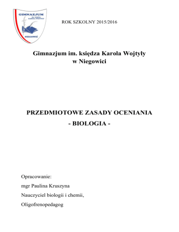 ROK SZKOLNY 2015/2016 Gimnazjum im. księdza Karola Wojtyły w Niegowici PRZEDMIOTOWE ZASADY OCENIANIA - BIOLOGIA - Opracowanie: mgr Paulina Kruszyna Nauczyciel biologii i chemii, Oligofrenopedagog Gimnazjum im. księdza Karola Wojtyły w Niegowici Przedmiotowe Zasady oceniania z Biologii - Rok szkolny 2015/2016 - Paulina Kruszyna __________________________________________________________________________________ I. Podstawa Prawna: Przedmiotowe zasady oceniania z chemii i biologii w klasach I-III zostały opracowane w oparciu o analizę następujących dokumentów: Rozporządzenie ministra edukacji narodowej z 10 czerwca 2015 r. w sprawie szczegółowych warunków i sposobu oceniania, klasyfikowania i promowania uczniów oraz słuchaczy w szkołach publicznych (Dz.U. poz. 843), Podstawę programową z biologii dla klas I-III gimnazjum (Dz. U. z 2009 r. Nr 4, poz. 17), Program nauczania: Biologii w gimnazjum. - Nowa Era "Puls życia" Anna Zdziennicka; WSIP "Bliżej Biologii" Ewa Pyłka-Gutowska, Ewa Jastrzębska Statut Gimnazjum w Niegowici II. Ogólne zasady oceniania: Na początku roku szkolnego uczniowie są poinformowani przez nauczyciela przedmiotu o zakresie wymagań z chemii, obowiązujących w danym roku szkolnym (zakres wiadomości i umiejętności) oraz o sposobach i zasadach oceniania z w/w przedmiotu. Ocena okresowa i roczna uwzględnia oceny cząstkowe wystawiane uczniom za wiedzę i umiejętności z form aktywności obowiązujących w danym okresie. Przy ustalaniu oceny semestralnej i rocznej nauczyciel bierze pod uwagę stopnie uczniów poszczególnych obszarów działalności według następującej kolejności i wagi: Praca klasowa, sprawdzian pisemny, egzamin próbny – waga 3 Kartkówka – waga 2 Odpowiedź ustana – waga 2 Praca domowa – waga 1 Prowadzenie zeszytów przedmiotowych - waga 1 Aktywność na lekcji – waga 1 Prace dodatkowe - waga 1 Osiągnięte sukcesy w konkursach i olimpiadach przedmiotowych wpływają na podwyższenie oceny. W stosunku do ucznia, u którego stwierdzono specyficzne trudności w uczeniu się lub deficyty rozwojowe ( uniemożliwiające sprostanie wymaganiom edukacyjnym wynikającym z realizowanego programu nauczania) potwierdzone pisemną opinią poradni psychologiczno-pedagogicznej lub innej upoważnionej poradni specjalistycznej, nauczyciel obniżył wymagania edukacyjne w porozumieniu z jego rodzicami oraz pedagogiem szkolnym. Ocena okresowa i roczna nie jest średnią arytmetyczną ocen cząstkowych. Ocena okresowa i roczna jest średnią ważoną ocen cząstkowych i jest obliczana według wzoru: ó Ocenę semestralną i roczną nauczyciel wystawia według schematu: Średnia ważona: 5,76 – 6,00 4,76 – 5,75 3,76 – 4,75 2,76 – 3,75 1,6 -2,75 0,00 – 1,5 Ocena: Celujący Bardzo dobry Dobry Dostateczny Dopuszczający Niedostateczny Ocena roczna w klasie trzeciej jest równocześnie oceną końcową. Uczeń raz w okresie może zgłosić bez konsekwencji, że jest nieprzygotowany do zajęć edukacyjnych. 2 Gimnazjum im. księdza Karola Wojtyły w Niegowici Przedmiotowe Zasady oceniania z Biologii - Rok szkolny 2015/2016 - Paulina Kruszyna __________________________________________________________________________________ Zgłaszane przez ucznia nieprzygotowanie do zajęć nauczyciel odnotowuje wpisując „np”. Uczeń nie może zgłosić nieprzygotowania na sprawdzianie. Uczeń raz w okresie może zgłosić bez konsekwencji, że nie posiada zeszytu przedmiotowego lub zadania domowego. Zgłaszany przez ucznia brak zeszytu lub zadania domowego odnotowywany jest przez nauczyciela w postaci "bz". Chęć zgłoszenia przez ucznia "np" lub "bz" uczeń sygnalizuje nauczycielowi poprzez podniesienie ręki w trakcie sprawdzania obecności w klasie. Nieobecność na lekcji nie zwalnia z przygotowania się do lekcji i możliwości odpowiedzi. III. Sposoby i formy sprawdzania osiągnięć edukacyjnych uczniów: - Prace klasowe, sprawdziany pisemne, egzamin próbny: Nauczyciel zapowiada tę formę odpowiedzi pisemnej z co najmniej z tygodniowym wyprzedzeniem z dokładnie określonej partii materiału lub działu. Informacja ta zostaje zanotowana w dzienniku. Sprawdziany są poprzedzone lekcją powtórzeniową, na która uczeń musi być przygotowany z zapowiedzianej partii materiału lub działu. Sprawdziany (lub egzamin próbny) są obowiązkowe. Jeżeli z przyczyn losowych uczeń nie może napisać go z całą klasą to musi to uczynić w terminie uzgodnionym wraz z nauczycielem. W przypadku nieobecności trwającej siedem dni bądź krócej, uczeń zobligowany jest do napisania zaległego sprawdzianu w terminie nieprzekraczającym dwa tygodnie od czasu napisania sprawdzianu przez całą klasę. Przy dłużej nieobecności niż siedem dni uczeń uzgadnia termin zaliczenia wraz z nauczycielem. W przypadku gdy nieobecność ucznia jest nieusprawiedliwiona, uczeń ten może być rozliczony na kolejnej lekcji, na której jest obecny. Jeżeli uczeń nie przystąpi do sprawdzianu w wyznaczonym terminie, a jego nieobecność nie będzie usprawiedliwiona to uczeń otrzymuje ocenę niedostateczną. Stosuje sie podział na grupy. Nauczyciel jest zobowiązany ocenić i udostępnić uczniom prace pisemne, w ciągu 2 tygodni od daty napisania. Prace oceniane są punktowo. Za każde zadanie przyznaje się określoną liczbę punktów. Punkty są sumowane i zamieniane na ocenę według następujących wskaźników procentowych: Ocena: Celujący Bardzo dobry Dobry Dostateczny Dopuszczający Niedostateczny Skala: 100% 90% - 99% 74% - 89% 50% - 73% 34% - 49% 0% - 33% Jeżeli w czasie pracy pisemnej uczeń korzysta z niedozwolonych materiałów lub rozmawia otrzymuje ocenę niedostateczną, traci możliwość poprawy oceny oraz otrzymuje ocenę negatywna z zachowania. Każda forma wypowiedzi ustnej podczas pracy pisemnej bez zezwolenia nauczyciela traktowana jest jako forma korzystania z podpowiedzi kolegów i również skutkuje oceną niedostateczną bez