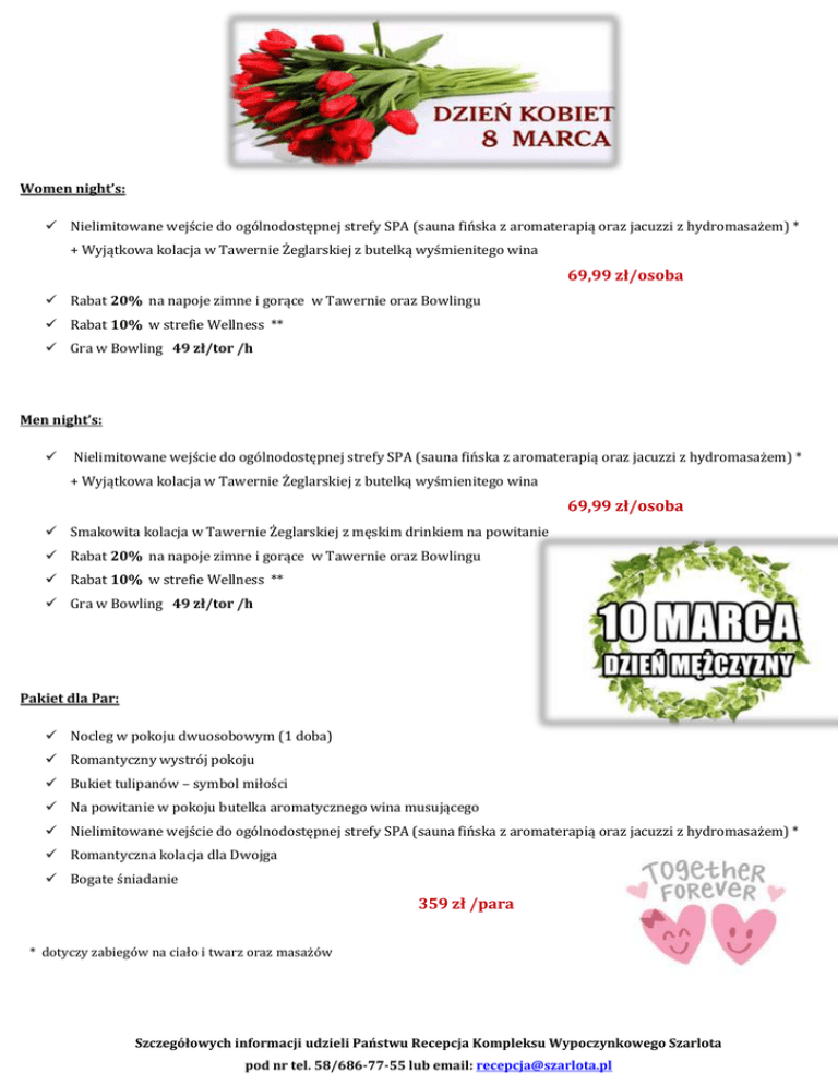 Women night’s: Nielimitowane wejście do ogólnodostępnej strefy SPA (sauna fińska z aromaterapią oraz jacuzzi z hydromasażem) * + Wyjątkowa kolacja w Tawernie Żeglarskiej z butelką wyśmienitego wina 69,99 zł/osoba Rabat 20% na napoje zimne i gorące w Tawernie oraz Bowlingu Rabat 10% w strefie Wellness ** Gra w Bowling 49 zł/tor /h Men night’s: Nielimitowane wejście do ogólnodostępnej strefy SPA (sauna fińska z aromaterapią oraz jacuzzi z hydromasażem) * + Wyjątkowa kolacja w Tawernie Żeglarskiej z butelką wyśmienitego wina 69,99 zł/osoba Smakowita kolacja w Tawernie Żeglarskiej z męskim drinkiem na powitanie Rabat 20% na napoje zimne i gorące w Tawernie oraz Bowlingu Rabat 10% w strefie Wellness ** Gra w Bowling 49 zł/tor /h Pakiet dla Par: Nocleg w pokoju dwuosobowym (1 doba) Romantyczny wystrój pokoju Bukiet tulipanów – symbol miłości Na powitanie w pokoju butelka aromatycznego wina musującego Nielimitowane wejście do ogólnodostępnej strefy SPA (sauna fińska z aromaterapią oraz jacuzzi z hydromasażem) * Romantyczna kolacja dla Dwojga Bogate śniadanie 359 zł /para * dotyczy zabiegów na ciało i twarz oraz masażów Szczegółowych informacji udzieli Państwu Recepcja Kompleksu Wypoczynkowego Szarlota pod nr tel. 58/686-77-55 lub email: [email protected]