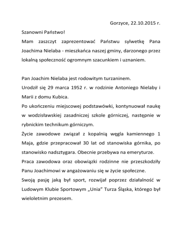 Gorzyce, 22.10.2015 r. Szanowni Państwo! Mam zaszczyt zaprezentować Państwu sylwetkę Pana Joachima Nielaba - mieszkańca naszej gminy, darzonego przez lokalną społeczność ogromnym szacunkiem i uznaniem. Pan Joachim Nielaba jest rodowitym turzaninem. Urodził się 29 marca 1952 r. w rodzinie Antoniego Nielaby i Marii z domu Kubica. Po ukończeniu miejscowej podstawówki, kontynuował naukę w wodzisławskiej zasadniczej szkole górniczej, następnie w rybnickim technikum górniczym. Życie zawodowe związał z kopalnią węgla kamiennego 1 Maja, gdzie przepracował 30 lat od stanowiska górnika, po stanowisko nadsztygara. Obecnie przebywa na emeryturze. Praca zawodowa oraz obowiązki rodzinne nie przeszkodziły Panu Joachimowi w angażowaniu się w życie społeczne. Swoją pasję jaką był sport, rozwijał poprzez działalność w Ludowym Klubie Sportowym „Unia” Turza Śląska, którego był wieloletnim prezesem. Sportowe zainteresowania potwierdza także działalność w Radzie Sportu Gminy Gorzyce, gdzie przez wiele lat pełnił funkcję przewodniczącego. W latach 80-tych, wielkim przedsięwzięciem w Turzy Śląskiej była budowa Domu Sportu, Kultury i Rekreacji przy boisku sportowym. Przy realizacji tej inwestycji Pan Joachim Nielaba pełnił funkcję Przewodniczącego Społecznego Komitetu Budowy. Dzięki zaangażowaniu wszystkich mieszkańców, w 1994 roku Dom Sportu, Kultury i Rekreacji w Turzy Śląskiej został oddany do użytku i do dnia dzisiejszego jest miejscem licznych imprez okolicznościowych, spotkań czy konferencji. W 2012 roku rozpoczęte zostały prace przy modernizacji boiska. Było to wielkie i długo oczekiwane przedsięwzięcie dla tej miejscowości. Boisko wymagało gruntownej przebudowy i we wrześniu 2013 roku oficjalnie zostało przekazane do użytku. Dzięki staraniom lokalnych władz samorządowych społeczność może się cieszyć wspaniałym boiskiem, co z pewnością przyczyniło się do ostatnich sukcesów miejscowych piłkarzy. Uhonorowaniem wieloletniej pracy i zaangażowania Pana Joachima Nielaby w miejscowy sport jest zdobyty awans klubu do IV ligi. Za wybitne osiągnięcia w dziedzinie sportu, za zaangażowanie i oddanie w pracę klubu otrzymał tytuł Honorowego Prezesa Klubu oraz odznaczenia, którymi uhonorowany został w trakcie jubileuszu 90-lecia istnienia Klubu. Po wielu latach aktywności sportowej, pan Joachim zrezygnował z funkcji prezesa i zaangażował się w inicjatywy lokalne. Jego priorytetem stało się mobilizowanie i aktywizowanie mieszkańców w różnorakie inicjatywach społeczne m.in. w „Olimpiady Parafialne”, Dożynki Gminne czy też będącą już na ukończeniu - budowę nowego przedszkola. Działalność społeczna Pana Joachima dotyka wielu płaszczyzn. Zaangażowany jest w życie prawie wszystkich organizacji działających na terenie sołectwa. Jest aktywnym członkiem Ochotniczej Straży Pożarnej, Związku Emerytów Rencistów i Inwalidów. Czynnie wspiera działalność miejscowego Koła Gospodyń Wiejskich. W latach 70-tych, dwie kadencje udzielał się jako radny. Obecnie pełni funkcję sekretarza w Rejonowym Związku Spółek Wodnych Melioracyjnych. Wnioskodawcy piszą „Od 2007 roku Nasza Mała Ojczyzna – Turza Śląska zyskała dobrego i troskliwego „ojca” wyjątkowego Sołtysa, Pana Joachima (…). Jego oddanie dla naszej wsi, jest godne podziwu i uznania. Pan Joachim żywo interesuje się naszymi problemami i sukcesami. Jest zawsze blisko nas, prostych ludzi. Stara się być tam, gdzie jest taka potrzeba. Nie uchyla się od odpowiedzialności, kiedy coś pójdzie nie tak. Wszystko co robi, robi z wielkiej miłości do tego miejsca, gdzie został wychowany, gdzie spędził tyle lat swojego życia”. Całokształt pracy Pana Joachima Nielaby, zaangażowanie i poświęcenie przyczyniły się do osiągnięcia przez sołectwo w 2012 roku zaszczytnego tytułu: „Piękna Wieś Województwa Śląskiego”. Niewątpliwie jest to po raz kolejny ogromna promocja dla naszej gminy w województwie śląskim. Następna miejscowość, która uzyskała tak znakomity tytuł i została wyróżniona wśród wielu wsi startujących w tym konkursie. Postawa Pana Joachima Nielaby budzi powszechny szacunek i z pewnością stanowi wzór do naśladowania dla młodego pokolenia. Wywodzący się z Turzy Śląskiej, ks. dr hab. Arkadiusz Wuwer, o Panu Joachimie tak mówi: „Pan Joachim Nielaba niewątpliwie godny jest zaszczytu nadania mu honorowego tytułu „Gorzyckiej Perły”, o co wnoszę z całym przekonaniem. Znając osobiście Pana Sołtysa mogę z całą stanowczością zaświadczyć, że sprawy Sołectwa i Gminy są jego całym życiem. Zwłaszcza po śmierci żony, śp. Ireny, całkowicie i z godnym podziwu uznaniem nie zachował ani ćwierci swojego życia na sprawy prywatne, całkowicie poświęcając się sprawom bezpośredniość, publicznym. dyspozycyjność, Ceniony za kompetencje, zaangażowanie, serdeczność, cieszy się powszechną estymą wśród mieszkańców Sołectwa. Jest nie tylko sprawnym organizatorem życia społecznego (pozyskiwanie środków na remonty dróg, boiska, itd...), ale także cenionym autorytetem moralnym (…). Pan Joachim to – jednym słowem – właściwy człowiek na właściwym miejscu. Z całego serca popieram wniosek o nadanie Panu Joachimowi Nielabie w/w tytułu z moralną pewnością, że swoim życiem, zaangażowaniem i postawą to nie tylko On będzie beneficjentem tytułu „Gorzyckiej Perły”, ale że to kapituła nagrody zostanie uhonorowana posiadaniem w gronie swoich laureatów tak znakomitego Krajana”. W uznaniu pracy na rzecz współtworzenia i integrowania społeczności gminy Gorzyce, szczególnie w roku jubileuszowym, kiedy obchodzimy 25-lecie samorządności w naszej ojczyźnie, wniosek o nominację Pana Joachima Nielaby do wyróżnienia tytułem honorowym „Gorzycka Perła" złożyło 91 mieszkańców Turzy Śląskiej przy poparciu: 