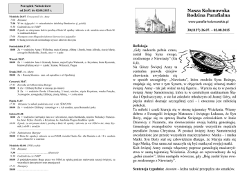 Porządek Nabożeństw od 26.07. do 02.08.2015 r. Niedziela 26.07. Uroczystość św. Anny 7:00 Różaniec 7:30 W int. żyjących i ++ mieszkańców dzielnicy Bendawice (j. polski) 9:30 Godzinki ku czci NMP 10:00 Z podz. za otrzymane łaski z prośbą o Boże bł. opiekę i zdrowie z ok. urodzin oraz o Boże bł. w rodzinach dzieci 17:00 Nieszpory oraz błogosławieństwo kierowców i pojazdów 18:00 O łaskę powrotu do normalnego życia i zdrowie dla syna Poniedziałek 27.07. 8:00 Za ++ rodziców Annę i Wilhelma, męża Georga, Albinę i Józefa, brata Alfreda, ciocię Marię, szwagrów Reinholda, Józefa, oraz ++ z pokr. Wtorek 28.07. 18:00 Za ++ rodziców Jana i Gertrudę Szaton, męża Eryka Walaszek, o. Krystiana, brata Ryszarda, bratową Helenę oraz ++ z pokr. Szaton, Walaszek, Piegsa Środa 29.07. św. Marty 18:00 Za + Renatę Skornia - zam. od sąsiadów z ul. Opolskiej Czwartek 30.07. 17:45 Koronka do Miłosierdzia Bożego 18:00 1. Za + Elżbietę Richter w miesiąc po śmierci 2. Za ++ rodziców Pawła i Franciszkę, 2 braci, teściów, zięcia Krystiana, wnuka Patryka, 3 szwagrów, szwagierkę Elżbietę, ciocię Albinę, ++ z obu stron Piątek 31.07. 17:30 Różaniec za młode pokolenie oraz w int. ŚDM 2016 18:00 Za ++ rodziców Elżbietę i Antoniego w r. ich urodzin, syna Bernarda i pokr. Sobota 01.08. 8:00 Za ++ rodziców Gertrudę i Jana w r. ich śmierci, męża Reinholda, teściów Waleskę i Franciszka, braci Eryka i Józefa, o Krystiana, ks. Joachima Piegsa dziadków i pokr. 16:00 Z podz. za otrzymane łaski z prośbą o Boże bł. opiekę i zdrowie za wst NSM w int. Anny Szymik z ok 60 r. urodzin ————————–—–——–————————————–——–—————— 17:00 Nabożeństwo Maryjne 18:00 O Boże bł. opiekę i zdrowie za wst NSM, światło Ducha Św. dla Daniela z ok. 18 r. urodzin oraz o Boże bł. w rodzinie Niedziela 02.08. XVIII zwykła 7:00 Różaniec 7:30 ………………………………(Deutsch) 9:30 Godzinki ku czci NMP 10:00 Z podziękowaniem Bogu przez wst NSM za opiekę podczas malowania naszej świątyni, za wszystkich darczyńców oraz pracujących 17:15 Nieszpory 18:00 ……………………………… Nasza Kolonowska Rodzina Parafialna www.parafia-kolonowskie.pl 30(1127) 26.07. – 02.08.2015 Refleksja „Gdy nadeszła pełnia czasu, zesłał Bóg Syna swego, zrodzonego z Niewiasty” (Ga 4,4). Na Górze Świętej Anny ta centralna prawda dziejów zbawienia uwydatnia się w sposób szczególny: „Niewiasta”, która zrodziła Syna Bożego, znajduje się, wraz z tym Synem, w objęciach swojej własnej matki: świętej Anny - tak jak widać na tej figurze... Wyraża się to w postaci świętej Anny Samotrzeciej, która tu w centralnym sanktuarium Śląska i Opolszczyzny, o sto lat zaledwie młodszym od Jasnej Góry, od pięciu stuleci doznaje szczególnej czci - i otoczona jest miłością pokoleń. Ta miłość i cześć kieruje się w stronę tajemnicy Wcielenia. Wiemy dobrze z Ewangelii świętego Mateusza i świętego Łukasza, że Syn Boży, stając się za sprawą Ducha Świętego człowiekiem w łonie Dziewicy z Nazaretu, ma równocześnie swoją ludzką genealogię. Genealogie ewangelistów wymieniają przede wszystkim męskich przodków Jezusa Chrystusa. W postaci świętej Anny Samotrzeciej uwydatnione jest przede wszystkim macierzyństwo: Matka - i matka Matki. Syn Boży stał się człowiekiem dlatego, że Maryja stała się Jego Matką. Ona sama zaś nauczyła się być matką od swojej matki. Kult świętej Anny zostaje włączony poprzez genealogię macierzyństwa w samą tajemnicę Wcielenia. Zostaje on wprowadzony do tej „pełni czasów”, która nastąpiła wówczas, gdy „Bóg zesłał Syna swego zrodzonego z Niewiasty”. Sentencja tygodnia: Anonim - Jedna radość przepędza sto smutków. 30/2015 PAPIESKA INTENCJA OGÓLNA Aby wszyscy ludzie pracujący na polu wolontariatu wielkodusznie angażowali się w służbę potrzebującym. PAPIESKA INTENCJA MISYJNA Abyśmy, wychodząc poza siebie, potrafili stawać się bliscy tym, którzy są na peryferiach więzi międzyludzkich i społecznych. ——–—–——————————————–—–————————— W sierpniu następujące Róże Różańcowe przewodniczą modlitwie różańcowej: 02.08. Róża 9 p. Maria Kruk 09.08. Róża 10 p. Rosilda Pawlik 15.08 Róża 11 p. Krystyna Swoboda 16.08. Róża 12 p. Manfred Ullmann 23.08. Róża 1 p. Teresa Obst 31.08. Róża 2 p. Anna Bock ——–—–——————————————–—–————————— Na wesoło Ksiądz na religii zwraca się do ucznia, patrząc mu wnikliwie w oczy:- Zawsze gdy jest klasówka Ciebie nie ma, bo babcia chora, tak?- Tak, proszę księdza, my też podejrzewamy, że babcia symuluje. Mąż po raz kolejny wraca po nadgodzinach do domu. Żona śpi, w sypialni jest zupełnie ciemno. Mężczyzna przez chwilę obija się o meble, w końcu zdenerwowany woła:- Kochanie! Zacznij wreszcie narzekać, bo nie mogę znaleźć łóżka! Mama pyta się swego synka: - Adam, jak się czujesz na religii?- Jak na komisariacie - Dlaczego?- Ksiądz ciągle mnie o coś wypytuje, a ja o niczym nie wiem. Idzie sobie baca i ciągnie na sznurku zegarek. Przechodzący turysta pyta zdziwiony: - A co to baco, zegarek na sznurku ciągniecie?- Ja go wreszcie nauczę chodzić! Lecą dwa gołębie a obok nich przelatuje odrzutowiec. Jeden mówi do drugiego: - Ale szybko leci.- Też byś tak szybko leciał jak by ci się ogon palił. Dziś przypada Uroczystość św. Anny, głównej patronki diecezji opolskiej. Kolekta przeznaczona będzie na cele parafii. Na nieszporach o godz. 17:00 błogosławieństwo kierowców i pojazdów. Zachęcamy do złożenia ofiary dla misjonarzy werbistów (1gr. za 1 kilometr). ——–————–—–———————–—–———–——–———–——————— W ponie