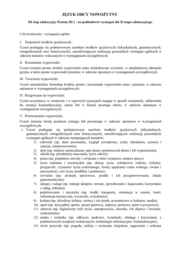 JĘZYK OBCY NOWOŻYTNY III etap edukacyjny Poziom III.1 - na podbudowie wymagań dla II etapu edukacyjnego Cele kształcenia - wymagania ogólne I. Znajomość środków językowych. Uczeń posługuje się podstawowym zasobem środków językowych (leksykalnych, gramatycznych, ortograficznych oraz fonetycznych), umożliwiającym realizację pozostałych wymagań ogólnych w zakresie tematów wskazanych w wymaganiach szczegółowych. II. Rozumienie wypowiedzi. Uczeń rozumie proste, krótkie wypowiedzi ustne artykułowane wyraźnie, w standardowej odmianie języka, a także proste wypowiedzi pisemne, w zakresie opisanym w wymaganiach szczegółowych. III. Tworzenie wypowiedzi. Uczeń samodzielnie formułuje krótkie, proste i zrozumiałe wypowiedzi ustne i pisemne, w zakresie opisanym w wymaganiach szczegółowych. IV. Reagowanie na wypowiedzi. Uczeń uczestniczy w rozmowie i w typowych sytuacjach reaguje w sposób zrozumiały, adekwatnie do sytuacji komunikacyjnej, ustnie lub w formie prostego tekstu, w zakresie opisanym w wymaganiach szczegółowych. V. Przetwarzanie wypowiedzi. Uczeń zmienia formę przekazu ustnego lub pisemnego w zakresie opisanym w wymaganiach szczegółowych. 1. Uczeń posługuje się podstawowym zasobem środków językowych (leksykalnych, gramatycznych, ortograficznych oraz fonetycznych), umożliwiającym realizację pozostałych wymagań ogólnych w zakresie następujących tematów: 1) człowiek (np. dane personalne, wygląd zewnętrzny, cechy charakteru, uczucia i emocje, zainteresowania); 2) dom (np. miejsce zamieszkania, opis domu, pomieszczeń domu i ich wyposażenia); 3) szkoła (np. przedmioty nauczania, życie szkoły); 4) praca (np. popularne zawody i związane z nimi czynności, miejsce pracy); 5) życie rodzinne i towarzyskie (np. okresy życia, członkowie rodziny, koledzy, przyjaciele, czynności życia codziennego, formy spędzania czasu wolnego, święta i uroczystości, styl życia, konflikty i problemy); 6) żywienie (np. artykuły spożywcze, posiłki i ich przygotowywanie, lokale gastronomiczne); 7) zakupy i usługi (np. rodzaje sklepów, towary, sprzedawanie i kupowanie, korzystanie z usług, reklama); 8) podróżowanie i turystyka (np. środki transportu, orientacja w terenie, hotel, informacja turystyczna, wycieczki, zwiedzanie); 9) kultura (np. dziedziny kultury, twórcy i ich dzieła, uczestnictwo w kulturze, media); 10) sport (np. dyscypliny sportu, sprzęt sportowy, imprezy sportowe, sport wyczynowy); 11) zdrowie (np. higieniczny tryb życia, samopoczucie, choroby, ich objawy i leczenie, uzależnienia); 12) nauka i technika (np. odkrycia naukowe, wynalazki, obsługa i korzystanie z podstawowych urządzeń technicznych, technologie informacyjno- komunikacyjne); 13) świat przyrody (np. pogoda, rośliny i zwierzęta, krajobraz, zagrożenie i ochrona środowiska naturalnego, klęski żywiołowe); 14) życie społeczne (np. konflikty i problemy społeczne, przestępczość); 15) elementy wiedzy o krajach obszaru nauczanego języka oraz o kraju ojczystym, z uwzględnieniem kontekstu międzykulturowego oraz tematyki integracji europejskiej. 2. Uczeń rozumie ze słuchu proste, krótkie, typowe wypowiedzi (np. instrukcje, komunikaty, ogłoszenia, rozmowy) artykułowane wyraźnie, w standardowej odmianie języka: 1) reaguje na polecenia; 2) określa główną myśl tekstu; 3) znajduje w tekście określone informacje; 4) określa intencję nadawcy/autora tekstu; 5) określa kontekst wypowiedzi (np. czas, miejsce, sytuację, uczestników); 6) rozróżnia formalny i nieformalny styl wypowiedzi. 3. Uczeń rozumie proste wypowiedzi pisemne (np. napisy informacyjne, listy, broszury, ulotki reklamowe, jadłospisy, ogłoszenia, rozkłady jazdy, instrukcje obsługi, proste artykuły prasowe i teksty narracyjne): 1) określa główną myśl tekstu; 2) 3) 4) 5) 6) 7) określa główną myśl poszczególnych części tekstu; znajduje w tekście określone informacje; określa intencje nadawcy/autora tekstu; określa kontekst wypowiedzi (np. nadawcę, odbiorcę, formę tekstu); rozpoznaje związki pomiędzy poszczególnymi częściami tekstu; rozróżnia formalny i nieformalny styl wypowiedzi. 4. Uczeń tworzy krótkie, proste i zrozumiałe wypowiedzi ustne: 1) opisuje ludzi, przedmioty, miejsca, zjawiska i czynności; 2) opowiada o wydarzeniach życia codziennego; przedstawia fakty z przeszłości i teraźniejszości; relacjonuje wydarzenia z przeszłości; wyraża i uzasadnia swoje opinie, poglądy i uczucia; przedstawia opinie innych osób; 7) przedstawia intencje, marzenia, nadzieje i plany na przyszłość; 8) opisuje doświadczenia swoje i innych osób; 9) stosuje formalny lub nieformalny styl wypowiedzi w zależności od sytuacji. 3) 4) 5) 6) 5. Uczeń tworzy krótkie, proste i zrozumiałe wypowiedzi pisemne (np. notatka, ogłoszenie, zaproszenie, pozdrowienia, życzenia, wiadomość, ankieta, pocztówka, e-mail, opis, krótki list prywatny): 1) opisuje ludzi, przedmioty, miejsca, zjawiska i czynności; 2) 3) 4) 5) 6) 7) opisuje wydarzenia życia codziennego; przedstawia fakty z przeszłości i teraźniejszości; relacjonuje wydarzenia z przeszłości; wyraża i uzasadnia swoje poglądy, uczucia; przedstawia opinie innych osób; opisuje intencje, marzenia, nadzieje i plany na przyszłość; 8) 9) opisuje doświadczenia swoje i innych osób; stosuje formalny lub nieformalny styl wypowiedzi w zależności od sytuacji. 6. Uczeń reaguje ustnie w sposób zrozumiały w typowych sytuacjach: 1) nawiązuje kontakty towarzyskie (np. przedstawia siebie i inne osoby, wita się i żegna, udziela podstawowych informacji na swój temat i pyta o dane rozmówcy i innych osób); 2) rozpoczyna, prowadzi i kończy rozmowę; 3) 4) 5) 6) 7) 8) 9) 10) 11) 12) 13) stosuje formy grzecznościowe; uzyskuje i przekazuje informacje i wyjaśnienia; prowadzi proste negocjacje w typowych sytuacjach życia codziennego (np. wymiana zakupionego towaru); proponuje, przyjmuje i odrzuc