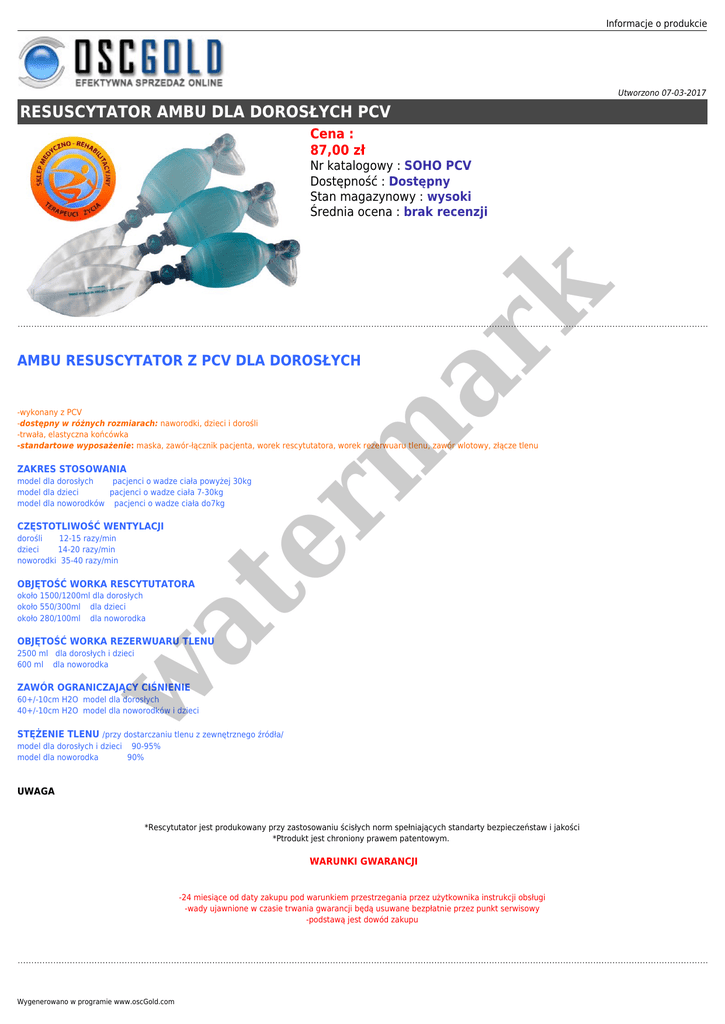 Informacje o produkcie Utworzono 07-03-2017 RESUSCYTATOR AMBU DLA DOROSŁYCH PCV Cena : 87,00 zł er m ar k Nr katalogowy : SOHO PCV Dostępność : Dostępny Stan magazynowy : wysoki Średnia ocena : brak recenzji AMBU RESUSCYTATOR Z PCV DLA DOROSŁYCH -wykonany z PCV -dostępny w różnych rozmiarach: naworodki, dzieci i dorośli -trwała, elastyczna końcówka -standartowe wyposażenie: maska, zawór-łącznik pacjenta, worek rescytutatora, worek rezerwuaru tlenu, zawór wlotowy, złącze tlenu ZAKRES STOSOWANIA model dla dorosłych pacjenci o wadze ciała powyżej 30kg model dla dzieci pacjenci o wadze ciała 7-30kg model dla noworodków pacjenci o wadze ciała do7kg CZĘSTOTLIWOŚĆ WENTYLACJI dorośli 12-15 razy/min dzieci 14-20 razy/min noworodki 35-40 razy/min at OBJĘTOŚĆ WORKA RESCYTUTATORA około 1500/1200ml dla dorosłych około 550/300ml dla dzieci około 280/100ml dla noworodka OBJĘTOŚĆ WORKA REZERWUARU TLENU w 2500 ml dla dorosłych i dzieci 600 ml dla noworodka ZAWÓR OGRANICZAJĄCY CIŚNIENIE 60+/-10cm H2O model dla dorosłych 40+/-10cm H2O model dla noworodków i dzieci STĘŻENIE TLENU /przy dostarczaniu tlenu z zewnętrznego źródła/ model dla dorosłych i dzieci 90-95% model dla noworodka 90% UWAGA *Rescytutator jest produkowany przy zastosowaniu ścisłych norm spełniających standarty bezpieczeństaw i jakości *Ptrodukt jest chroniony prawem patentowym. WARUNKI GWARANCJI -24 miesiące od daty zakupu pod warunkiem przestrzegania przez użytkownika instrukcji obsługi -wady ujawnione w czasie trwania gwarancji będą usuwane bezpłatnie przez punkt serwisowy -podstawą jest dowód zakupu Wygenerowano w programie www.oscGold.com