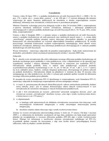 Uzasadnienie Ustawa z dnia 26 lipca 1991 r. o podatku dochodowym od osób fizycznych (Dz.U. z 2000 r. Nr 14, poz. 176, z późn. zm.) - zwana dalej „ustawą” - w art. 45b pkt 1 i 5 zawiera delegację dla ministra właściwego do spraw finansów publicznych do określenia w drodze rozporządzenia wzorów deklaracji, informacji oraz oświadczeń, o których mowa w powołanym przepisie. Minister Finansów wykonując powyższą delegację wydał w dniu 24 kwietnia 2008 r. rozporządzenie w sprawie określenia niektórych wzorów oświadczeń, deklaracji i informacji podatkowych obowiązujących w zakresie podatku dochodowego od osób fizycznych (Dz.U. Nr 74, poz. 445), zwane dalej „rozporządzeniem”. Ustawa z dnia 6 listopada 2008 r. o zmianie ustawy o podatku dochodowym od osób fizycznych, ustawy o podatku dochodowym od osób prawnych oraz niektórych innych ustaw (…), zwana dalej „nowelizacją” zmieniła niektóre przepisy ustawy dotyczące obowiązków płatnika, co powoduje konieczność ich odzwierciedlenia we wzorach odpowiednich formularzy podatkowych. W świetle powyższego, zaistniała konieczność wydania rozporządzenia zmieniającego, które określi wzory niektórych oświadczeń, deklaracji oraz informacji podatkowych obowiązujących w zakresie podatku dochodowego od osób fizycznych. Wzory formularzy - stanowiące załączniki do projektu rozporządzenia - będą miały zastosowanie do dochodów, przychodów (strat) uzyskanych (poniesionych) od dnia 1 stycznia 2009 roku. Załącznik: Nr 1 - określa wzór oświadczenia dla celów dokonania rocznego obliczenia podatku dochodowego od dochodu uzyskanego przez podatnika w roku podatkowym, wraz z objaśnieniami co do sposobu jego wypełnienia, terminu i miejsca składania. Oświadczenie to oznaczone jest symbolem PIT-12. Oświadczenie składa podatnik, który w trakcie roku podatkowego uzyskiwał dochody za pośrednictwem płatnika wymienionego w art. 31, art. 33 lub art. 35 ust. 1 pkt 1, 2, 4 i 7 ustawy (tj. m.in. zakładów pracy, banków, centrum integracji społecznej), obowiązanego do poboru zaliczek na podatek dochodowy. Oświadczenie składa się płatnikowi w terminie do dnia 10 stycznia roku następującego po roku podatkowym, ale tylko w sytuacji gdy podatnik spełnia warunki do dokonania rocznego obliczenia podatku przez płatnika. W stosunku do wzoru oświadczenia PIT-12 określonego w rozporządzeniu, wzór formularza PIT-12, stanowiący załącznik do niniejszego rozporządzenia zawiera następujące zmiany: 1) w części A, przeznaczonej dla danych identyfikacyjnych i adresu zamieszkania podatnika, dodano nową rubrykę „kraj”; jest to zmiana dostosowująca zakres danych wykazywanych w tym oświadczeniu do zawartości istniejącej w innych formularzach podatkowych; 2) w pkt 1 lit.b oświadczenia po wyrazie „zdrowotne” przecinek zastąpiono słowem „oraz”, jak również po wyrazie „oświadczenia” skreślono wyrazy „oraz ulgi z tytułu wychowywania dzieci, o której mowa w art. 27f ustawy”; 3) w objaśnieniach: a) w katalogu osób uprawnionych do składania oświadczenia rozszerzono tiret dotyczący osób otrzymujących świadczenie integracyjne o osoby otrzymujące motywacyjną premię integracyjną, b) skreślono ostatnie zdanie dotyczące ulgi z tytułu wychowywania dzieci. Zmiany we wzorze oświadczenia odzwierciedlają zmiany w treści art. 37 ustawy. Od dnia 1 stycznia 2009 r., w odniesieniu do dochodów uzyskanych od tego dnia, podatnicy nie będą mogli upoważnić płatnika do uwzględnienia w rocznym obliczeniu podatku (PIT-40) ulgi z tytułu wychowywania dzieci. Dlatego też informacja o możliwości złożenia oświadczenia (odrębnego od PIT-12), że podatnik spełnia warunki do korzystania z ulgi oraz liczbie dzieci i przysługującej kwocie odliczenia, stała się zbędna i została skreślona. 1 Nr 2 - określa wzór deklaracji rocznej o pobranych zaliczkach na podatek dochodowy, wraz z objaśnieniami co do sposobu prawidłowego jej wypełnienia, terminu i miejsca składania. Deklaracja ta oznaczona jest symbolem PIT-4R. Do jej sporządzania obowiązani są płatnicy wymienieni w: 1) art. 31, art. 33-35 ustawy, tj. np. zakłady pracy, rolnicze spółdzielnie produkcyjne oraz inne spółdzielnie zajmujące się produkcją rolną, organy rentowe, banki, areszty śledcze i zakłady karne, oddziały Wojskowej Agencji Mieszkaniowej, centra integracji społecznej, od należności z tytułu stosunku służbowego, stosunku pracy, pracy nakładczej lub spółdzielczego stosunku pracy, zasiłków pieniężnych z ubezpieczenia społecznego, stypendiów, emerytur i rent, świadczeń integracyjnych; 2) art. 41 ustawy, tj. osoby fizyczne prowadzące działalność gospodarczą, osoby prawne i ich jednostki organizacyjne oraz jednostki organizacyjne niemające osobowości prawnej, które dokonują świadczeń osobom określonym w art. 3 ust. 1 ustawy (tj. podlegającym w Polsce nieograniczonemu obowiązkowi podatkowemu), z tytułu działalności określonej w art. 13 pkt 2 i 49 oraz art. 18 ustawy; 3) art. 42e ustawy, tj. komornicy sądowi lub podmioty niebędące następcami prawnymi zakładów pracy, przejmujący zobowiązania zakładów pracy ze stosunku służbowego, stosunku pracy, pracy nakładczej oraz spółdzielczego stosunku pracy; 4) art. 35a ustawy, w brzmieniu obowiązującym przed dniem 26 października 2007 r., tj. osoby prowadzące gospodarstwo domowe, które zawarły umowę aktywizacyjną, na podstawie przepisów o promocji zatrudnienia i instytucjach rynku pracy, w brzmieniu obowiązującym przed dniem 26 października 2007 r., od należności wynikającej z umowy aktywizacyjnej, do końca obowiązywania tej umowy. Deklarację składa się do końca stycznia roku następującego po roku podatkowym. Jednakże płatnicy, o których mowa w art. 31, art. 33-35, art. 41 oraz art. 42e ustawy, którzy zaprzestali działalności przed tym terminem – składają deklarac