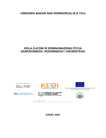 OŚRODEK BADAŃ NAD RÓWNOŚCIĄ (K.E.TH.I) ROLA OJCÓW W RÓWNOWAŻENIU ŻYCIA ZAWODOWEGO, RODZINNEGO I OSOBISTEGO The program is co-funded by the European Commission and the General Secretariat for Gender Equality ATENY 2007 ROLA OJCÓW W RÓWNOWAŻENIU ŻYCIA ZAWODOWEGO, RODZINNEGO I OSOBISTEGO Nadzór naukowy: Aleksandra Koroneou, Profesor Socjologii Uniwersytet Nauk Społecznych i Politycznych „Panteios” Grupa badawcza: Haris Prepoudis, Joanna Siotou, Anna Tiktapanidou Opracowanie statystyczne: Agapi Skantzi, Eleni Papadimitriou Tłumaczenie z j.greckiego: Justyna Słowik «Equal Partners: Reconsidering the Role of Men in Work and Private Life», within the scope of the fifth medium-term Community Action Plan of the European Commission for Gender Equality. Co-funded by the European Commission (80%) and the General Secretariat for Gender Equality (20%). The content of the present publication does not necessarily reflect the opinion or position of the European Commission. The European Commission accepts no responsibility or liability whatsoever for the use of information contained in the present publication. 1 SPIS TREŚCI PROLOG Sekretarz Generalnj ds. Rownosci p. Eugenii Tsoumani 9 PROLOG Prezes osrodka nad Rownoscia K.E.T.H.I. p. Meropi Kaldi 10 WSTĘP 13 CZĘŚĆ I 17 ROZDZIAŁ 1. TEORETYCZNE RAMY BADANIA 17 1.1. Znaczenie terminu ojcostwa 19 1.2. Równe role rodziców i wychowanie dzieci 20 1.3. Negatywne skutki «nieobecności» ojca 21 1.4. Szeroka płaszczyzna europejska 21 1.5. Płaszczyzna grecka 23 ROZDZIAŁ 2. RAMY PRAWNE 25 2.1. Krótki rys historyczny 25 2.2. Regulacje prawne na rzecz pogodzenia rodziny z pracą 26 2.2.1. Zarządzanie czasem pracy i społeczna organizacja czasu 26 2.2.2. Ramy prawne urlopów dla rodziców 26 2.2.2.1 Urlop z powodu choroby członka rodziny 26 2.2.2.2 Urlop szkolny 27 2.2.2.3 Urlop dla rodzica samotnie wychowującego dziecko 28 2.2.2.4 Urlop połogowy / macierzyński 29 2.2.2.5 Rodzicielski urlop wychowawczy 29 2.2.2.6 Urlop z powodu karmienia lub opieki nad dzieckiem dla ojców 29 2.2.2.7 Urlop ojcowski 2.2.2.8 Urlop z powodu narodzin dziecka dla ojca 30 2.2.2.9 Planowanie urlopów 30 30 2.3. Najnowsze regulacje 31 2.4. Ostatnie postanowienia 32 CZĘŚĆ II 39 ROZDZIAŁ 1. PRZEDMIOT BADANIA 39 ROZDZIAŁ 2. METODOLOGIA BADANIA 41 2.1. Narzędzia badawcze 41 2.2. Procedura zbierania danych 42 2.3. Opracowanie i analiza danych 42 2 2.4. Próba badawcza 43 2.5. Ograniczenia badania 57 ROZDZIAŁ 3. PREZENTACJA WYNIKÓW BADANIA 58 3.1. Udział mężczyzn w pracach domowych i w wychowaniu dzieci 58 3.2. Podejmowanie określonych obowiązków związanych z opieką nad dziećmi 61 3.3. Zderzenie roli zawodowej i ojcowskiej 63 3.4. Wykorzystanie rodzinnego czasu wolnego: Źródła stresu i źródła przyjemności 65 3.4.1. Źródła stresu 65 3.4.2. Przyjemne chwile 66 3.5. Aktywność w osobistym czasie wolnym 68 3.6. Korzystanie z urlopów – Polityka korporacji 71 3.7. Nieobecność z przyczyn zawodowych 74 3.8. Główne przeszkody w większym poświęcaniu czasu rodzinie 76 3.9. Wizje ojcostwa i macierzyństwa 77 3.10. Kształtowanie się męskiej tożsamości 78 3.11. Porównanie z poprzednią generacją ojców 79 3.12. Wyniki stopniowanych odpowiedzi na pytania kwestionariusza 82 3.13. Sektor zatrudnienia jako czynnik zróżnicowania istotnego statystycznie 87 3.14. Miejsca zamieszkania statystycznie 91 jako czynnik zróżnicowania istotnego 3.15. Zawód jako czynnik zróżnicowania istotnego statystycznie 3.16. Poziom wykształcenia statystycznie jako czynnik zróżnicowania 94 istotnego 96 CZĘŚĆ III TENDENCJE I WĄTPLIWOŚCI. PRÓBY WNIOSKOWANIA 99 CZĘŚĆ IV PORÓWNAWCZY WYMIAR BADANIA 105 1. PREZENTACJA BADANIA W PORTUGALII 106 1.1. Wstęp – Cel badania 106 1.2. Obecna sytuacja 106 1.3. Metodologia badania 107 1.4. Czynniki utrudniające udział mężczyzn w zajęciach domowych i w opiece nad dziećmi 108 1.4.1. Zajęcia domowe 109 1.4.2. Czas wolny 109 3 1.4.3. Analiza terminów „ojcostwo i macierzyństwo” 110 1.4.4. Poczucie własnej wartości – Samookreślenie się mężczyzn jako ojców 111 2. PREZENTACJA BADANIA W POLSCE 112 2.1. Sposób przeprowadzenia badania 113 2.2. Charakterystyka respondentów 113 2.3. Wyniki badania 114 2.4. Analiza konkretnych przypadków 118 2.5. Wnioski 119 Odniesienia bibliograficzne badania w Grecji 121 Proponowana bibliografia 122 ANEKS 125 4