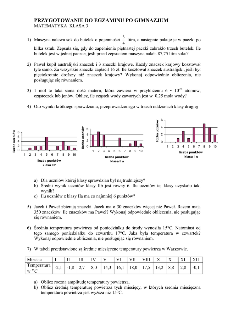 PRZYGOTOWANIE DO EGZAMINU PO GIMNAZJUM MATEMATYKA KLASA 3 3 litra, a następnie pakuje je w paczki po 4 kilka sztuk. Zepsuła się, gdy do zapełnienia piętnastej paczki zabrakło trzech butelek. Ile butelek jest w jednej paczce, jeśli przed zepsuciem maszyna nalała 87,75 litra soku? 1) Maszyna nalewa sok do butelek o pojemności 2) Paweł kupił australijski znaczek i 3 znaczki krajowe. Każdy znaczek krajowy kosztował tyle samo. Za wszystkie znaczki zapłacił 16 zł. Ile kosztował znaczek australijski, jeśli był pięciokrotnie droższy niż znaczek krajowy? Wykonaj odpowiednie obliczenia, nie posługując się równaniem. 3) 1 mol to taka sama ilość materii, która zawiera w przybliżeniu 6 • 10 23 atomów, cząsteczek lub jonów. Oblicz, ile cząstek wody zawartych jest w 0,25 mola wody? 8 6 4 2 0 liczba uczniów liczba uczniów liczba uczniów 4) Oto wyniki krótkiego sprawdzianu, przeprowadzonego w trzech oddziałach klasy drugiej 6 4 2 2 3 4 5 6 7 8 4 2 0 0 1 1 1 6 9 10 2 3 4 5 6 7 8 2 9 10 4 5 6 7 liczba punktów klasa II c liczba punktów klasa II a liczba punktów klasa II b 3 a) Dla uczniów której klasy sprawdzian był najtrudniejszy? b) Średni wynik uczniów klasy IIb jest równy 6. Ilu uczniów tej klasy uzyskało taki wynik? c) Ilu uczniów z klasy IIa ma co najmniej 6 punktów? 5) Jacek i Paweł zbierają znaczki. Jacek ma o 30 znaczków więcej niż Paweł. Razem mają 350 znaczków. Ile znaczków ma Paweł? Wykonaj odpowiednie obliczenia, nie posługując się równaniem. 6) Średnia temperatura powietrza od poniedziałku do środy wynosiła 15°C. Natomiast od tego samego poniedziałku do czwartku 17°C. Jaka była temperatura w czwartek? Wykonaj odpowiednie obliczenia, nie posługując się równaniem. 7) W tabeli przedstawione są średnie miesięczne temperatury powietrza w Warszawie. Miesiąc I Temperatura -2,1 w 0C II III IV V VI VII VIII IX X XI XII -1,8 2,7 8,0 14,3 16,1 18,0 17,5 13,2 8,8 2,8 -0,1 a) Oblicz roczną amplitudę temperatury powietrza. b) Oblicz średnią temperaturę powietrza tych miesięcy, w których średnia miesięczna temperatura powietrza jest wyższa niż 15°C. 8 9 10 8) Liściaste herbaty Yunan, Asam i Madras zmieszano w stosunku 1 : 2 : 5 i otrzymano 40g mieszanki herbacianej. Ile gramów herbaty Asam jest w tej mieszance? Wykonaj odpowiednie obliczenia, nie posługując się równaniem. 9) Adam i Jakub kopią rów długości 18 m. Adam samodzielnie wykopałby ten rów przez 12 godzin, a Jakub przez 15 godzin. Ile metrów rowu wykopią chłopcy przez godzinę? 10) Z miasta A do miasta B można dotrzeć droga lądową lub wodną. Autobus jadący ze średnią prędkością 57 km/h pokonuje tę trasę w czasie 1,5 h. Statek płynący ze średnią prędkością 36 km/h, wypływa z miasta A o 40 minut wcześniej niż odjeżdża 3 autobus, a przybywa do miasta B o godziny później niż autobus. O ile kilometrów 4 droga lądowa jest krótsza od wodnej? 11) W hotelu „Pod Włóczykijem” jest 150 miejsc hotelowych w pokojach jedno-, dwui trzyosobowych. Pokoi jednoosobowych jest 12, a stosunek liczby pokoi dwuosobowych do trzyosobowych wynosi 4 : 5 . Ile jest w tym hotelu pokoi dwuosobowych, a ile trzyosobowych? Wykonaj odpowiednie obliczenia, nie posługując się równaniem. 12) Struś ma masę 100 kg, a kura masę 1 kg. Korzystając z poniższej tabeli , oblicz różnicę mas ich jaj i wyraź ją w gramach. Masa ciała ptaka Masa jaja w procentach masy Czas inkubacji (dni) ciała dorosłego ptaka 10 g 20% 10 100 g 10% 16 1 kg 4% 21 10 kg 2% 39 100 kg 1% 68 13) Cenę wycieczki zwiększono o 8% i jeszcze 10 złotych. Oblicz cenę wycieczki przed podwyżką, jeżeli wiemy, że cena wzrosła o 26 zł. Wykonaj obliczenia nie posługując się równaniem. 14) Pan Jan wpłacił do banku 1200 zł. Oprocentowanie w tym banku jest równe 8% w stosunku rocznym. a) Ile wyniosą odsetki od tej kwoty po roku? b) Ile złotych pozostanie z nich panu Janowi, jeżeli od kwoty odsetek zostanie odprowadzony 20% podatek. Zapisz obliczenia. 15) Rozciągłość terytorium naszego kraju z południa na północ to w przybliżeniu 650 km, a z zachodu na wschód 690 km. O ile procent rozciągłość zachodnio-wschodnia jest większa od rozciągłości północno-południowej? 16) Rozwiąż poniższe zadania, udzielając odpowiedzi w języku polskim. Zapisz wykonane obliczenia. 2 of this used for 5 hectares is this? a) Farmer Richard owns 900 hectares of land. At the moment growing vegetables. How many b) Farmer Paddy down the road has a 1200 hectare farm, of witch 720 hectares are for vegetables. What fraction is this, in lowest term? c) Farmer Richard wants to increase his production of vegetables so that it uses the same fraction of his land as Farmer Paddy. How many more hectares must he turn over to vegetables? 17) Z miasta A do miasta B można dotrzeć droga lądową lub wodną. Autobus jadący ze średnią prędkością 57 km/h pokonuje te trasę w czasie 1,5 h. Statek płynący ze średnią prędkością 36 km/h, wypływa z miasta A o 40 minut wcześniej niż odjeżdża autobus, a przybywa 3 do miasta B o godziny później niż autobus. O ile kilometrów droga lądowa jest 4 krótsza od wodnej? 18) Na placu apelowym żołnierze ustawieni byli w czterdziestu dziewięciu szeregach, w każdym po stu sześćdziesięciu dziewięciu żołnierzy. Następnie ustawili się tak, że liczba szeregów była równa liczbie żołnierzy w każdym z nich. Oblicz ile było szeregów. 19) Z miasta A do miasta B można dotrzeć droga lądową lub wodną. Autobus jadący ze średnią prędkością 57 km/h pokonuje te trasę w czasie 1,5 h. Statek płynący ze średnią prędkością 36 km/h, wypływa z miasta A o 40 minut wcześniej niż odjeżdża 3 autobus, a przybywa do miasta B o godziny później niż autobus. O ile kilometrów 4 droga lądowa jest krótsza od wodnej? 20) Przyrodnicy muszą kupić 49 namiotów. Mają na ten cel 14000 zł. W sklepie znajdują s